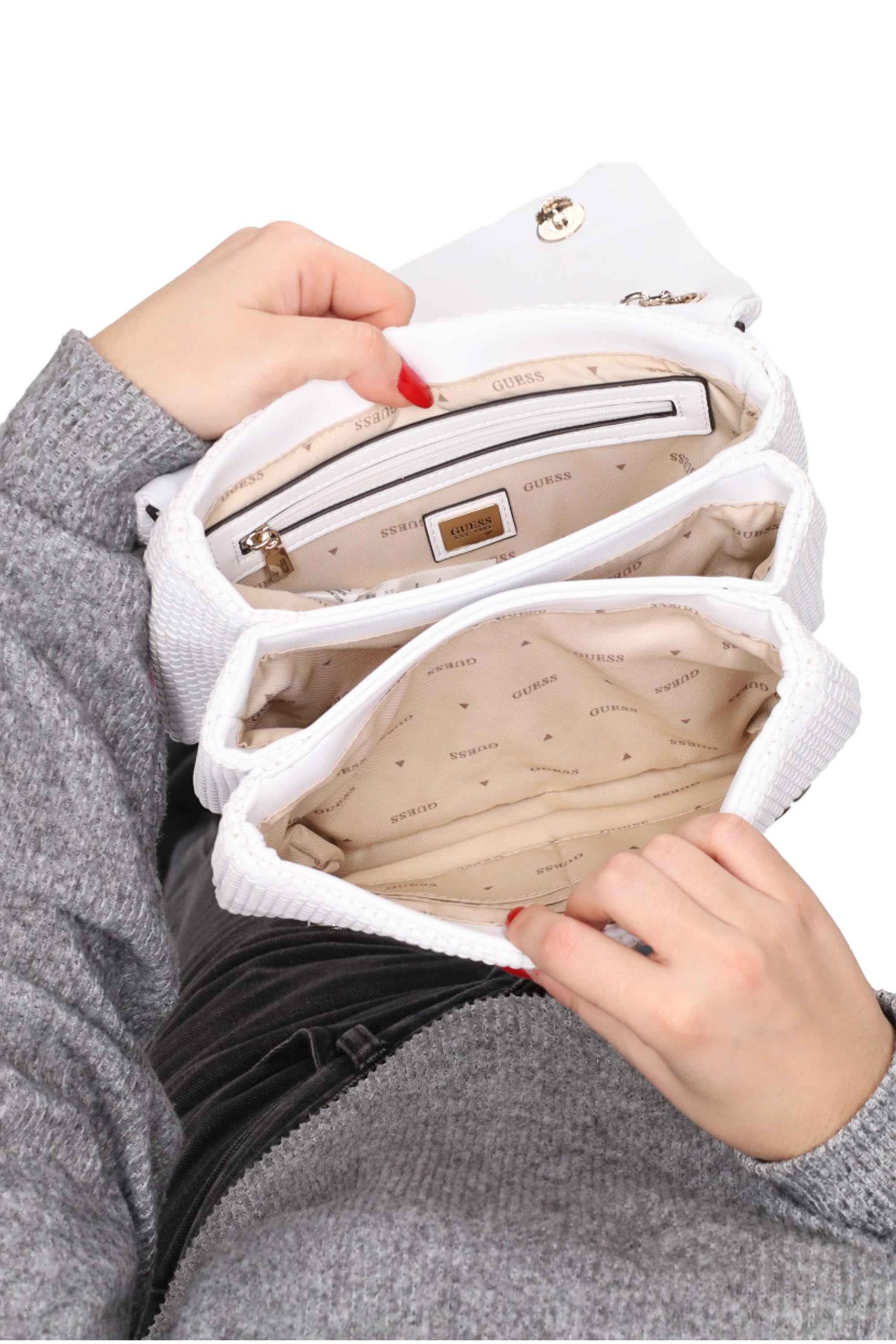 La borsa è realizzata in similpelle con motivo all over.