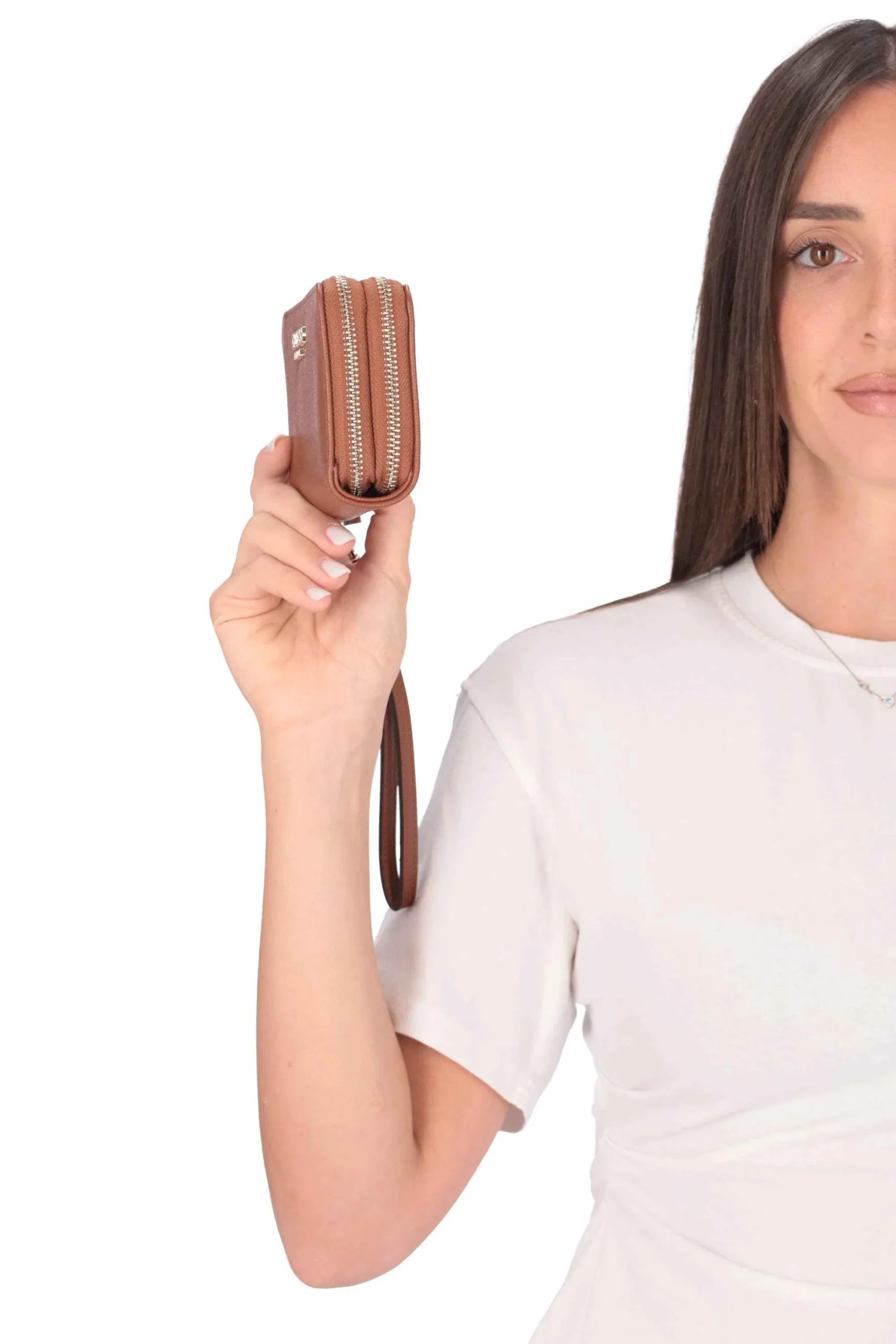 Il portafoglio è realizzato in poliuretano con logo in metallo sul davanti, manico rimovibile.