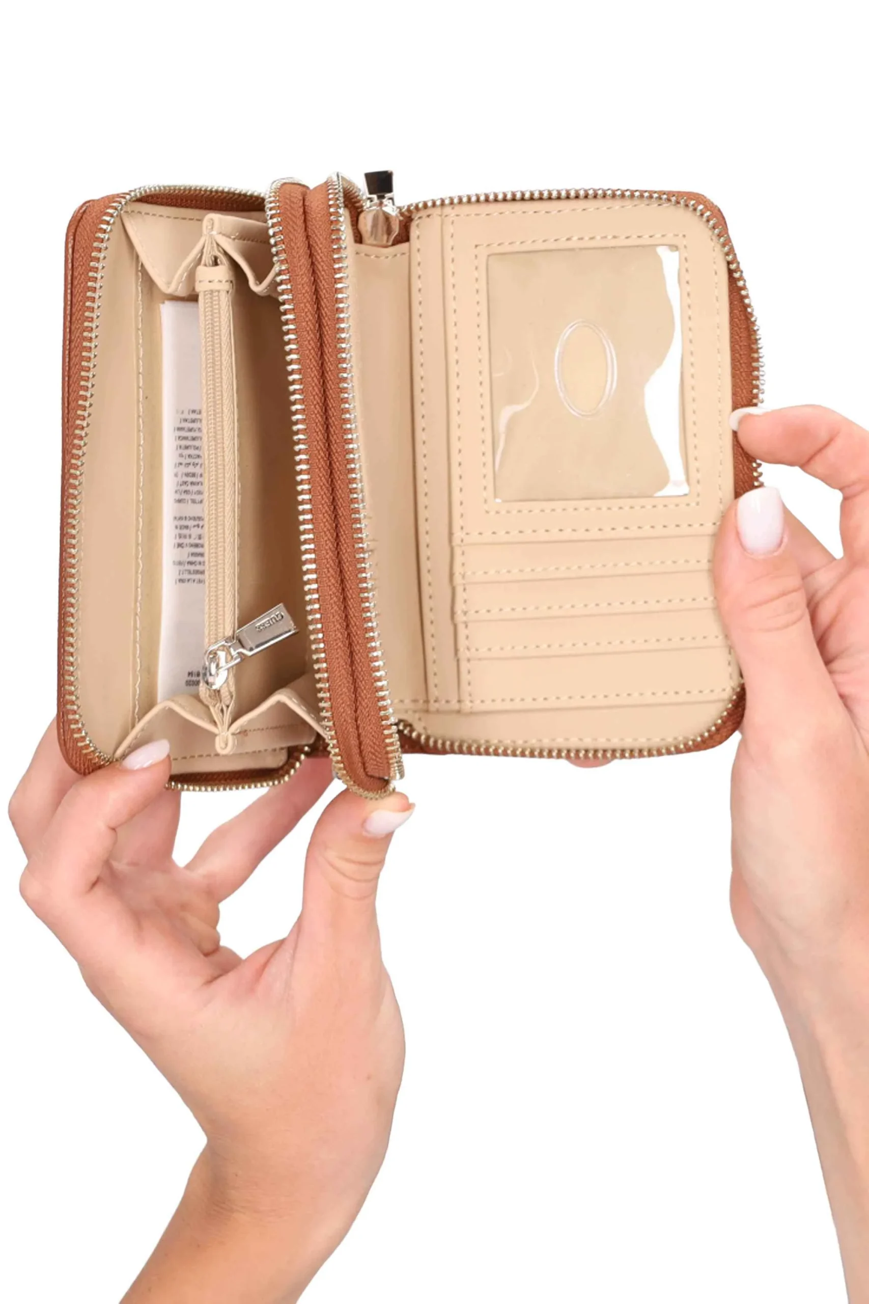 Presenta chiusura doppio scomparto, con tasche per carte di credito, documenti e per monete.