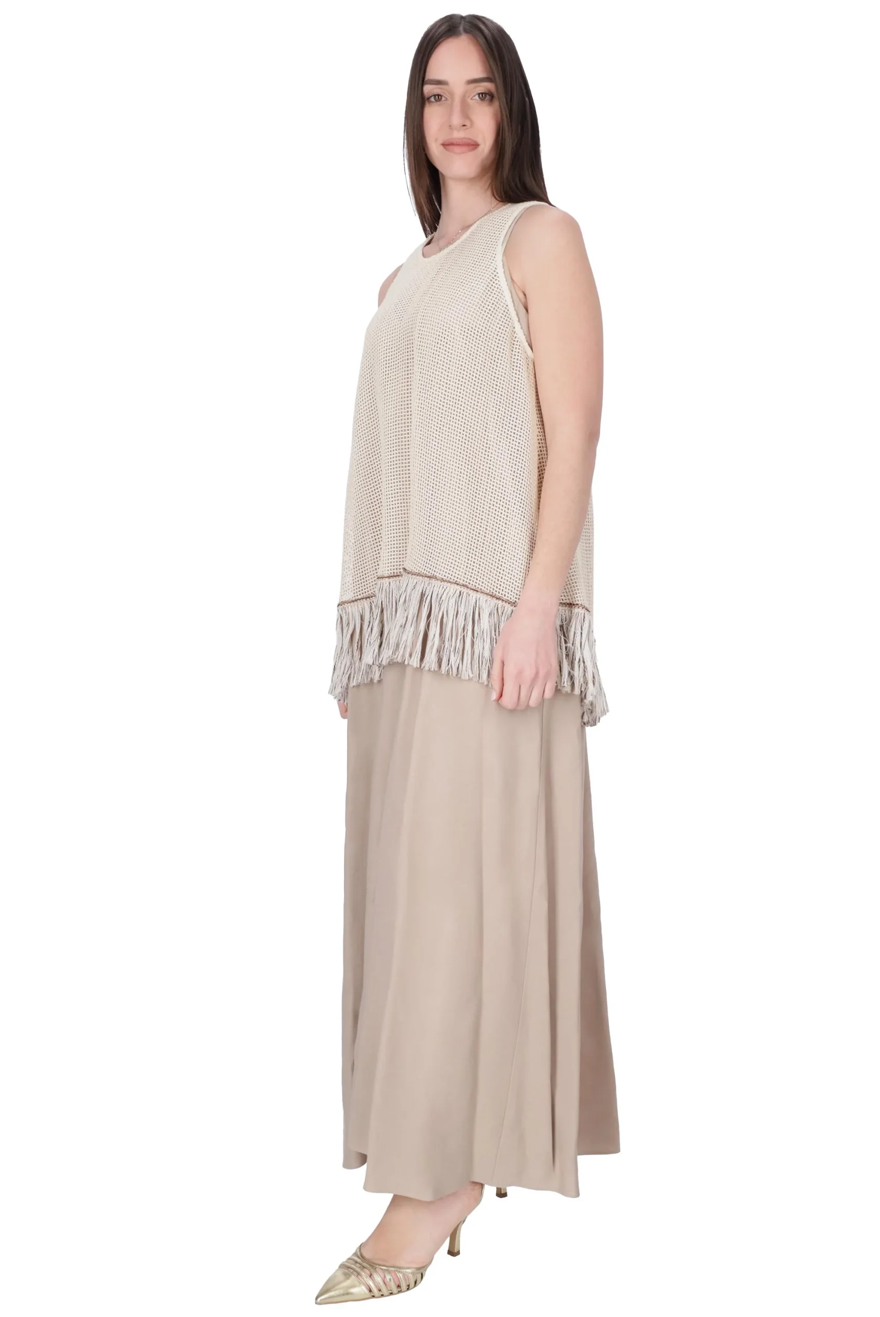 L’abito è realizzato in viscosa con canotta effetto juta rimovibile.