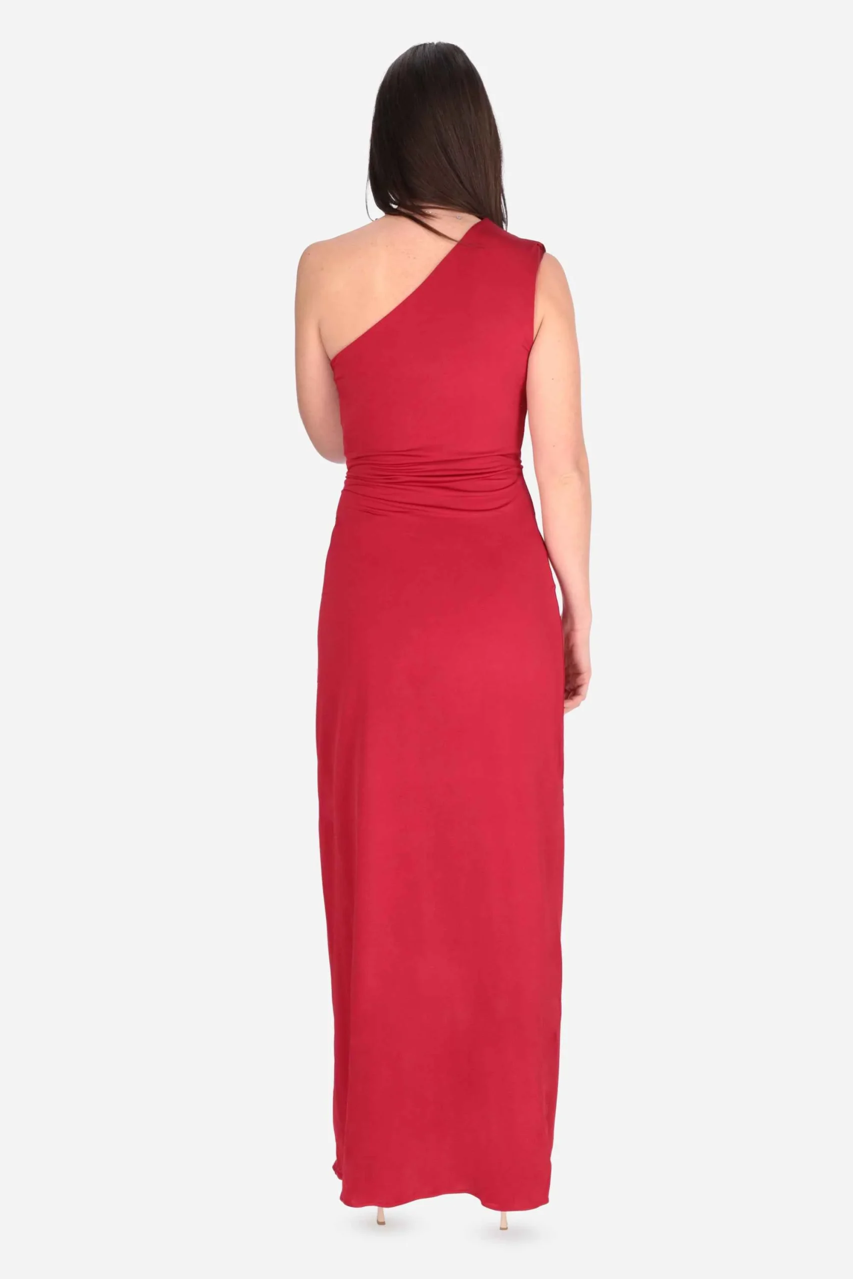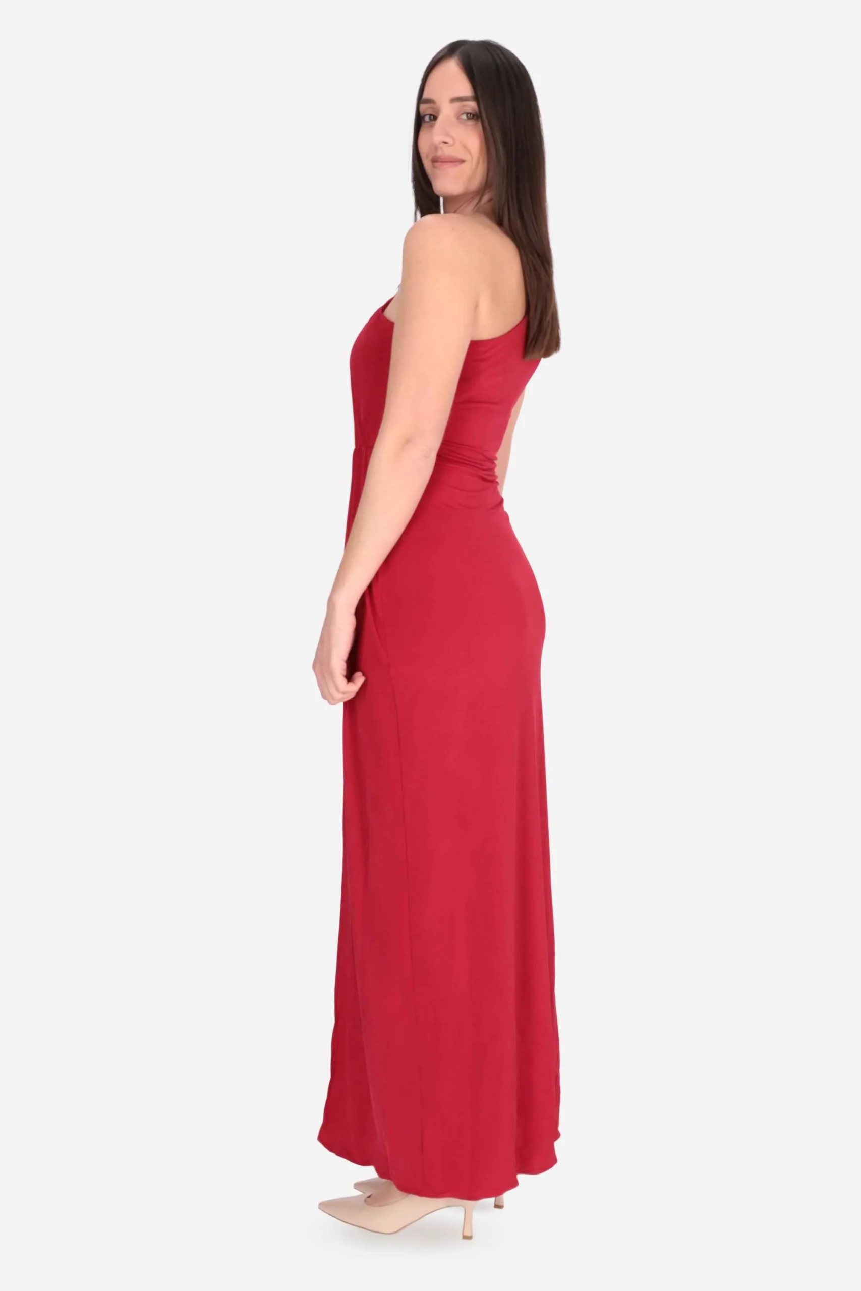 È un modello monospalla, profondo spacco laterale e drappeggio sulla vita.