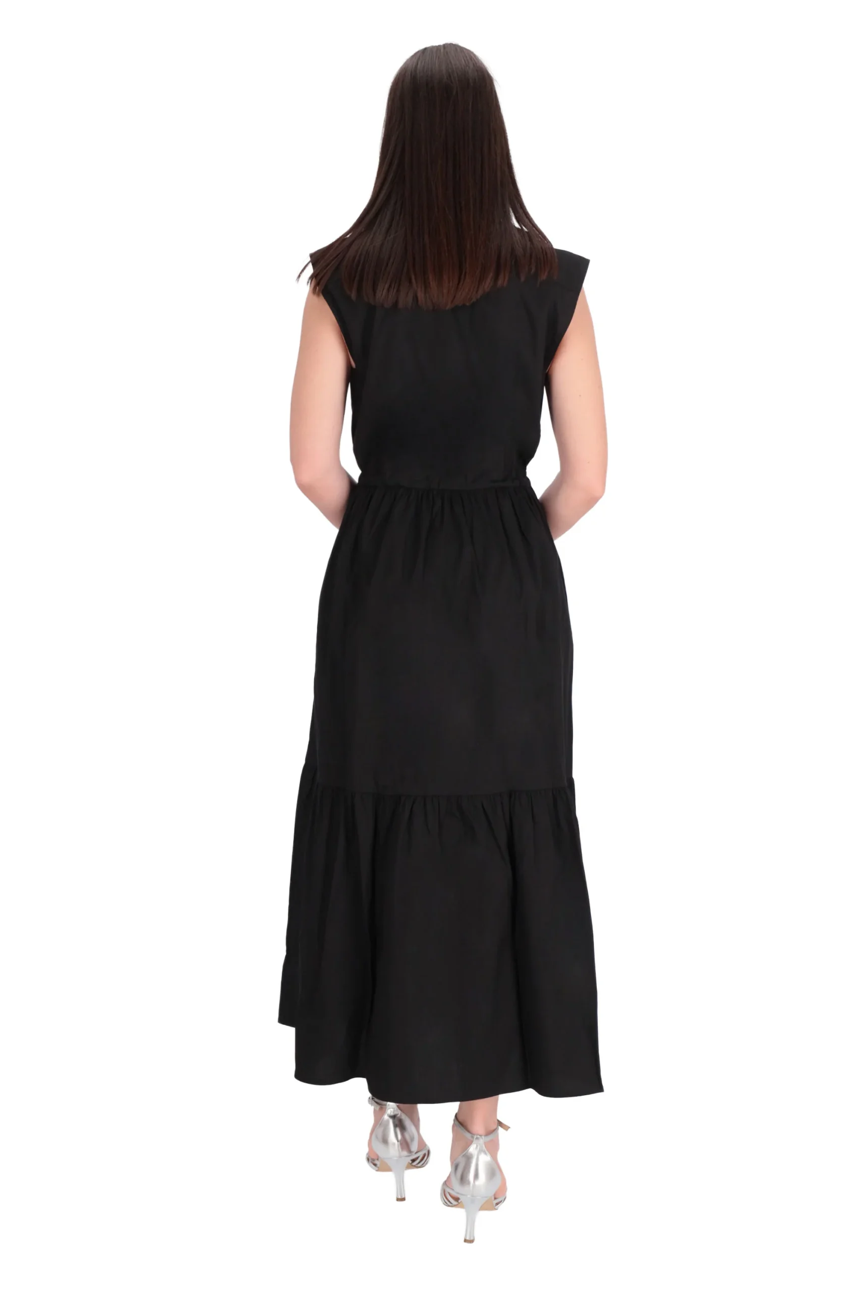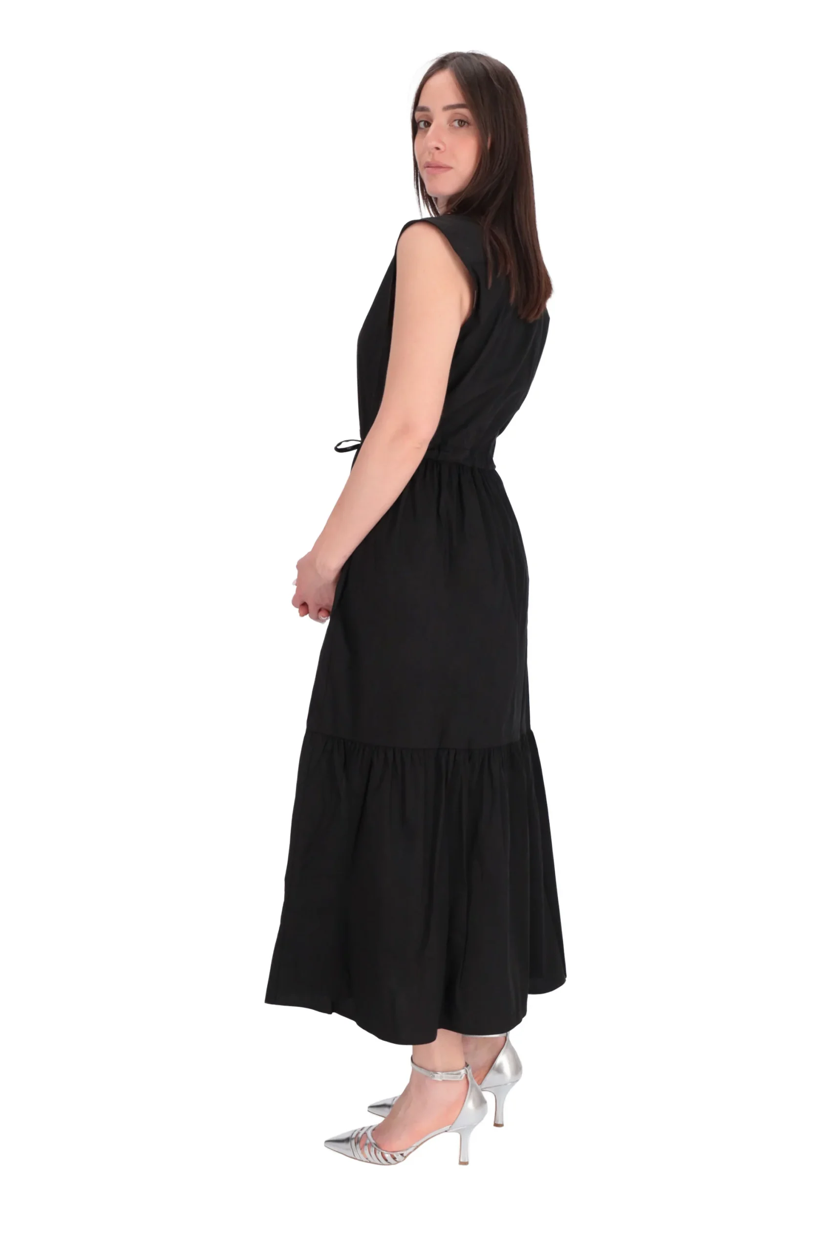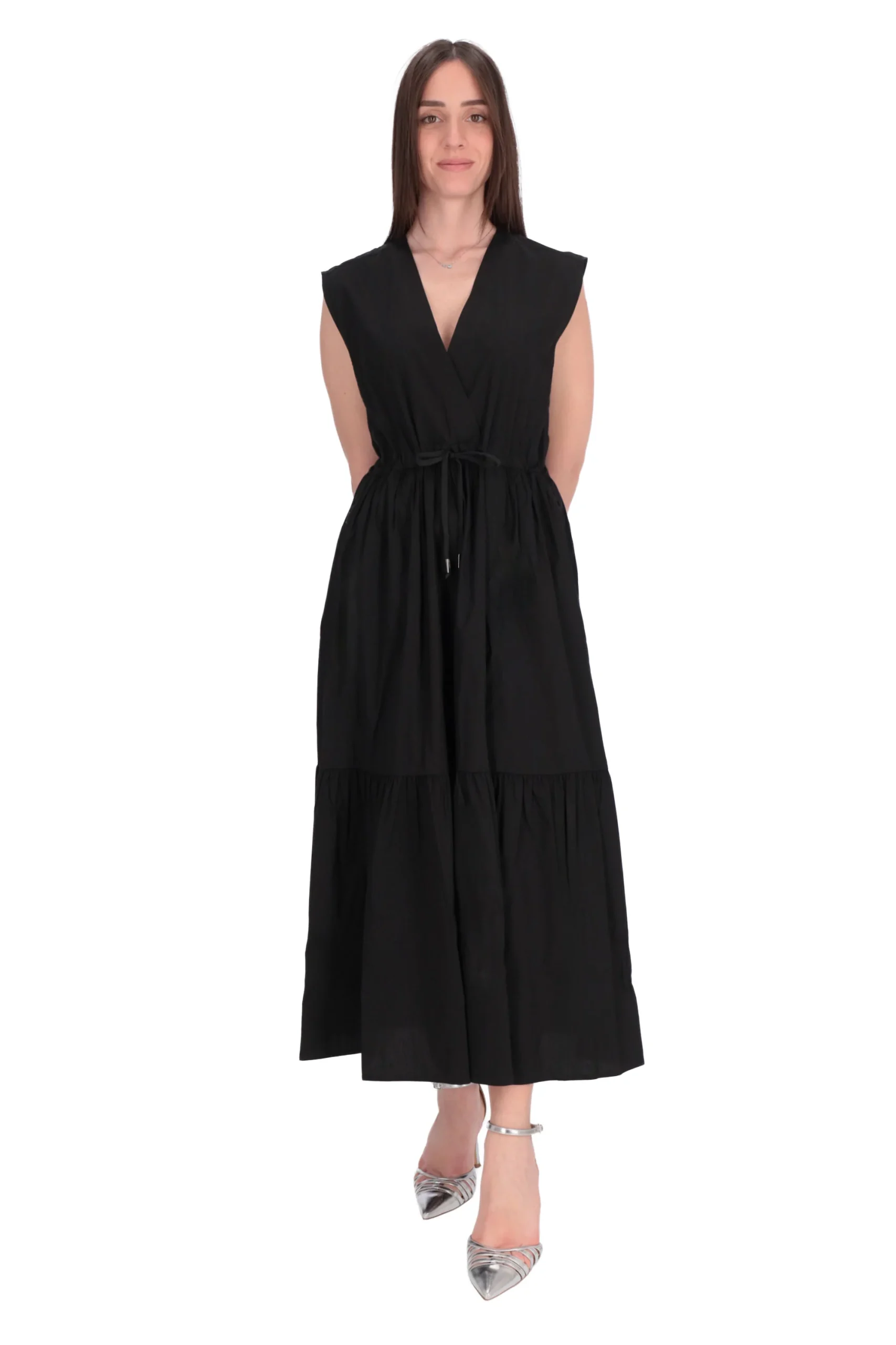 E’ un modello con spalline, scollatura a V, gonna a balze e coulisse in vita per enfatizzarlo.