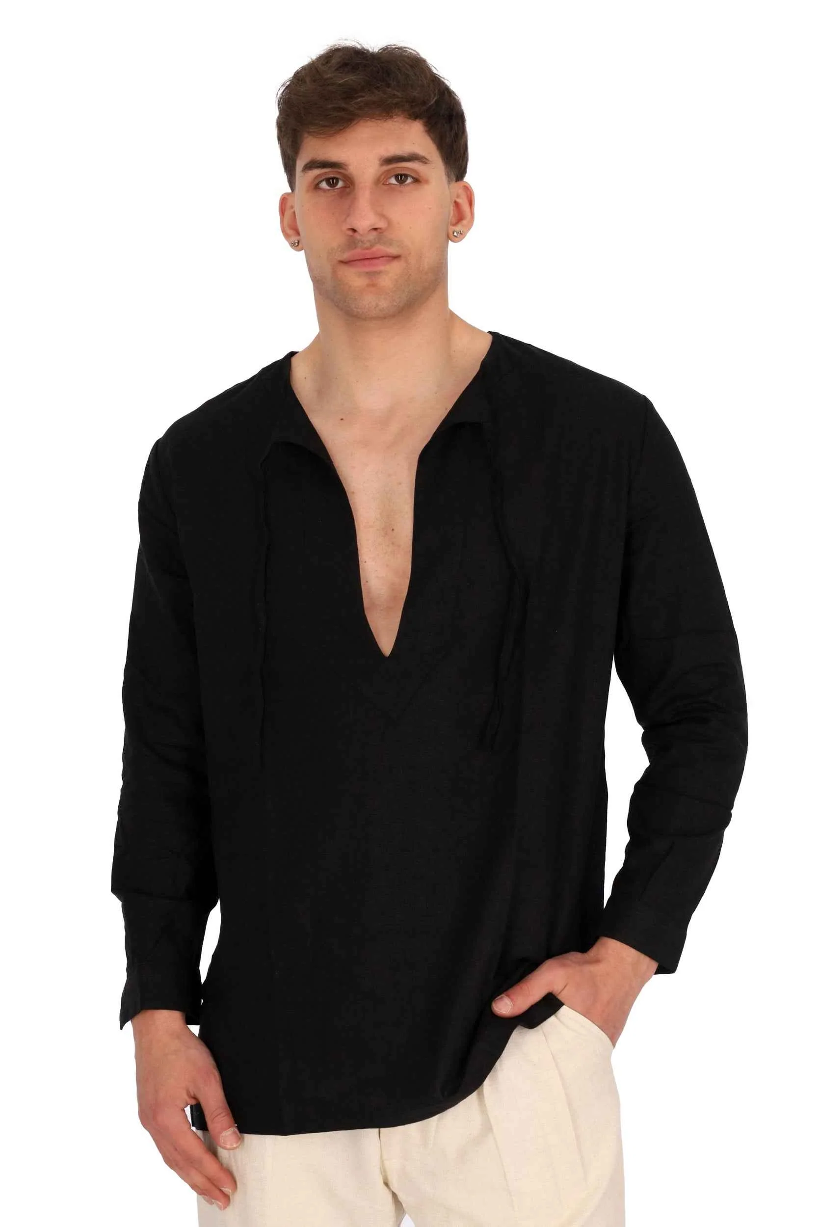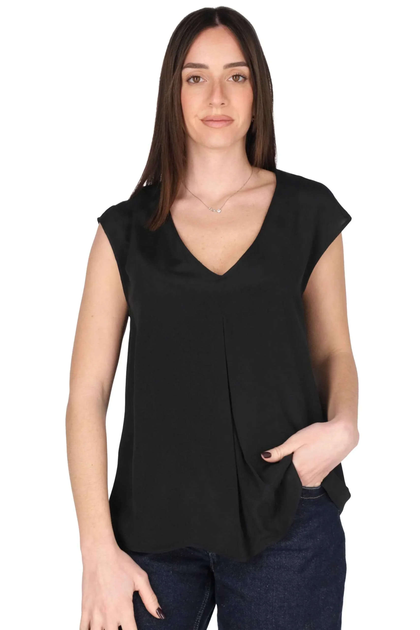 Presenta maniche corte e scollatura a V.