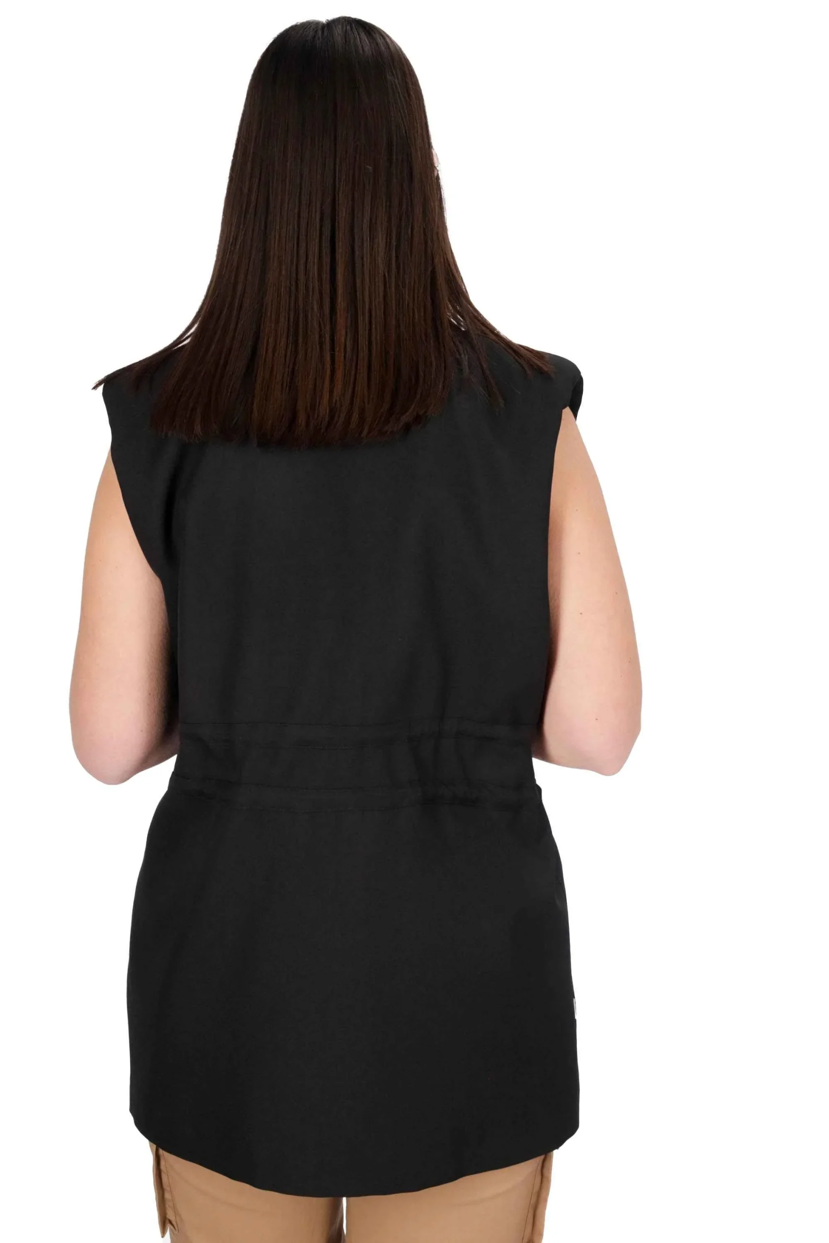 E’ un modello smanicato, con scollatura a V e revers a lancia, patte sui fianchi.