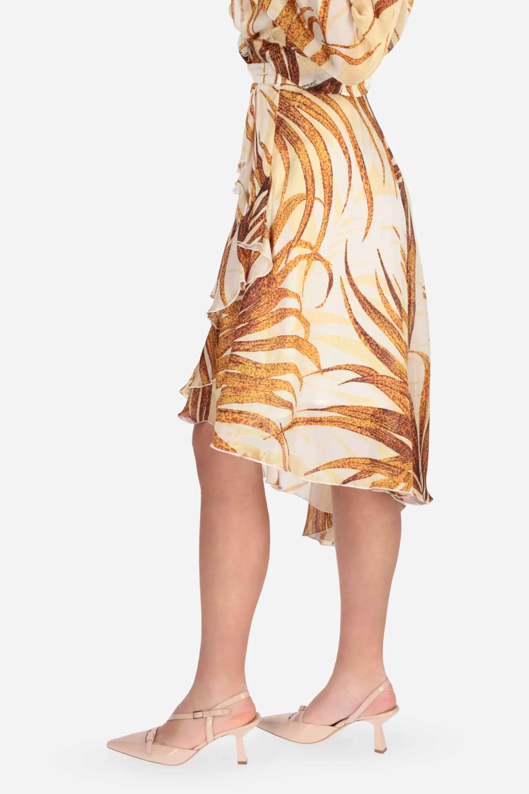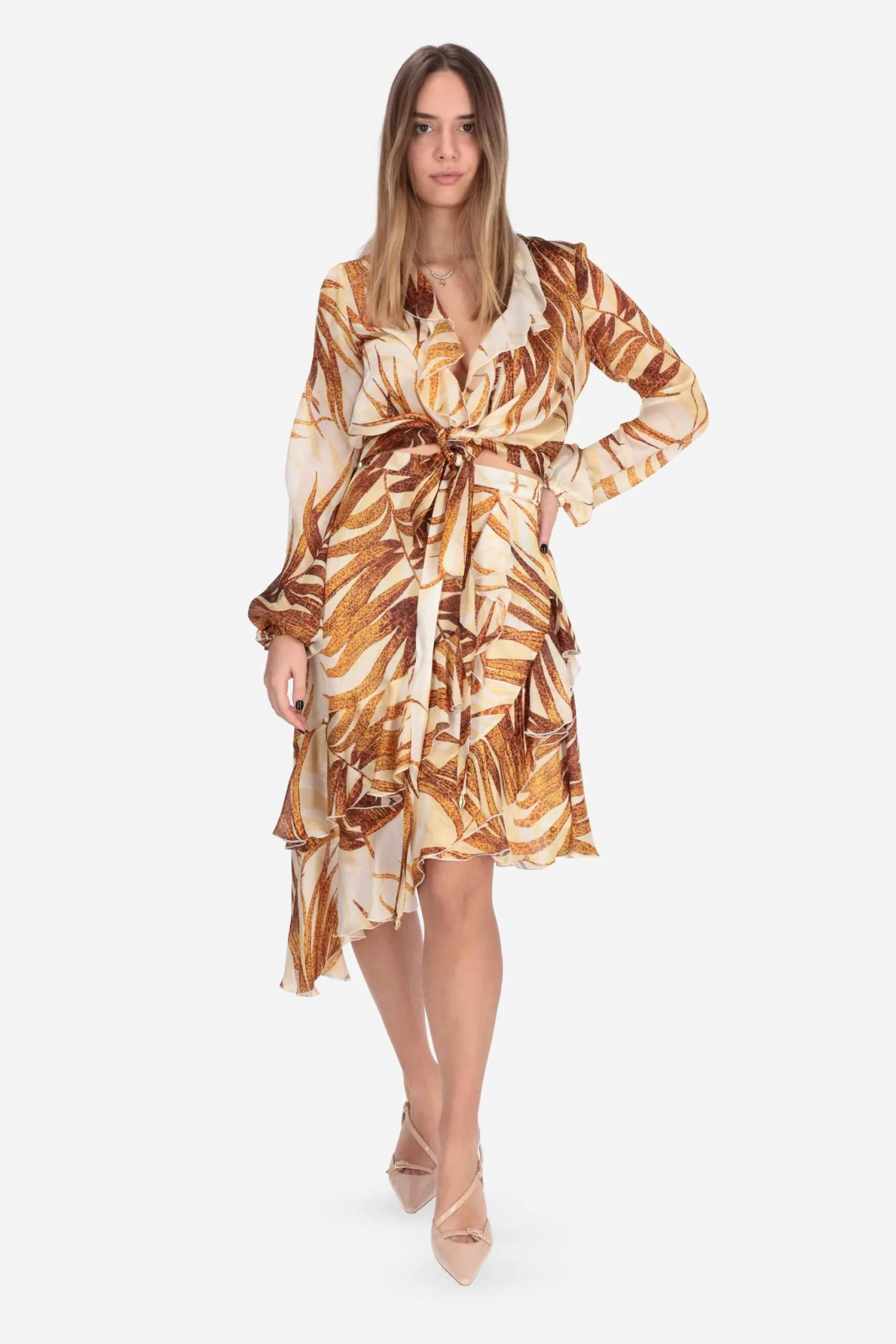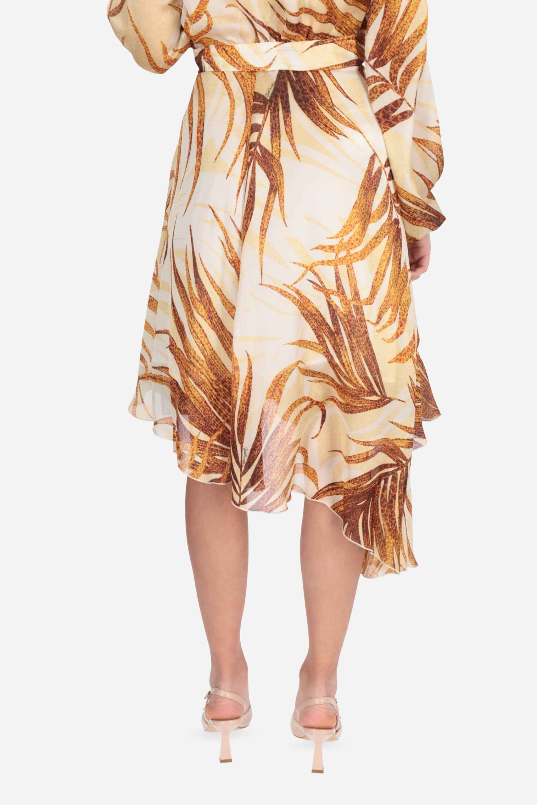 Presenta fascia in vita con placchetta in metallo con logo, taglio asimmetrico con balza laterale e chiusura con zip.