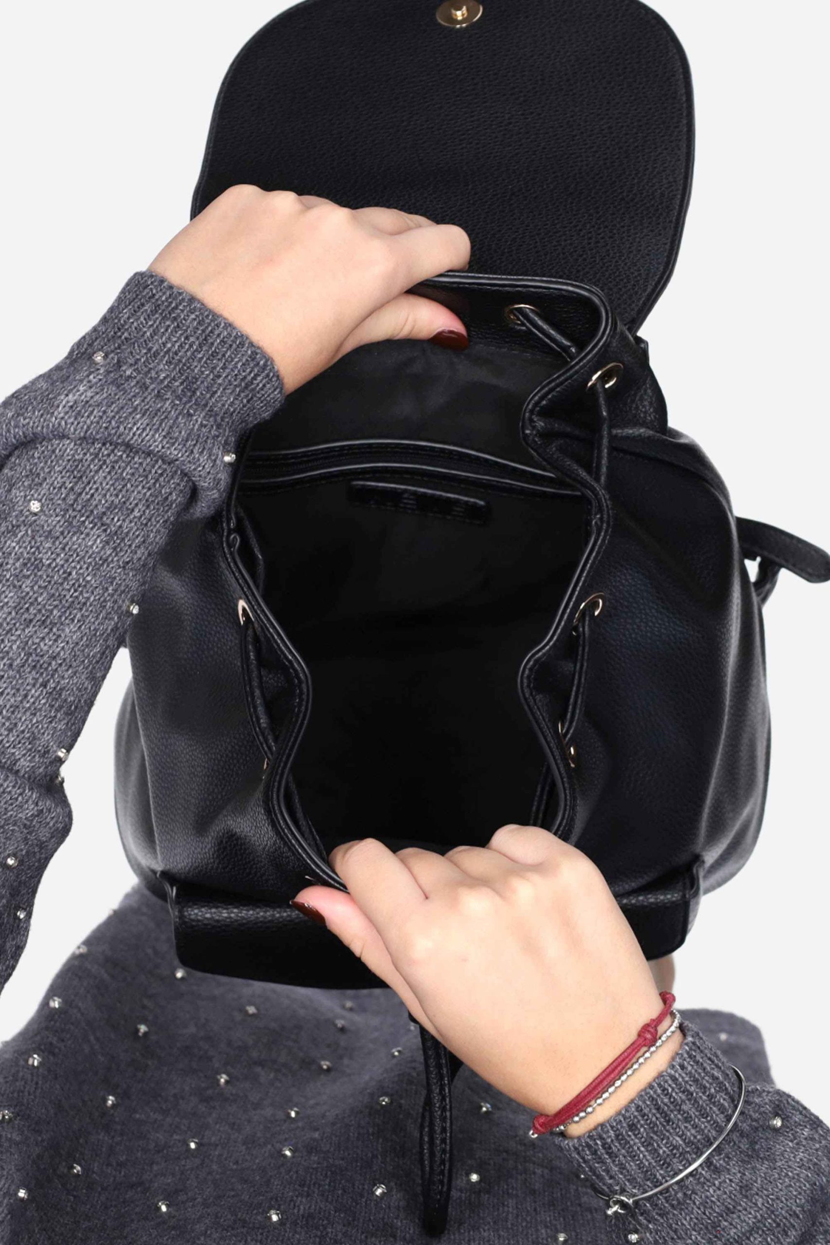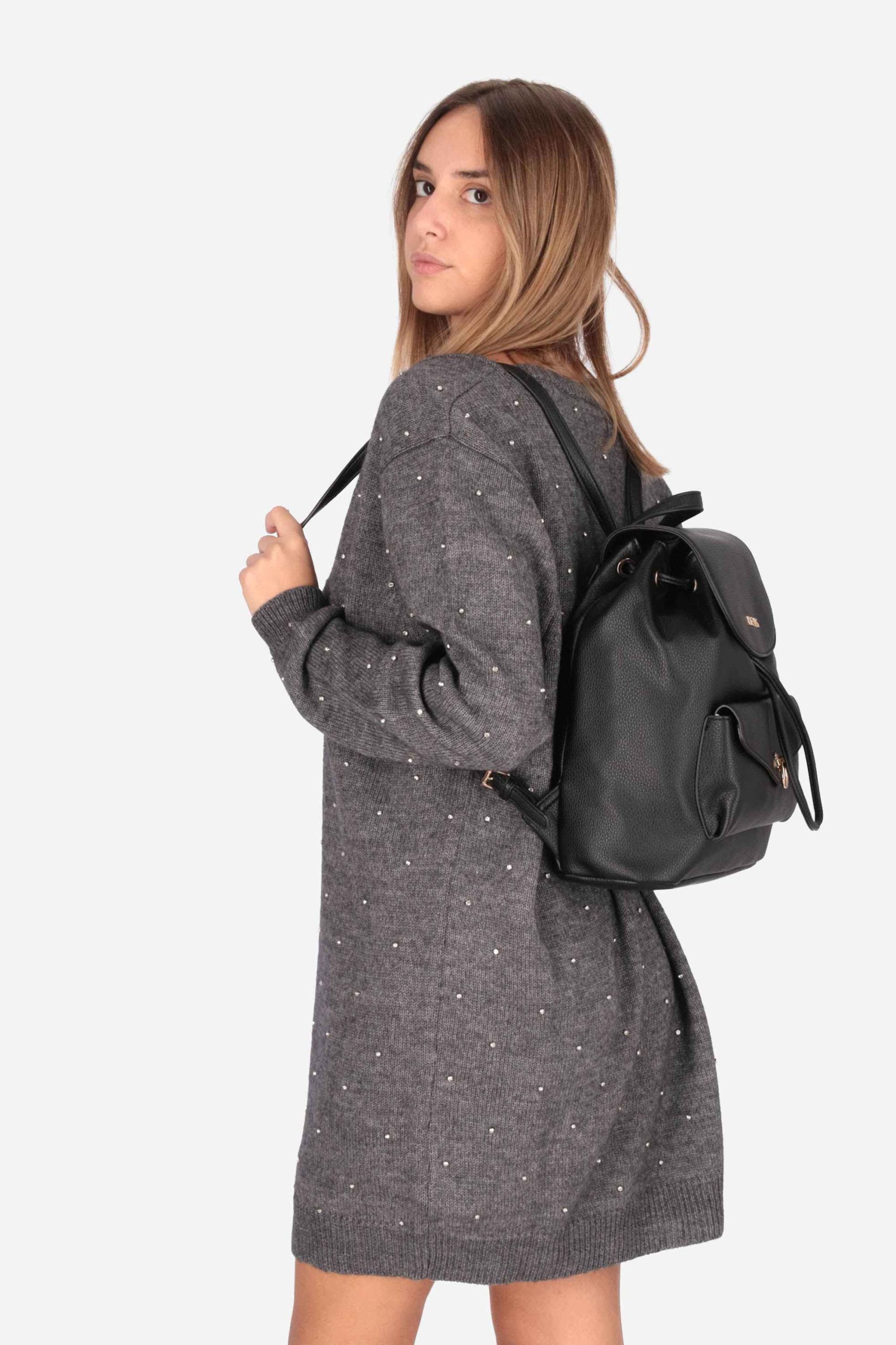 Presenta manico superiore, spallacci regolabili, chiusura a patta con bottone e coulisse, tasca esterna con patta.