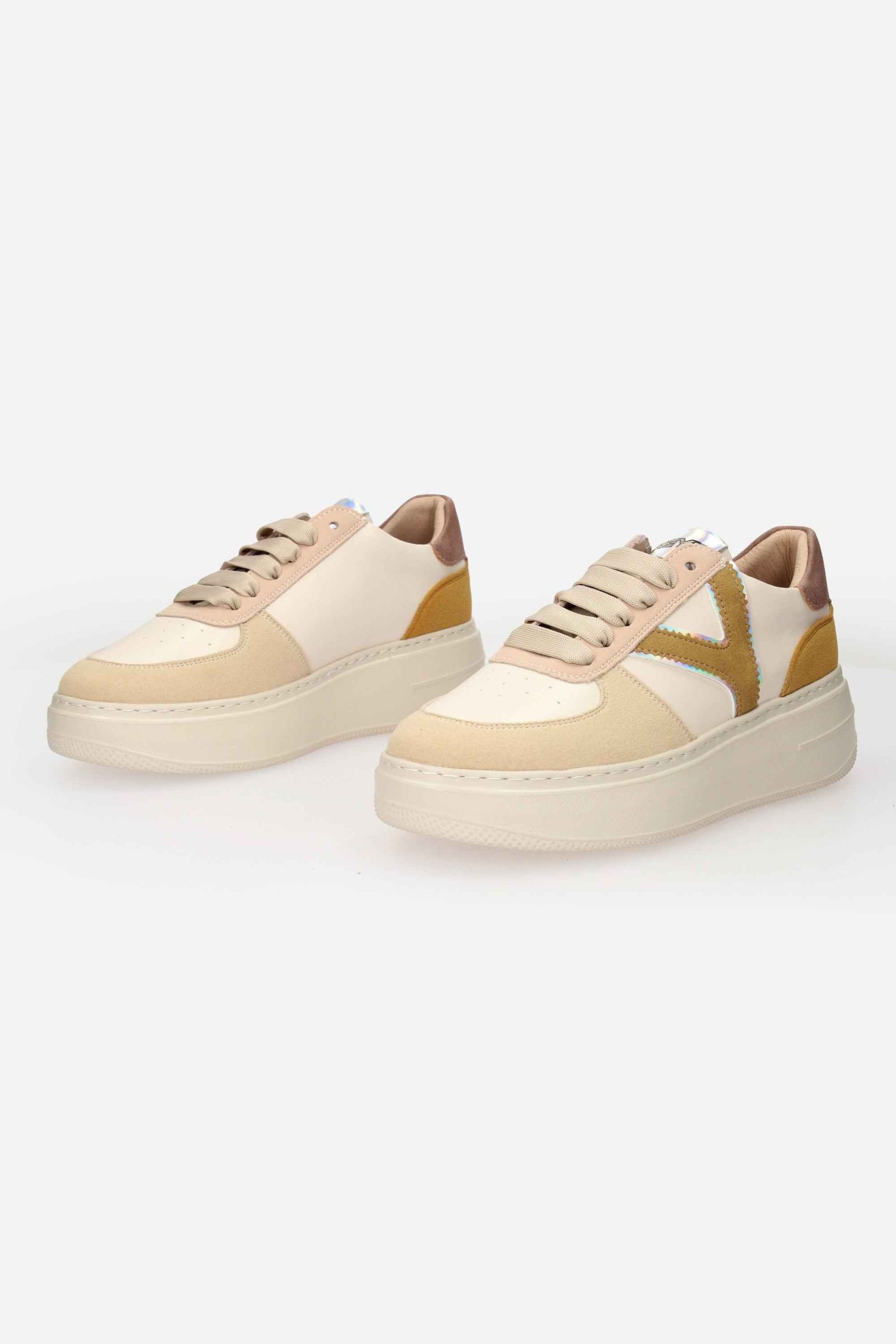 La sneakers è realizzata in ecocamoscio ed ecopelle.