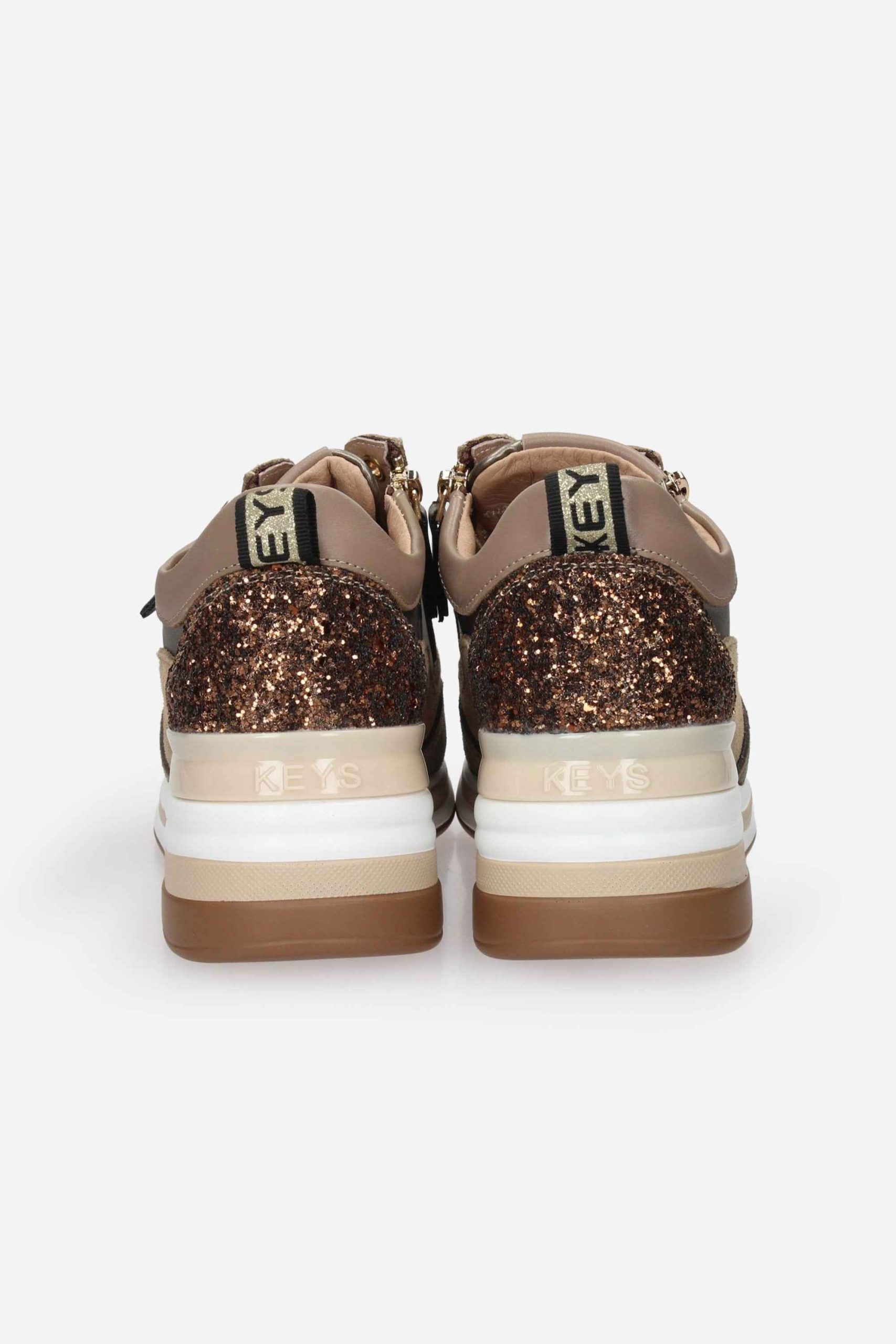 La sneakers è realizzata in camoscio e pelle laminata con dettagli in glitter sul retro.
