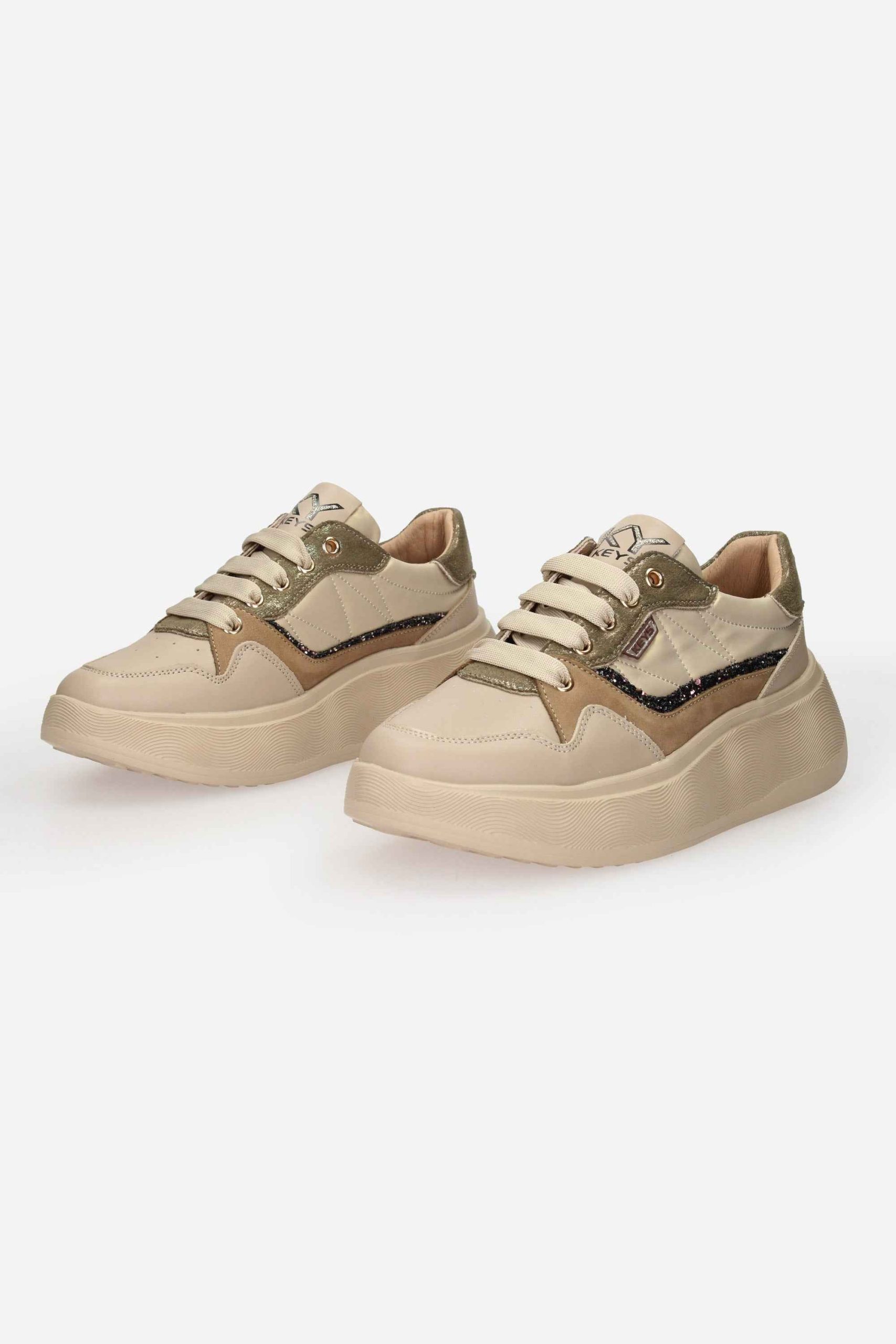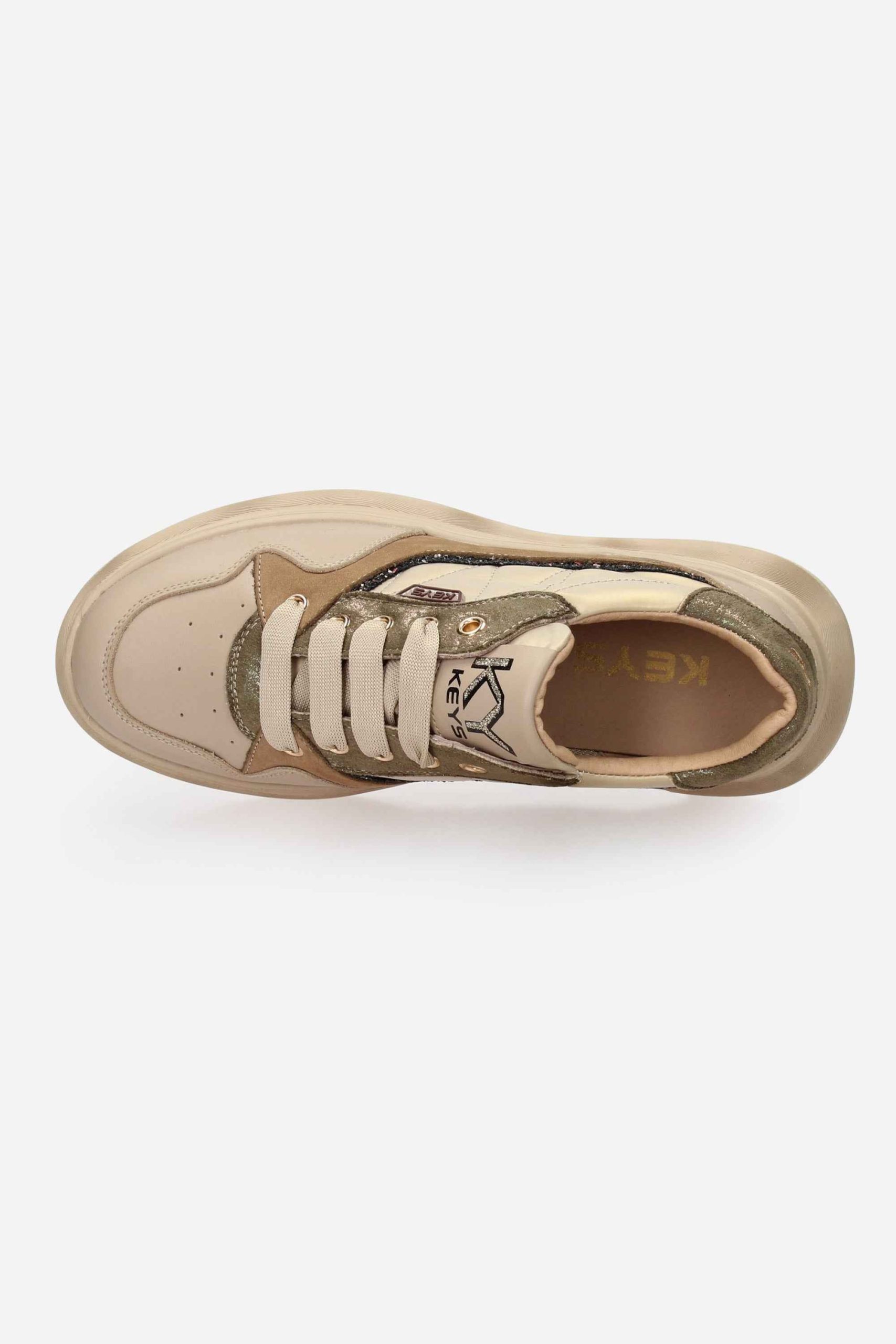 La sneakers è realizzata in pelle e nylon e dettagli in glitter.