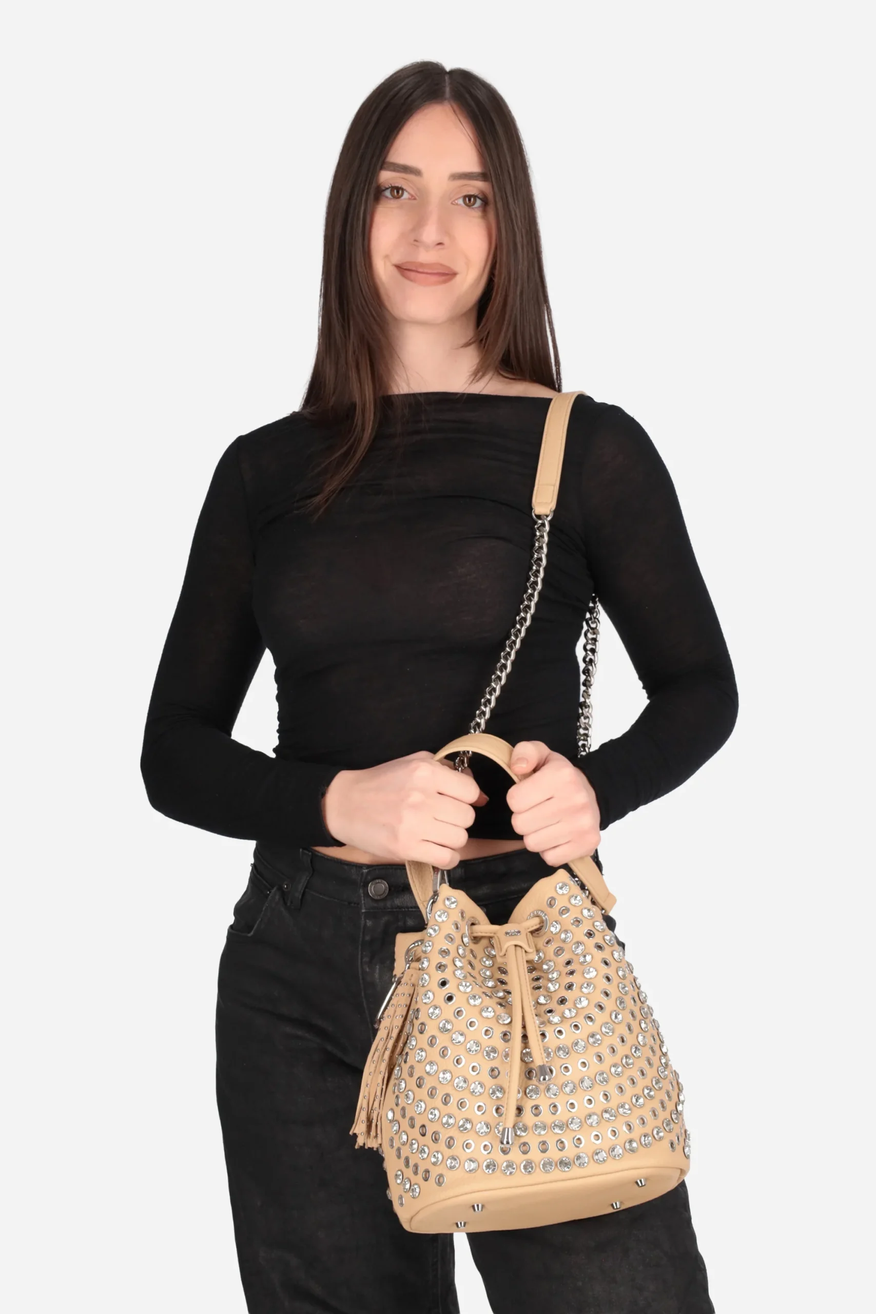 La borsa è realizzata in poliuretano con applicazioni di borchie all over.