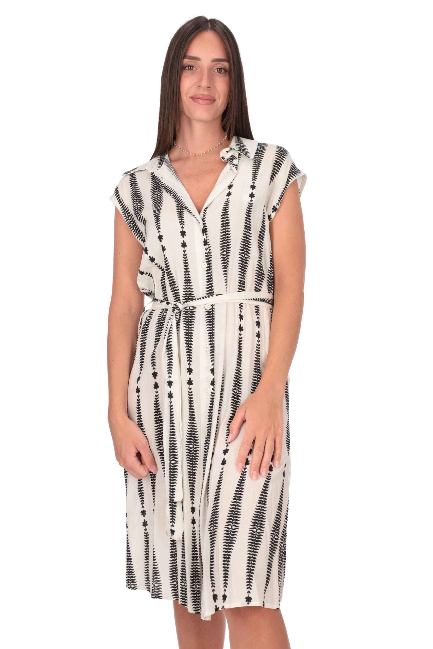 L’abito è realizzato in lino e viscosa con stampa all over.