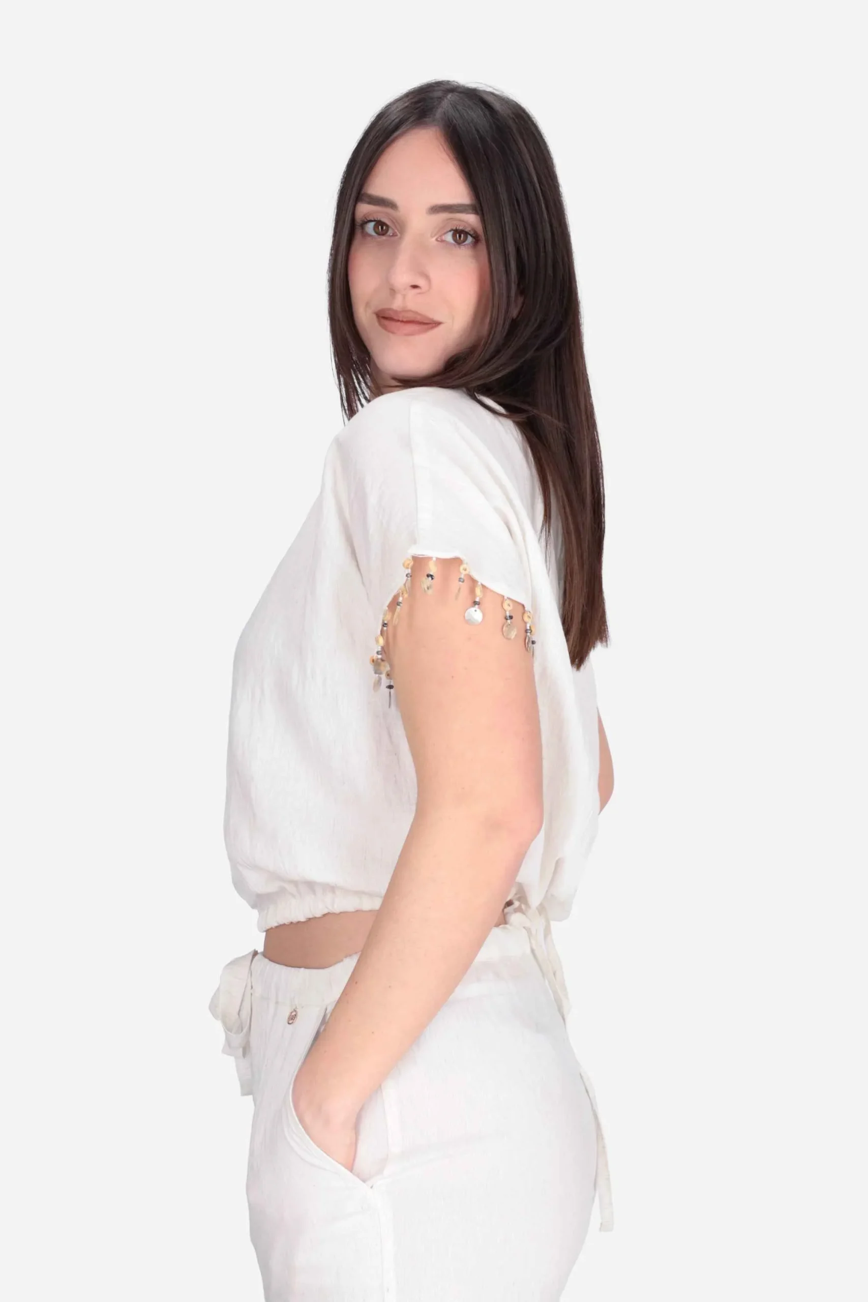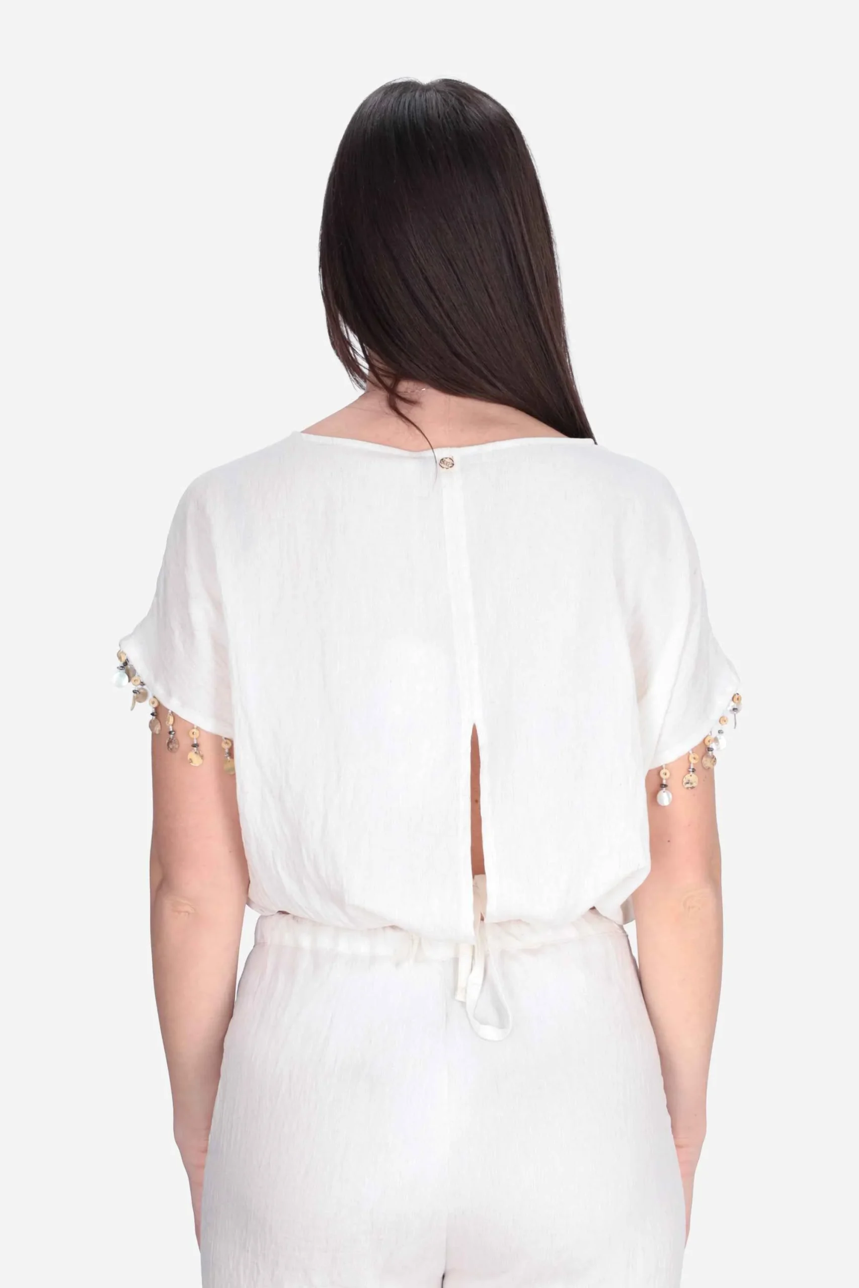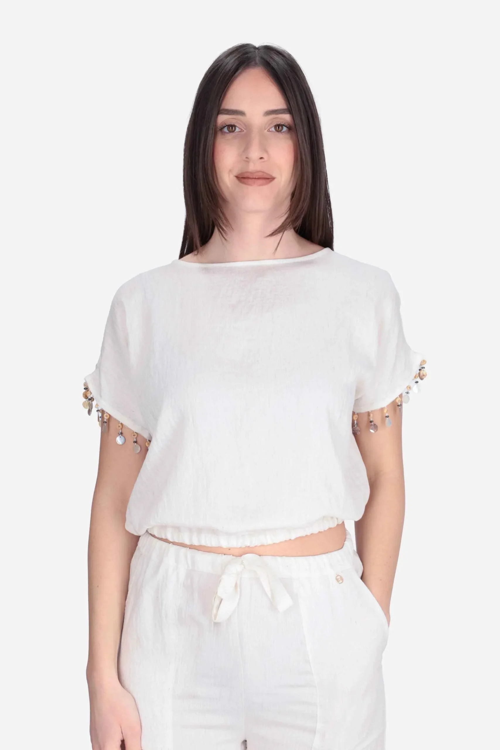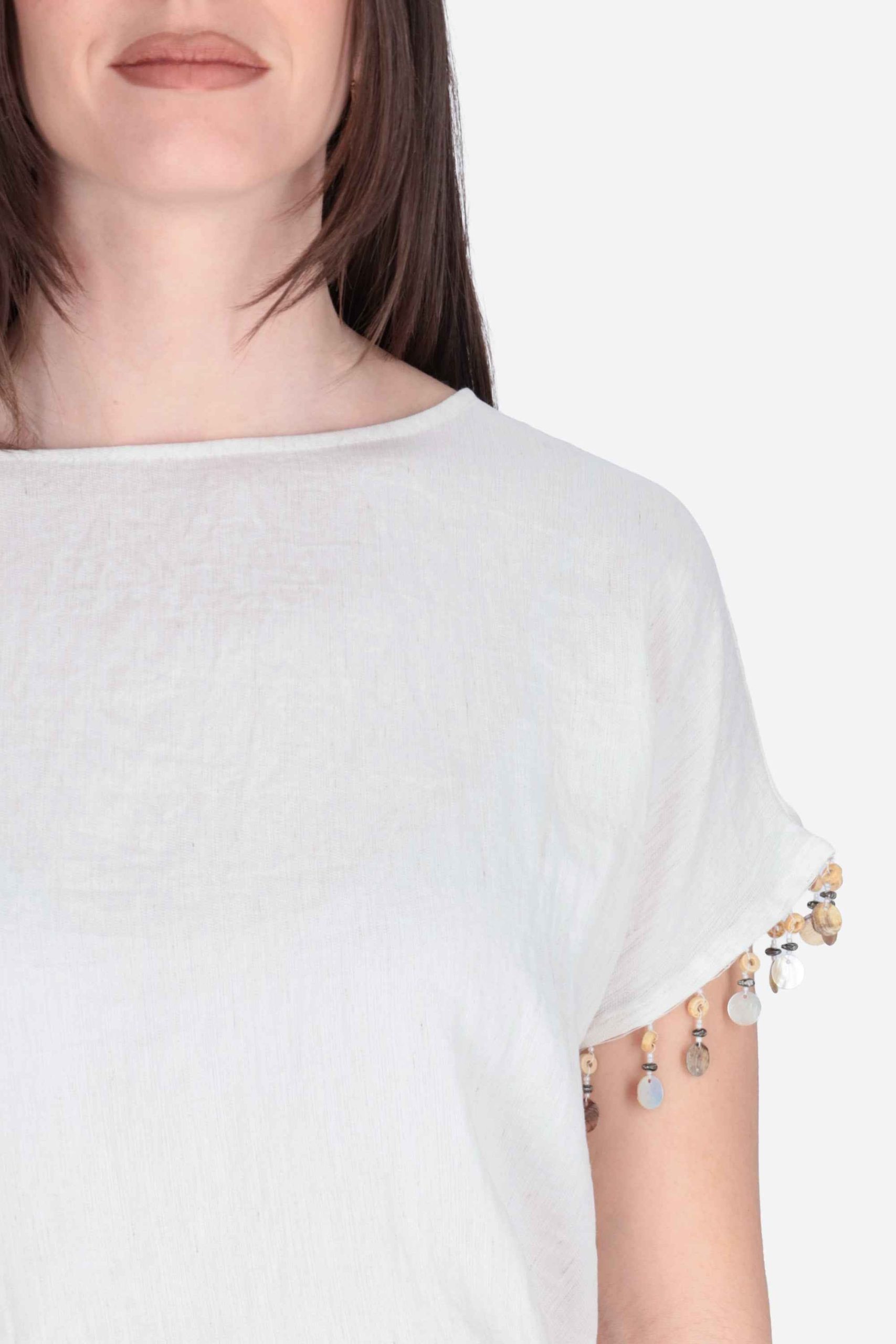 Presenta maniche corte con applicazione si perline sul fondo, girocollo, elastico in vita con coulisse da annodare sul retro e apertura sul retro.
