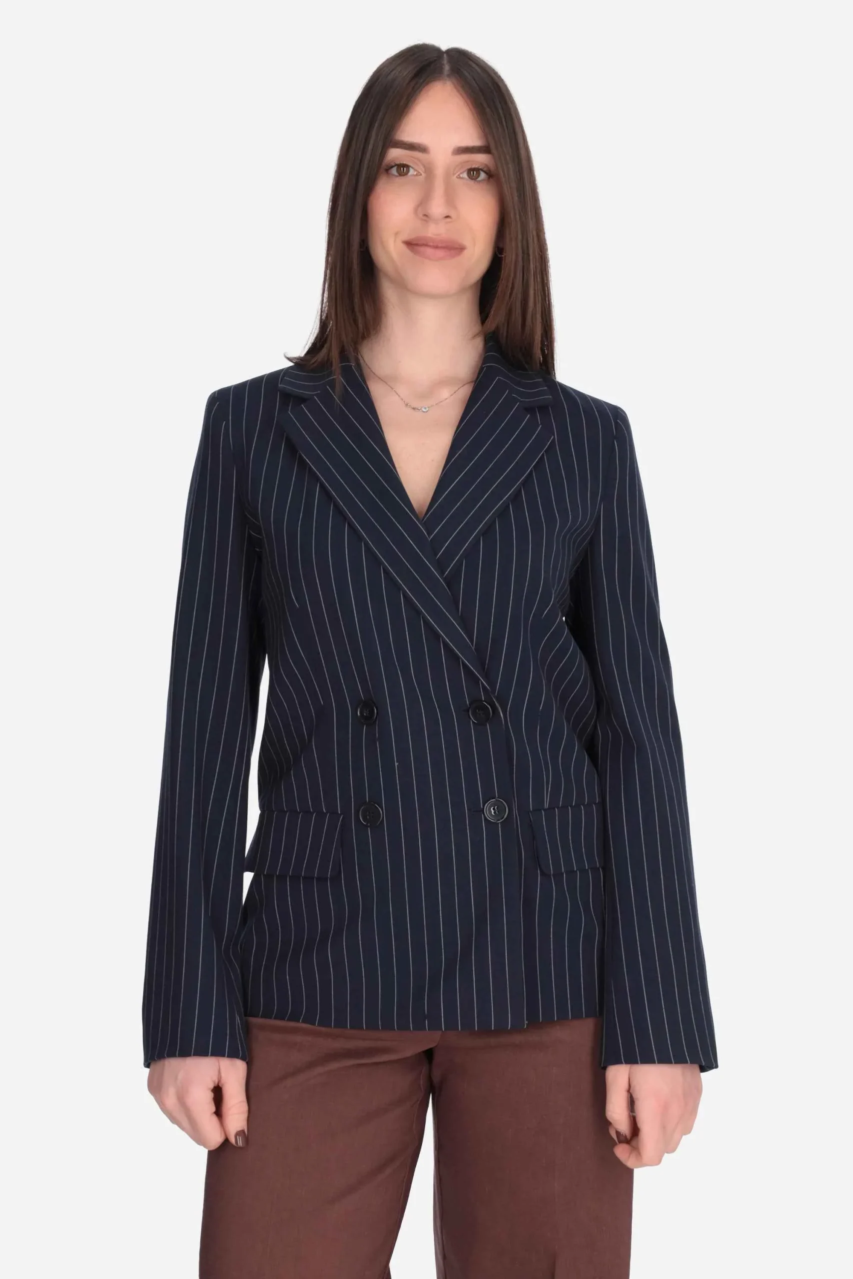Presenta maniche lunghe, riverse a lancia e chiusura monopetto con bottone a fiore in metallo.