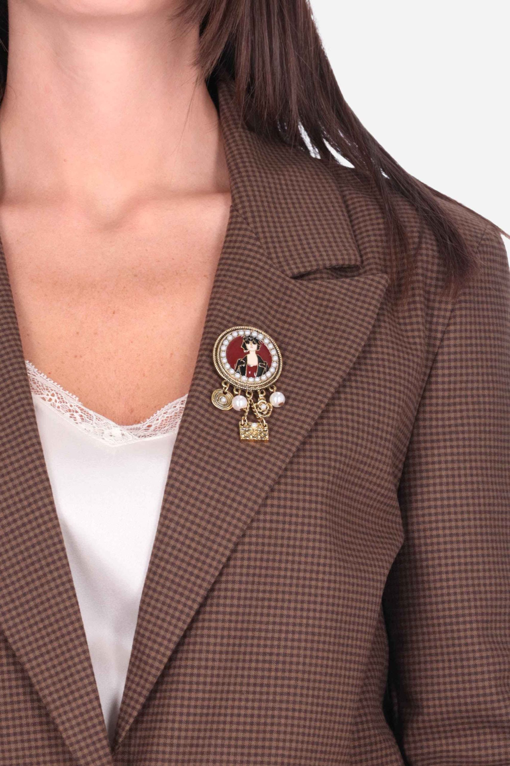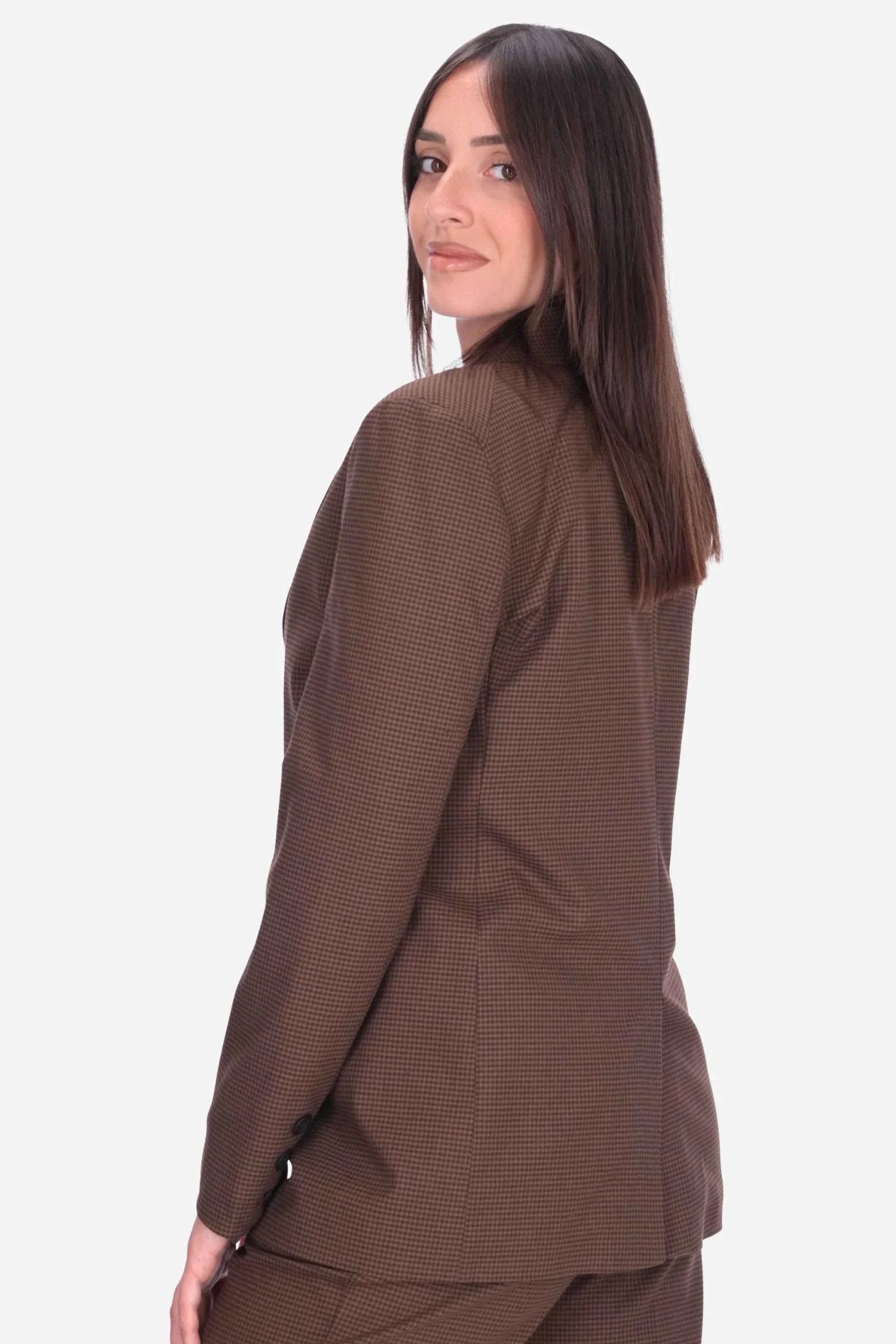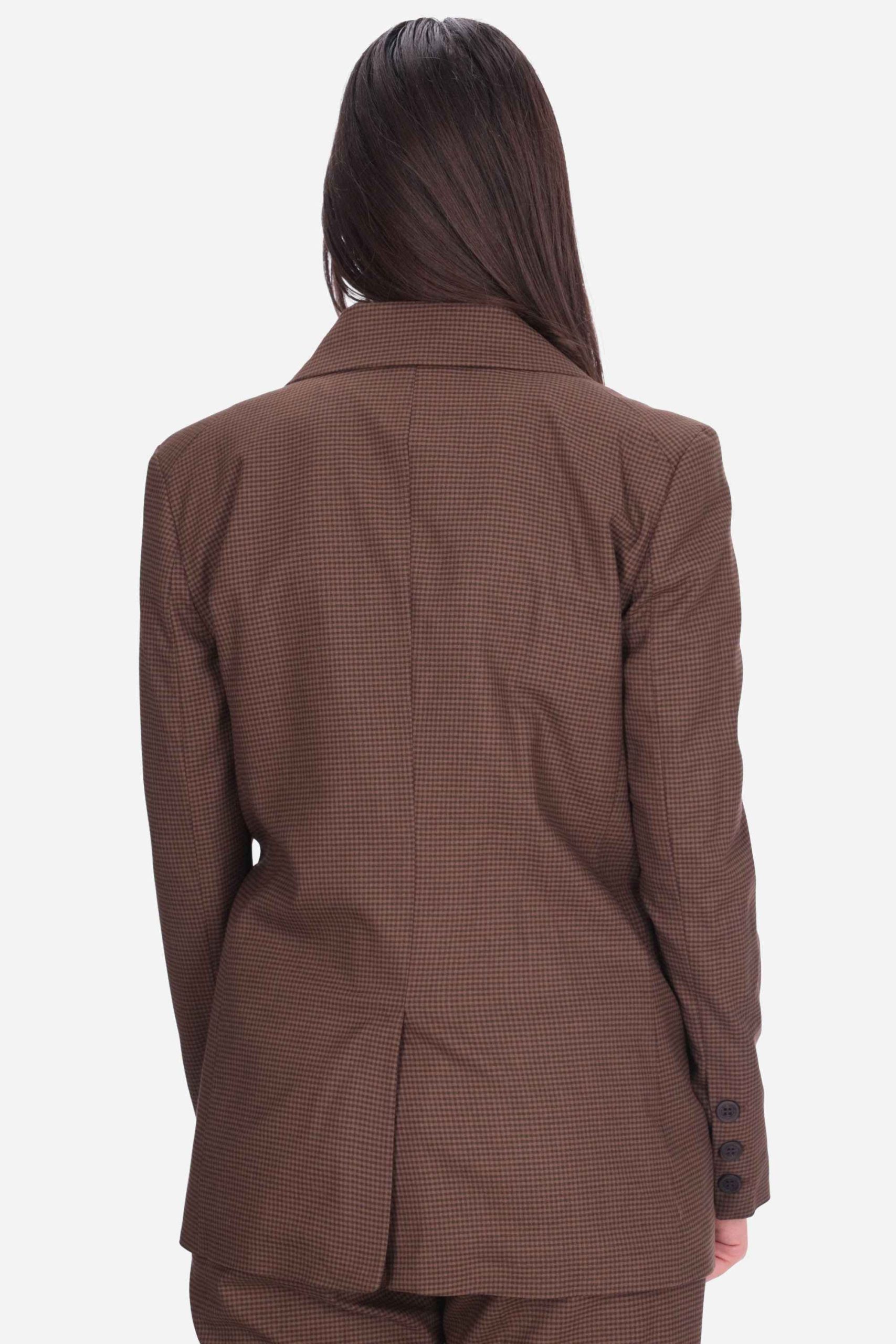 Presenta una fantasia pied-de-poule, revers a lancia con spilla rimovibile, chiusura con bottone, tasche sui fianchi a patta, spacco sul retro e bottoni sui polsi.