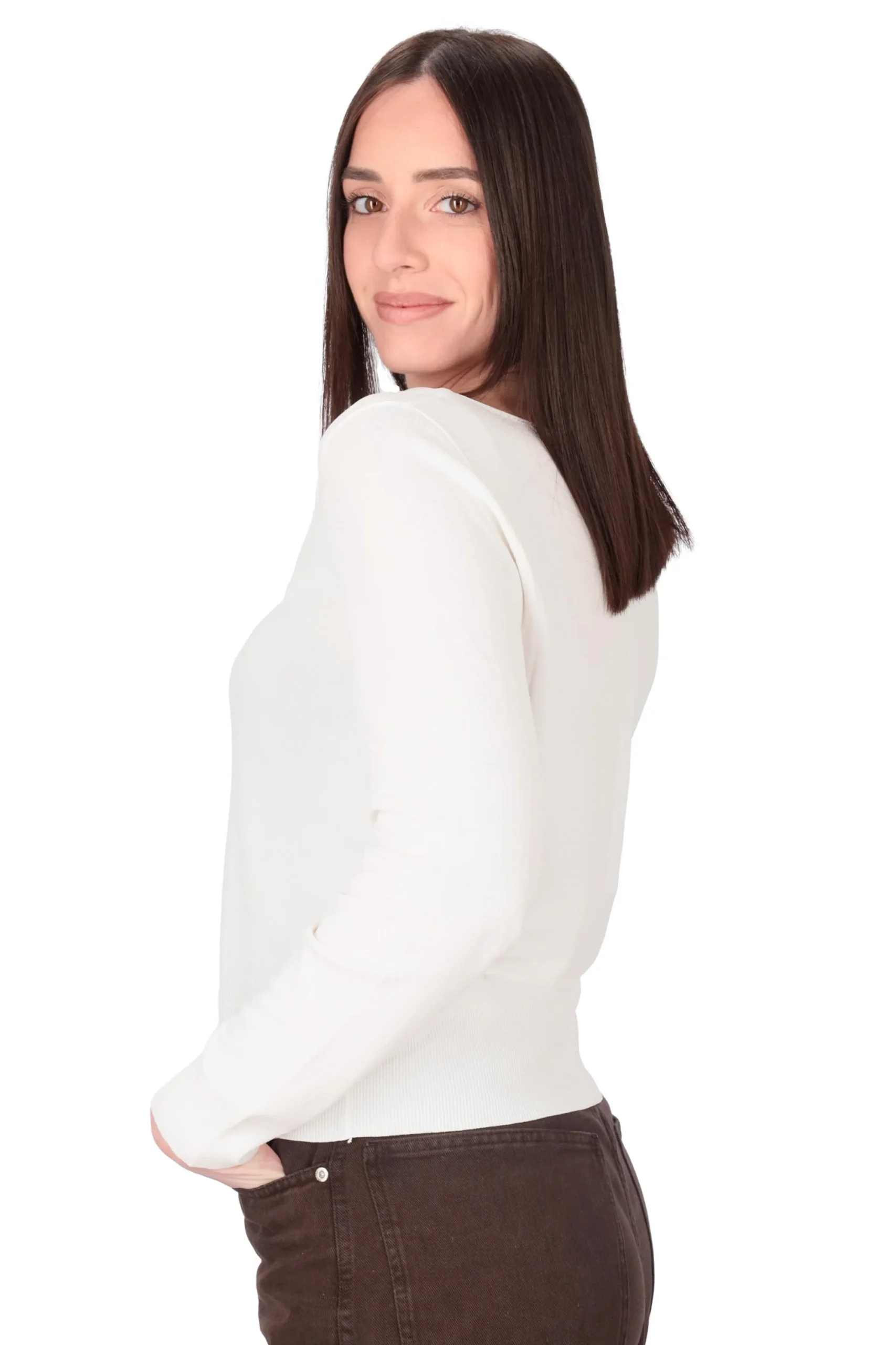 Presenta maniche lunghe, girocollo leggermente a barca e bordi rifiniti a coste.