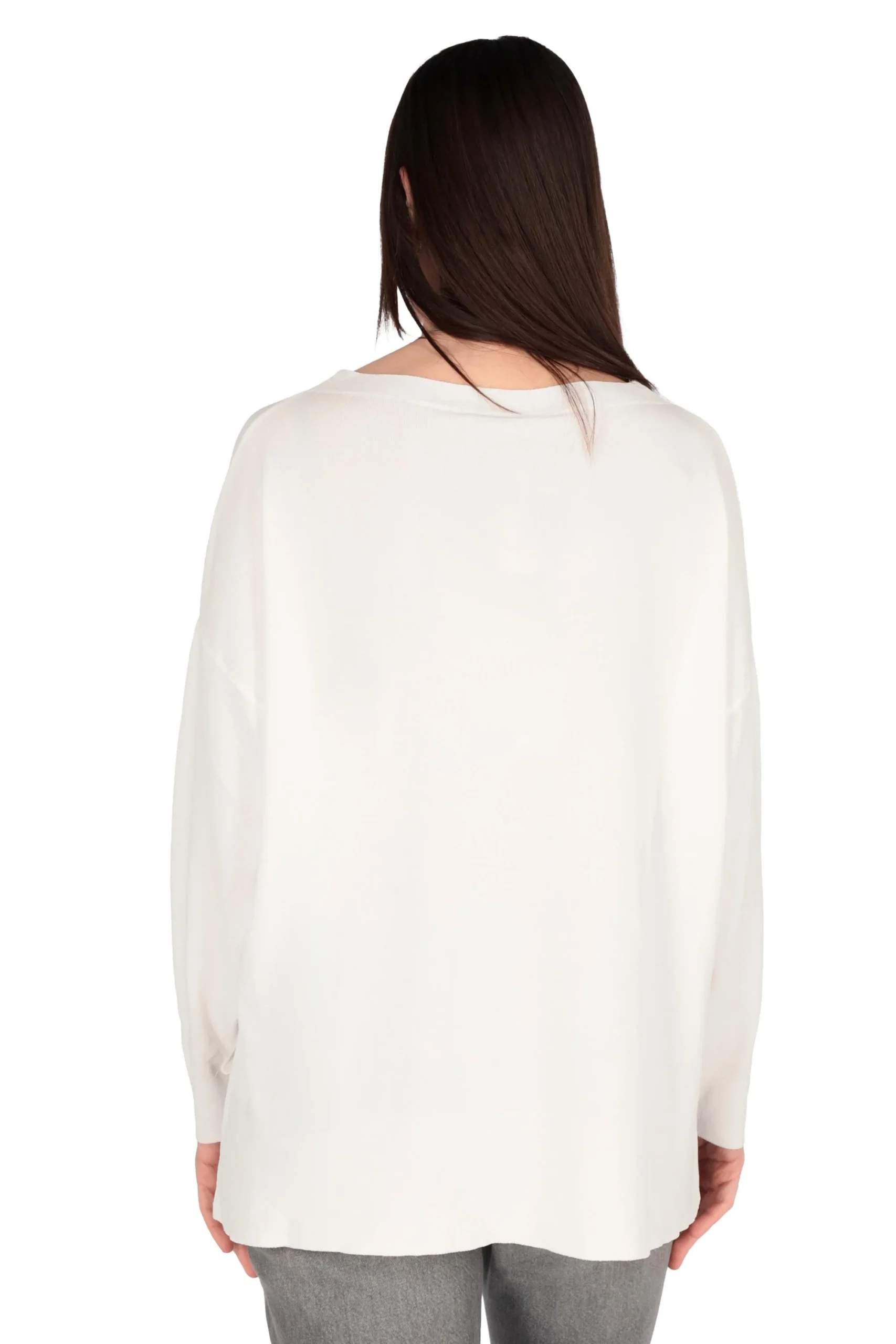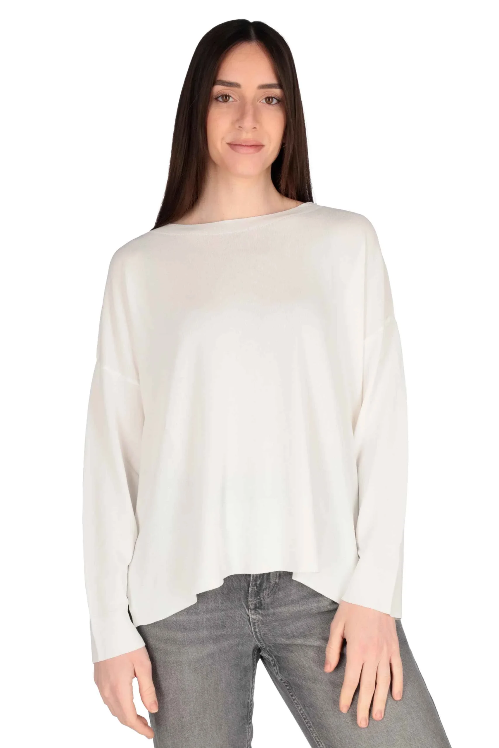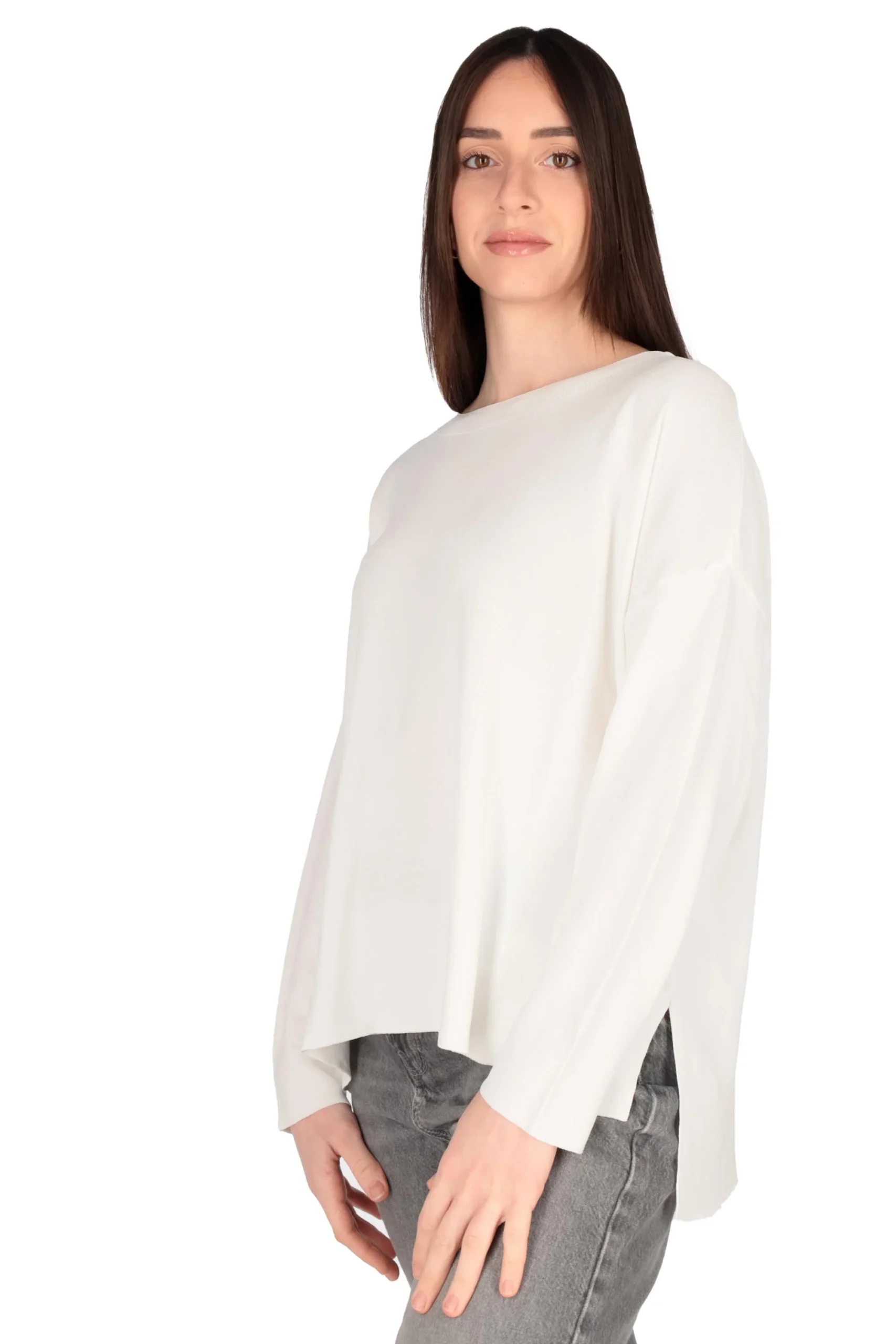 Presenta maniche lunghe, girocollo leggermente a barca e bordi rifiniti a coste, con spacchi laterali.