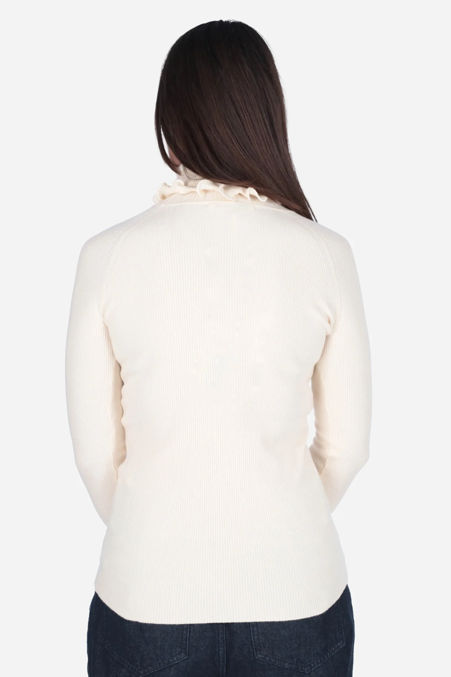 Presenta effetto a costine, collo alto con ruche come sui polsi leggermente ampi.