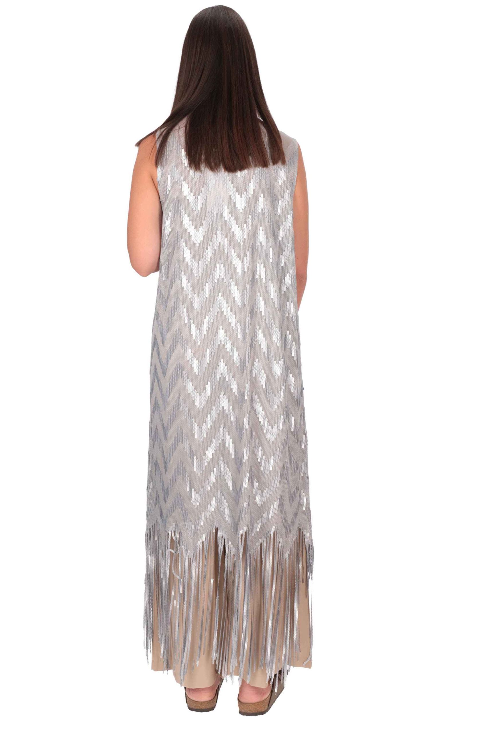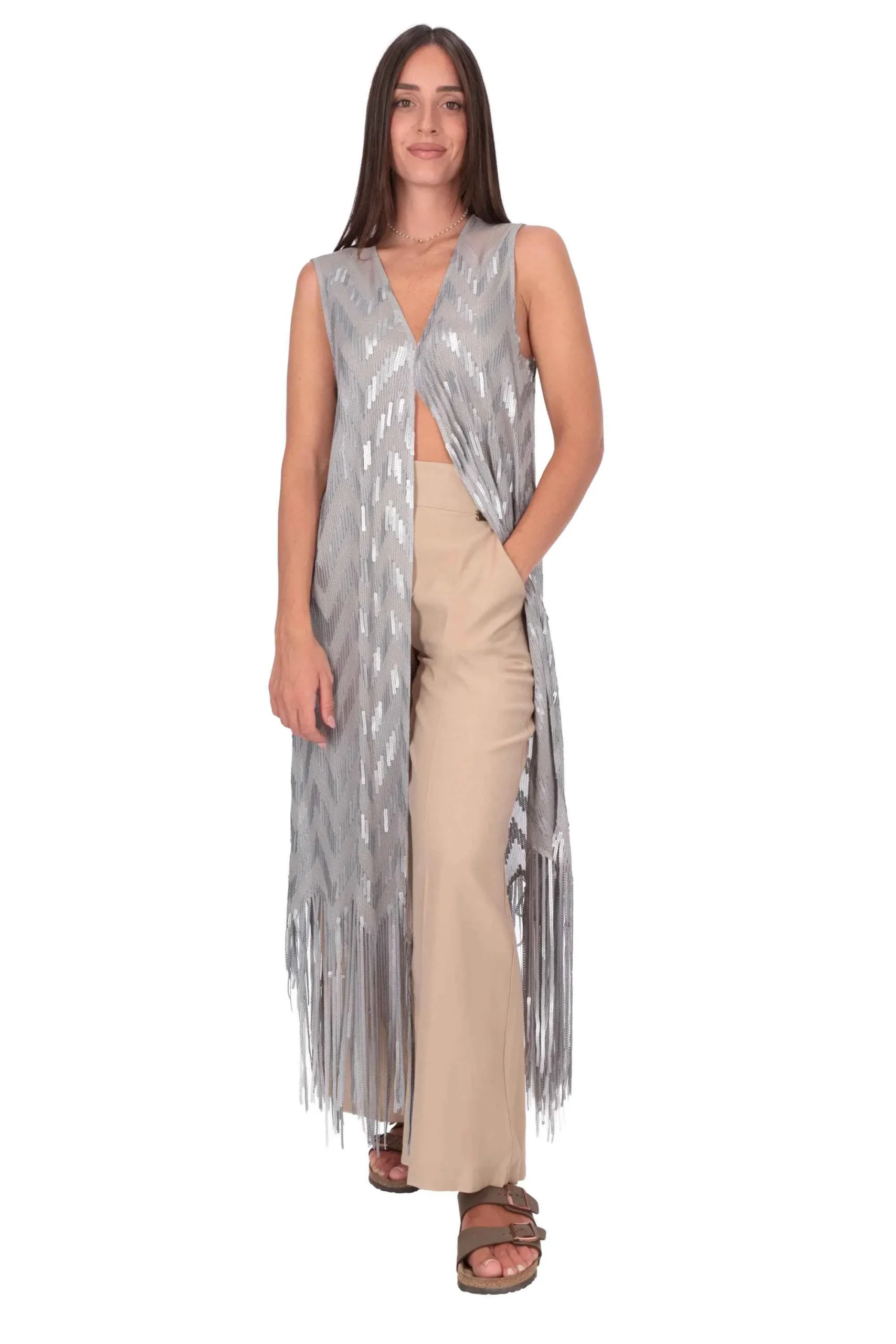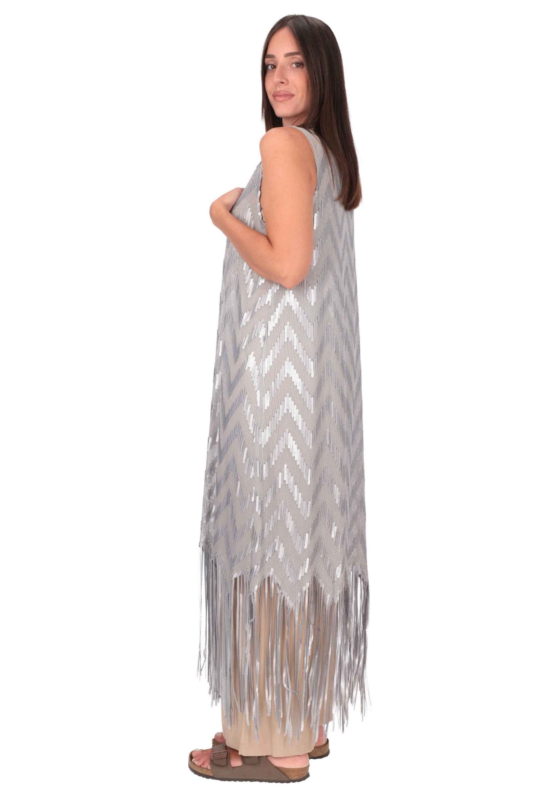 Presenta maniche a giro, frange sul fondo e nessuna chiusura.