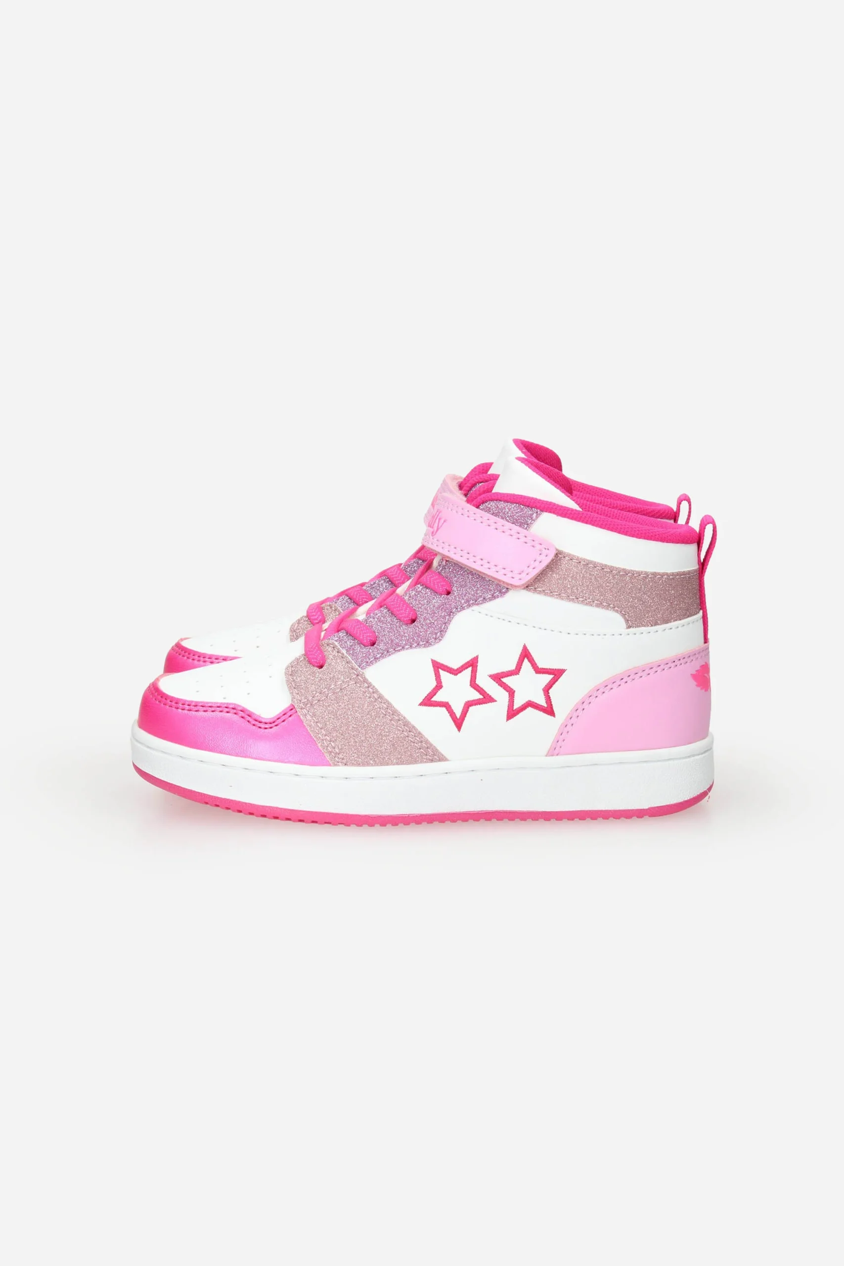 La sneakers è realizzata in ecopelle e dettagli glitter.
