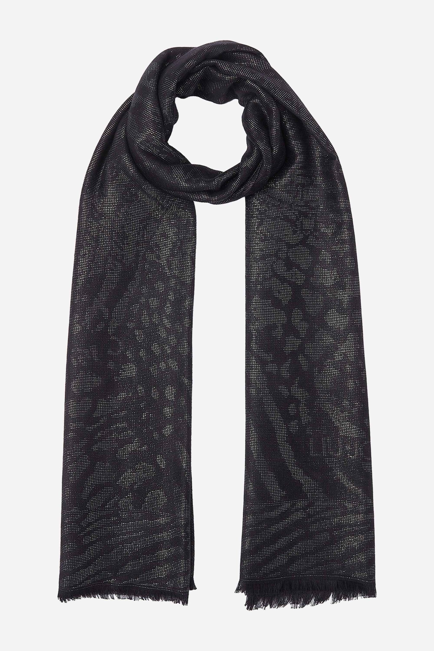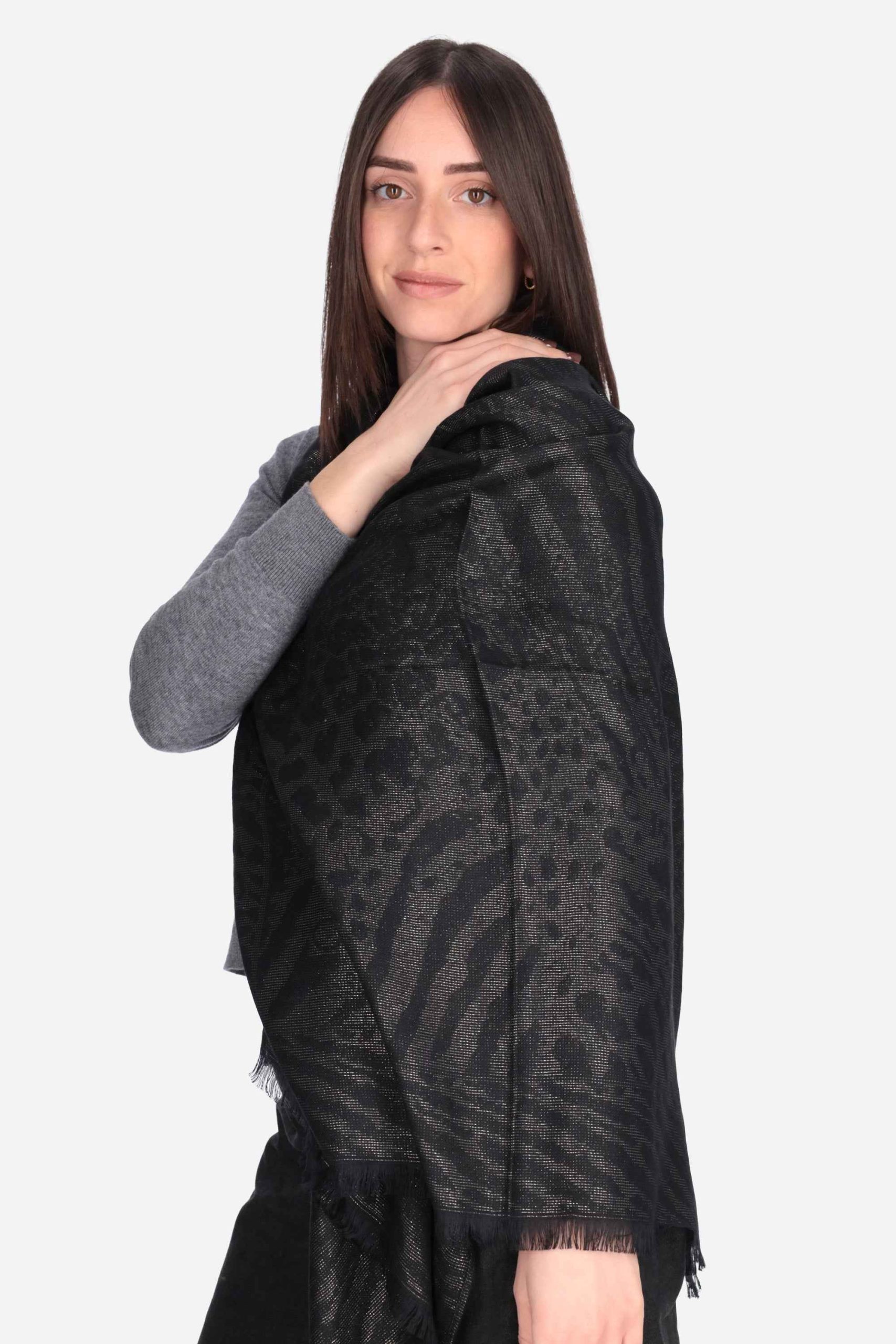 La stola è realizzata in tessuto jacquard con motivo animalier in tono colore, interventi in lurex® e orli sfrangiati