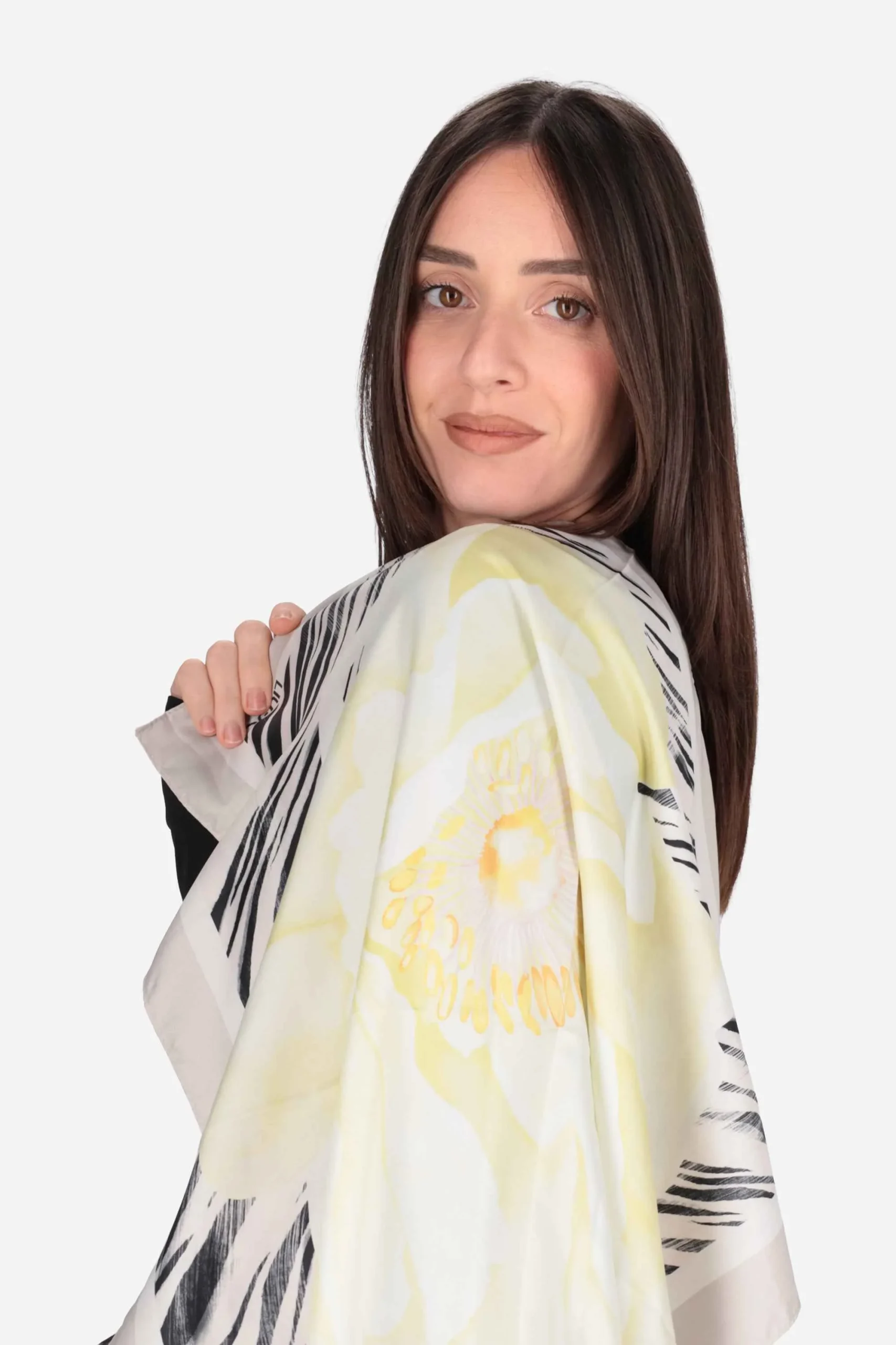 Il foulard è realizzato in poliestere effetto raso, con stampa all over e bordo rifinito.