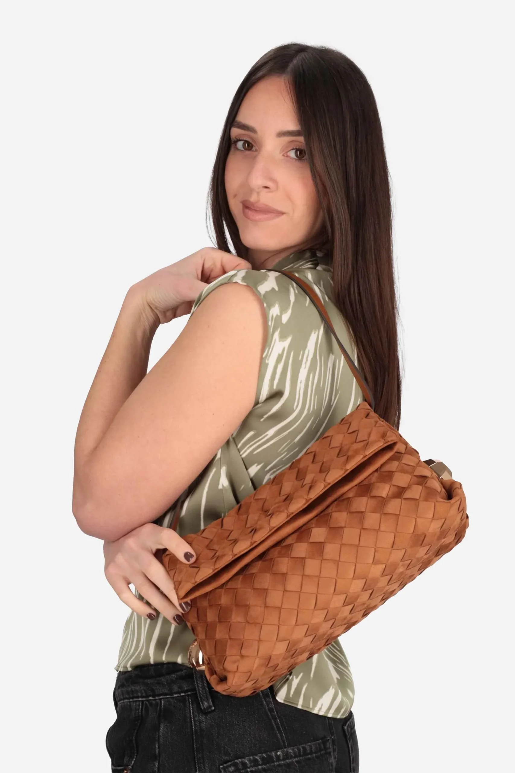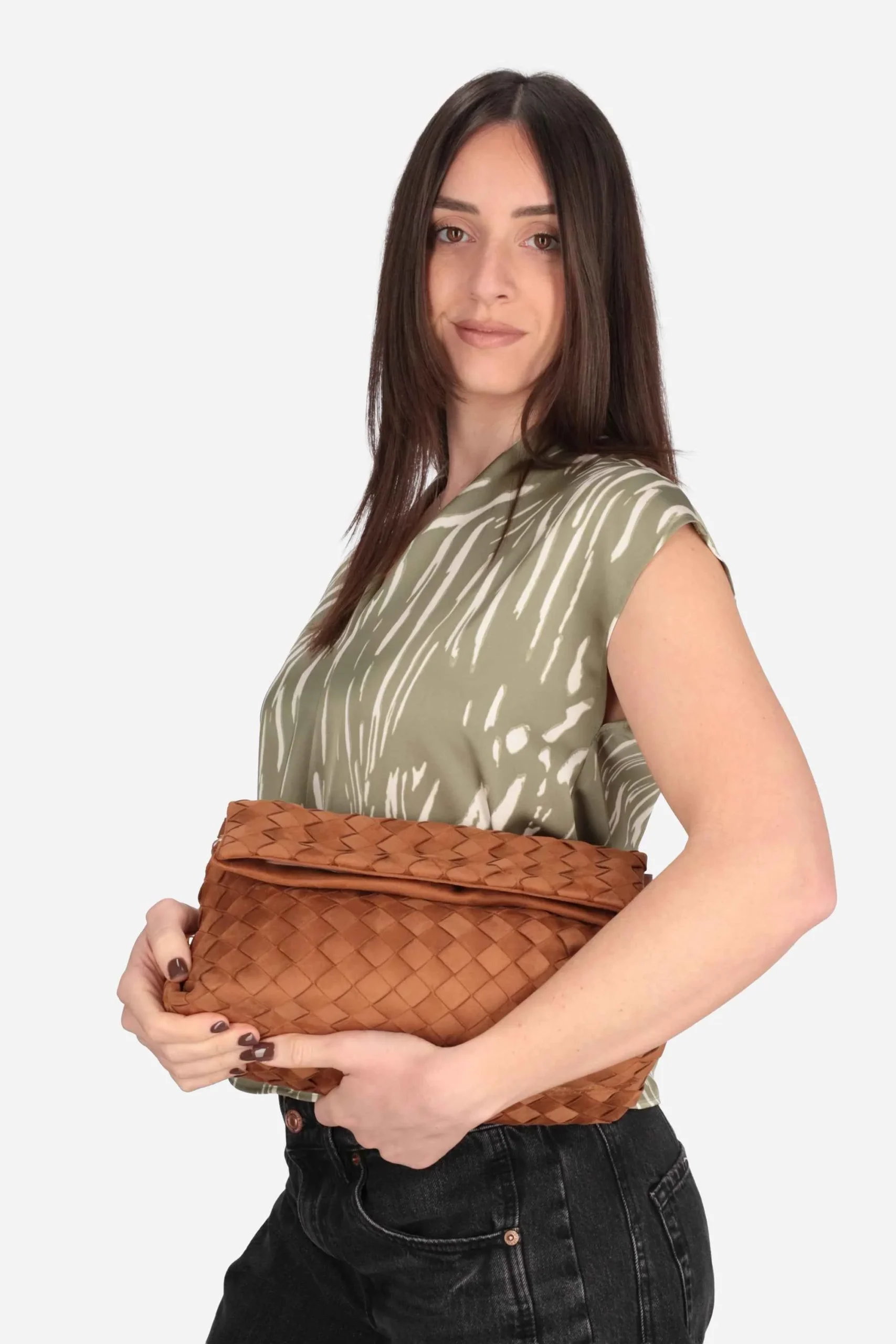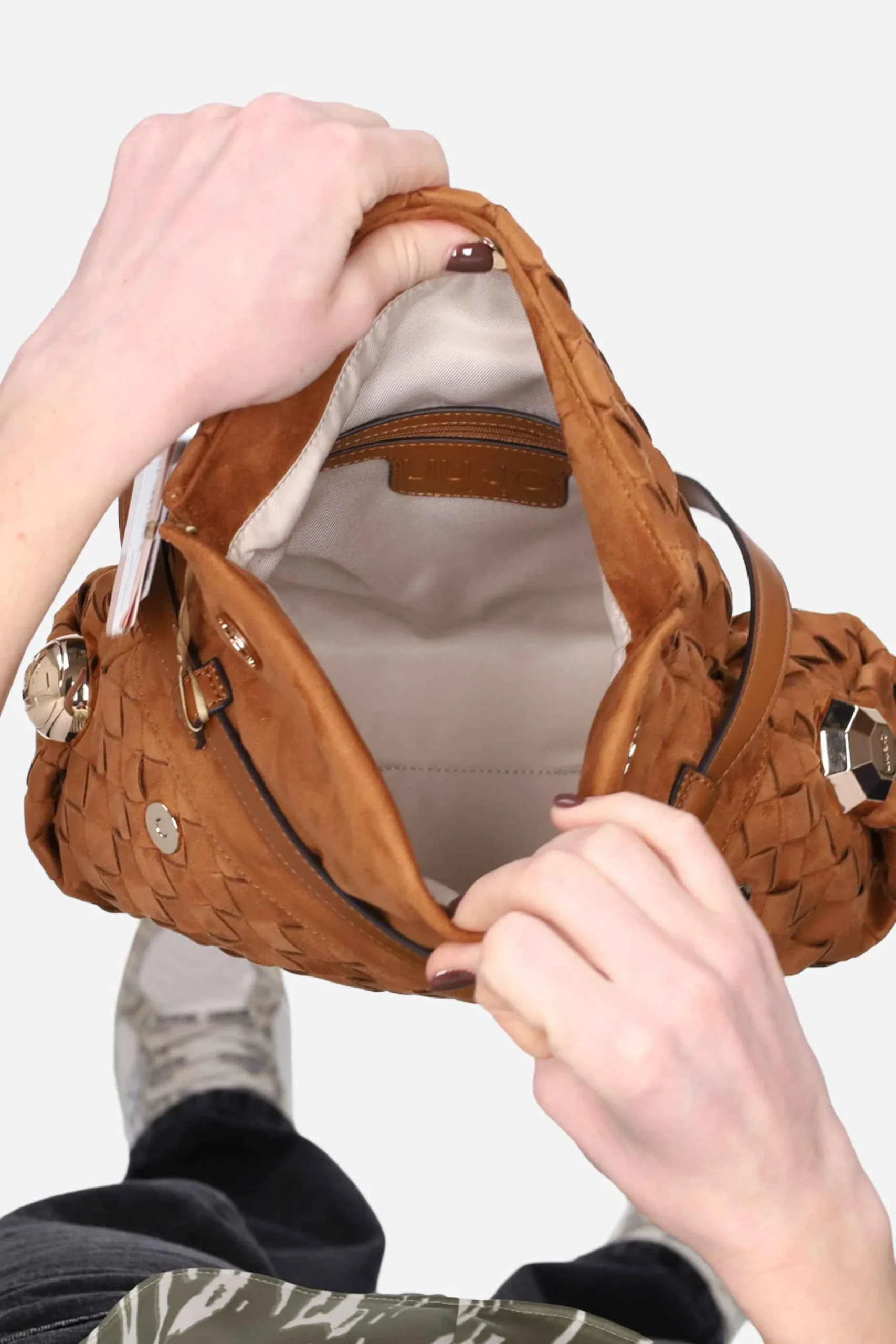 La borsa è realizzata in poliestere effetto suede con motivo intrecciato e logo sul davanti.