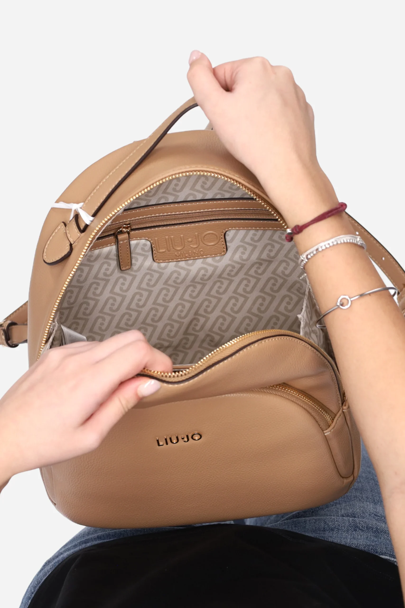 Lo zaino è realizzato in poliuretano con logo in metallo sul davanti.