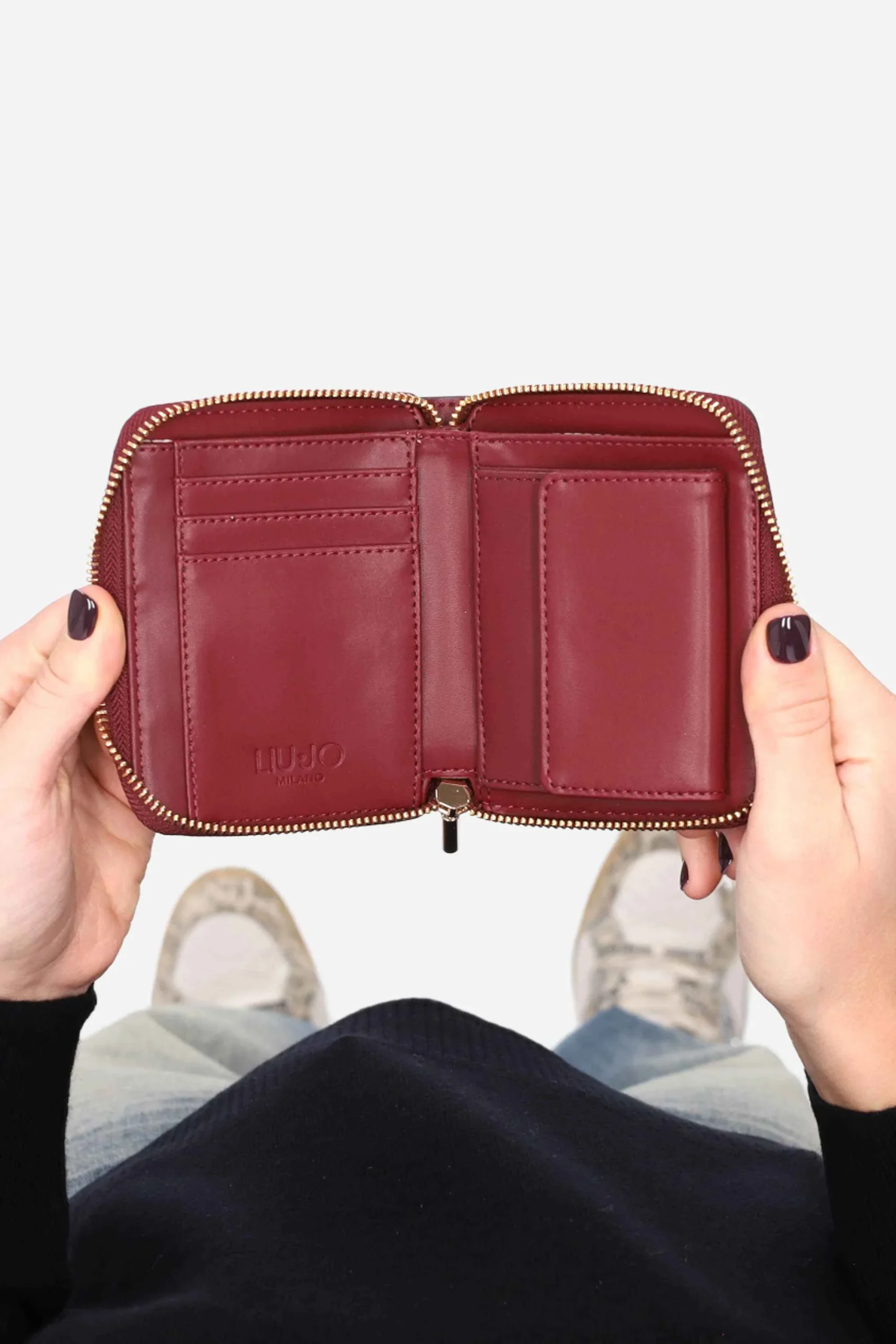 L’interno è foderato con scomparti per documenti, carte di credito e tasca zip per monete.