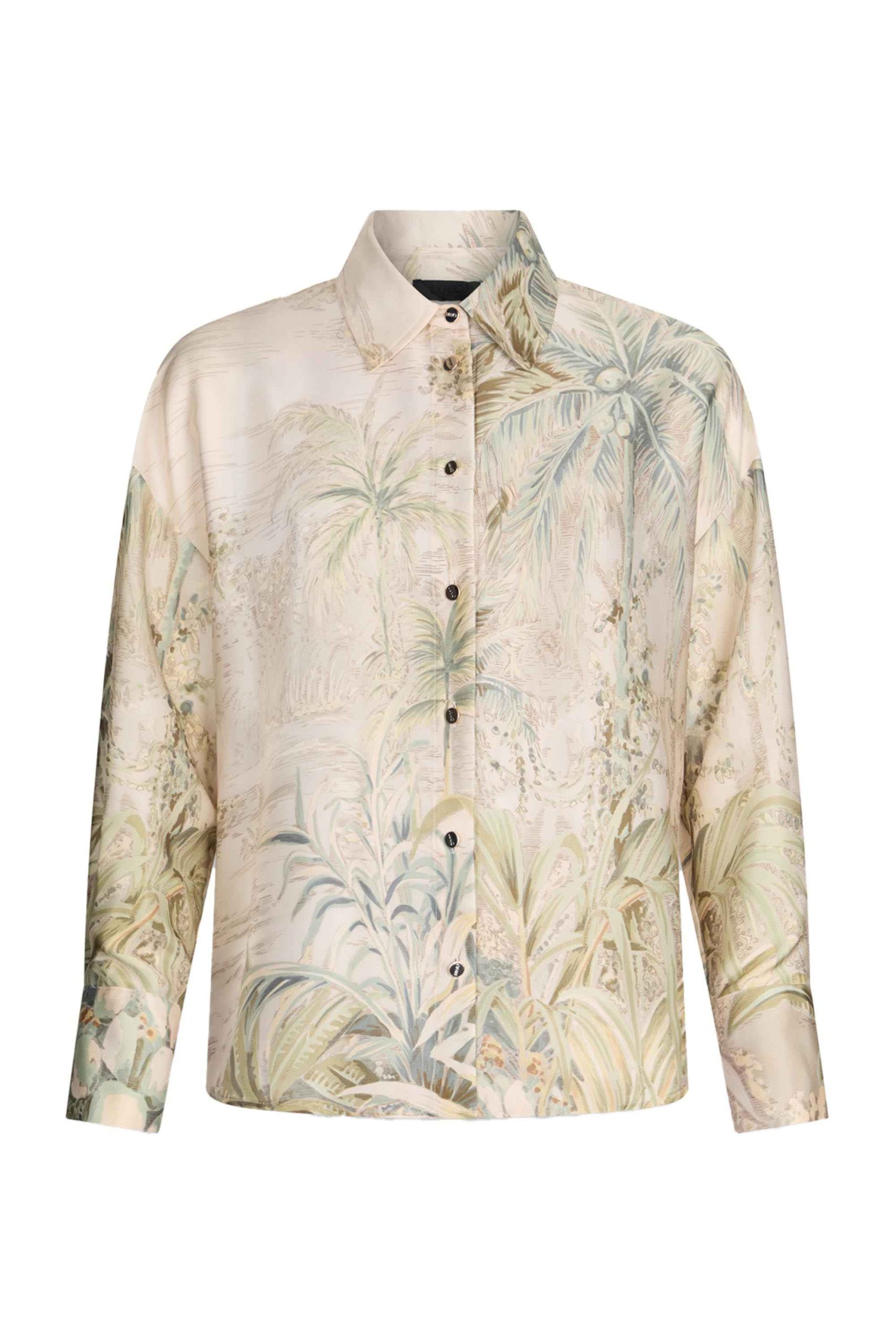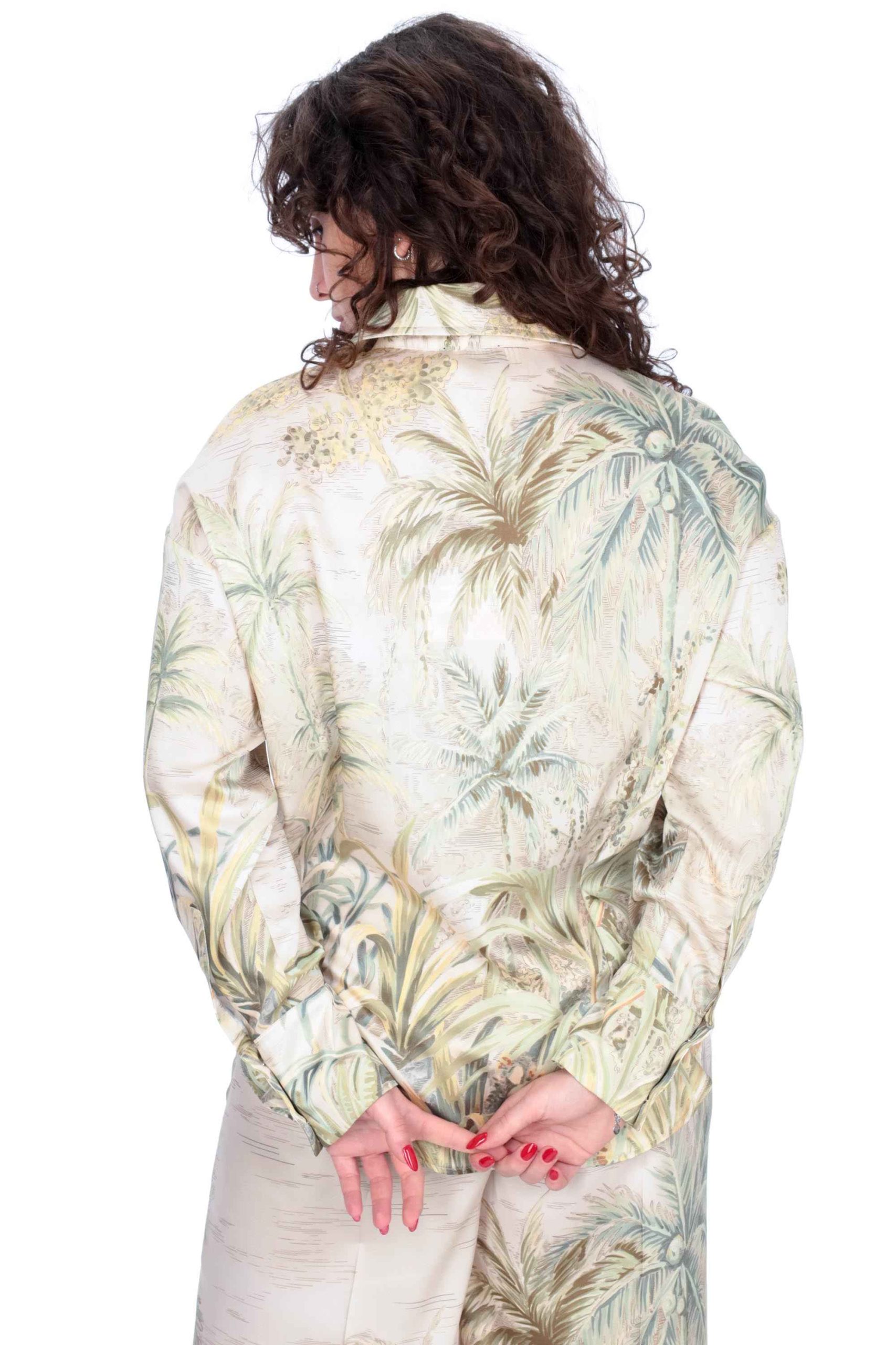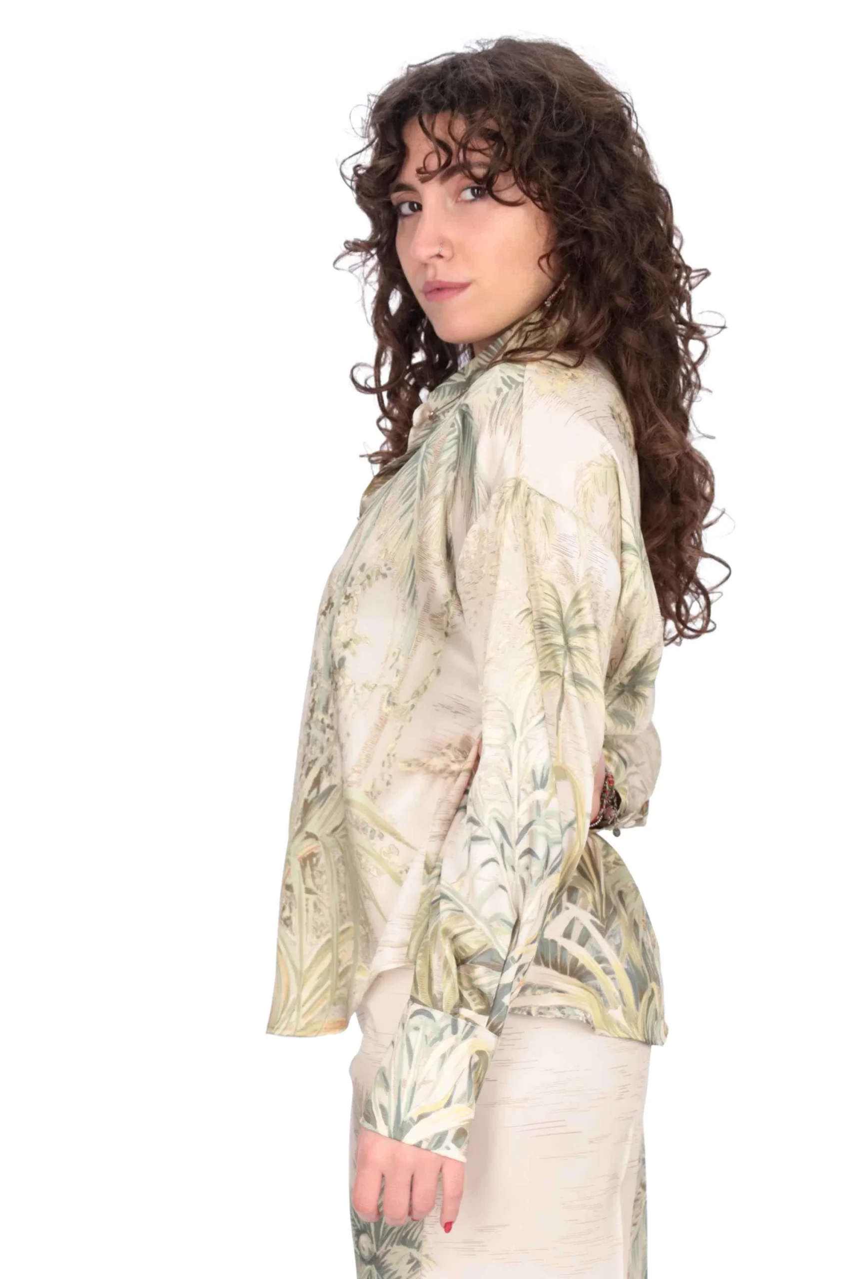 La camicia è realizzata in twill di poliestere con stampa tropicale.