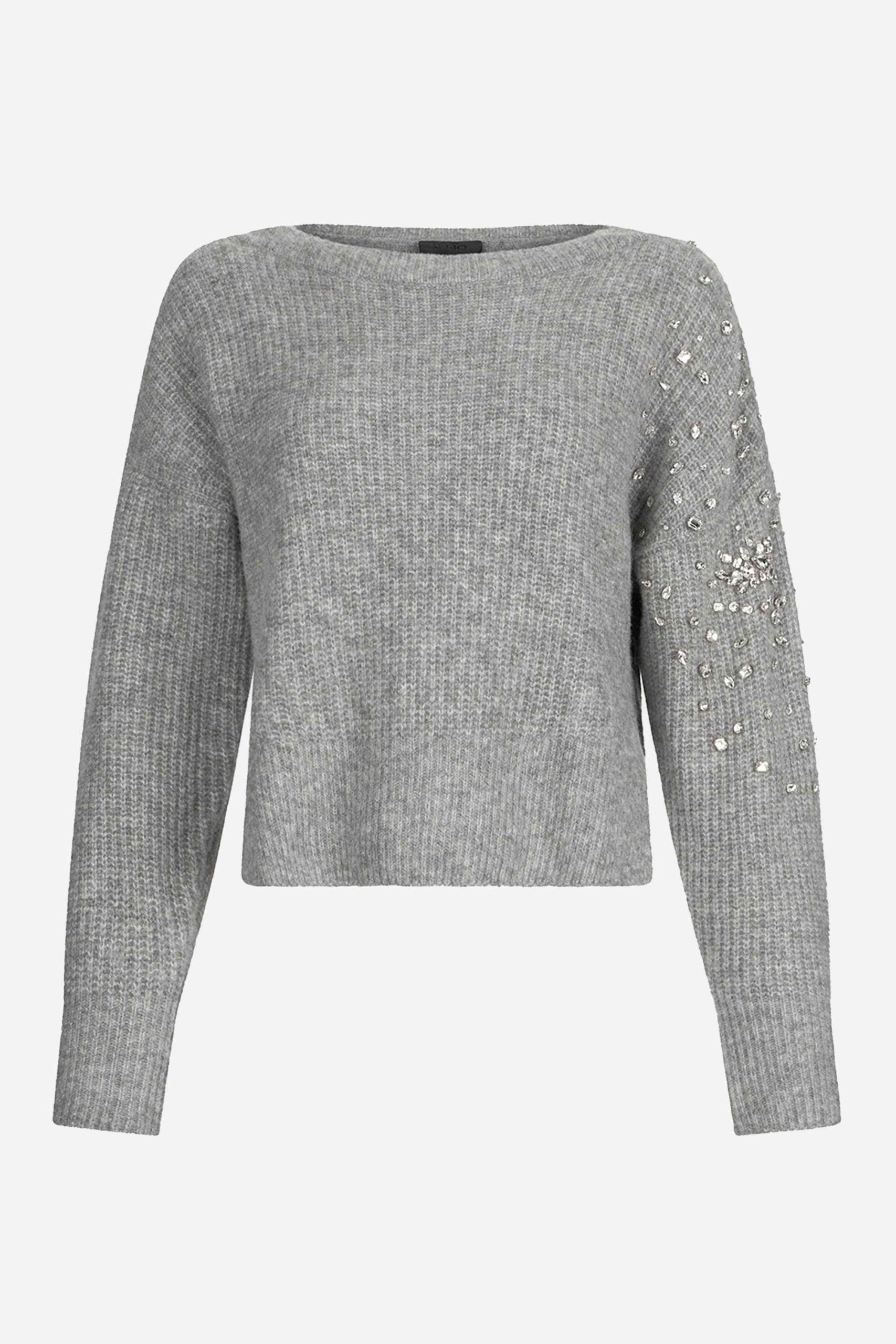 Presenta maniche lunghe con applicazione di strass su una, scollo a barca, logo in metallo sul retro.