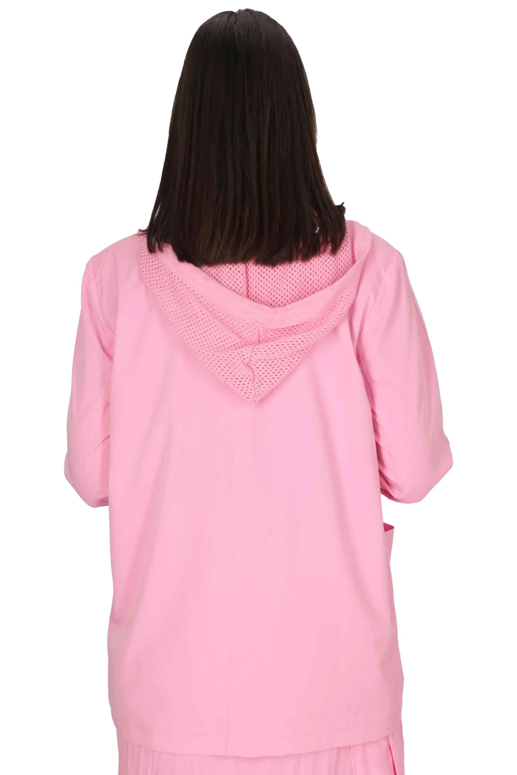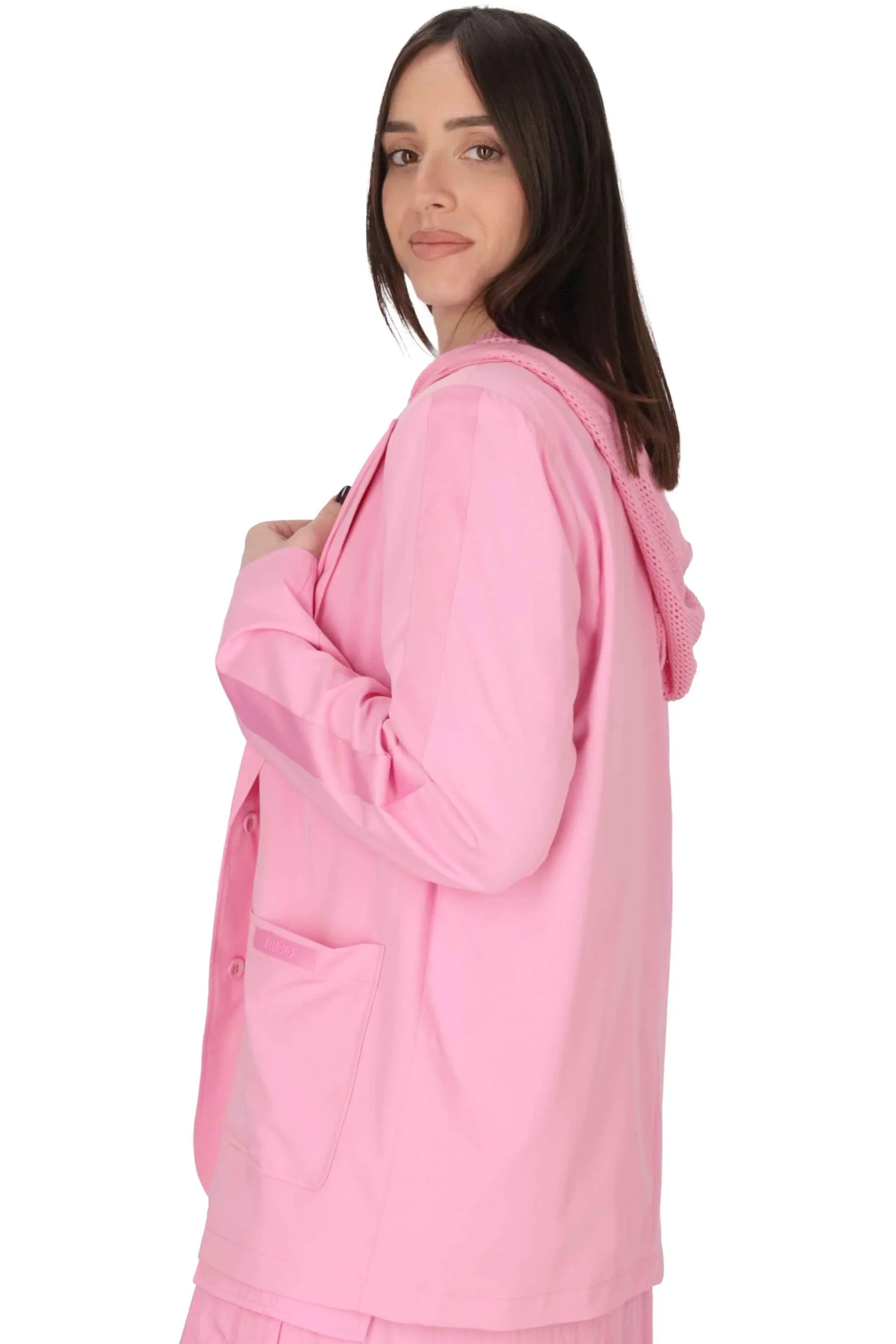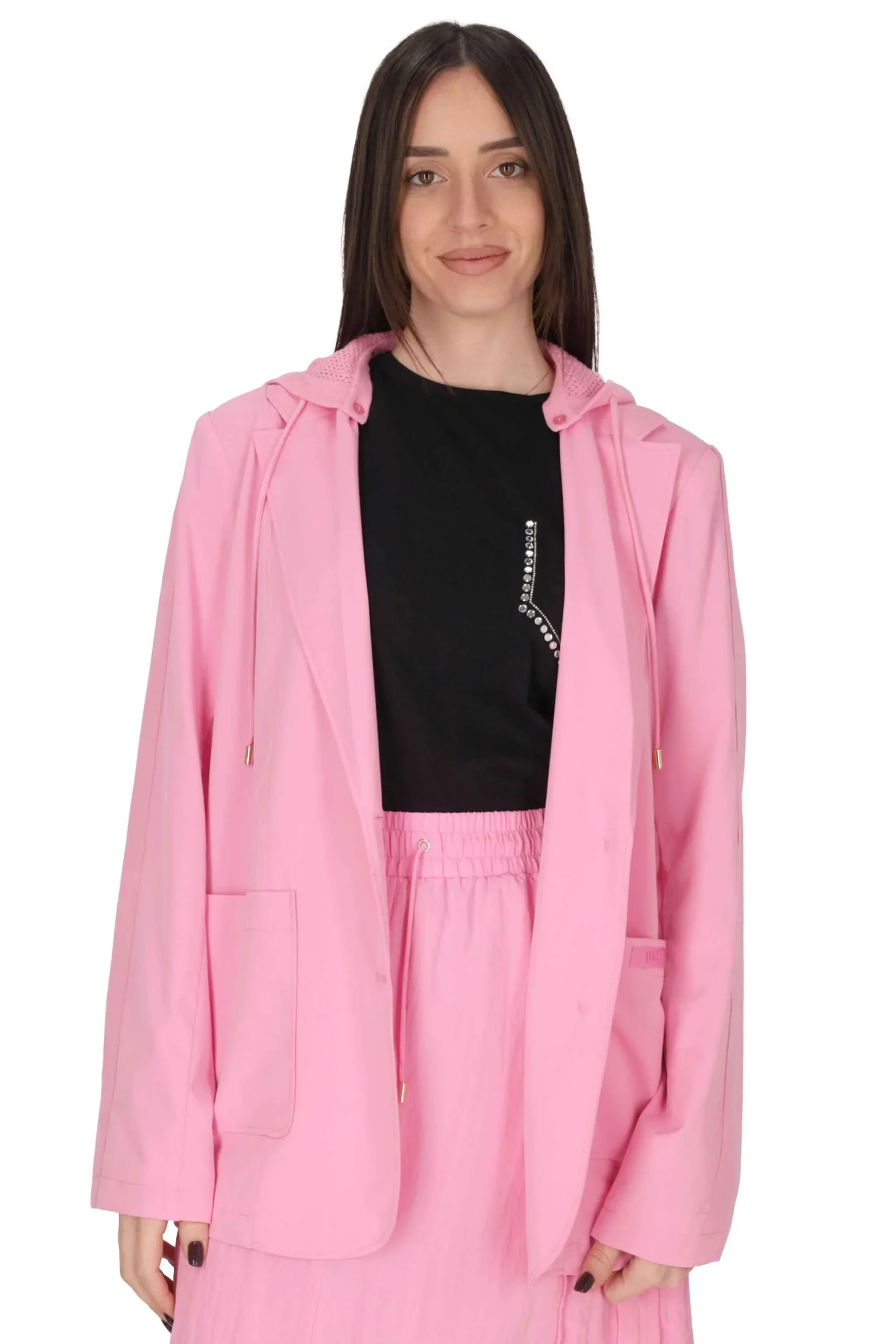 La modella con la giacca rosa è alta 175 cm e indossa una taglia M.