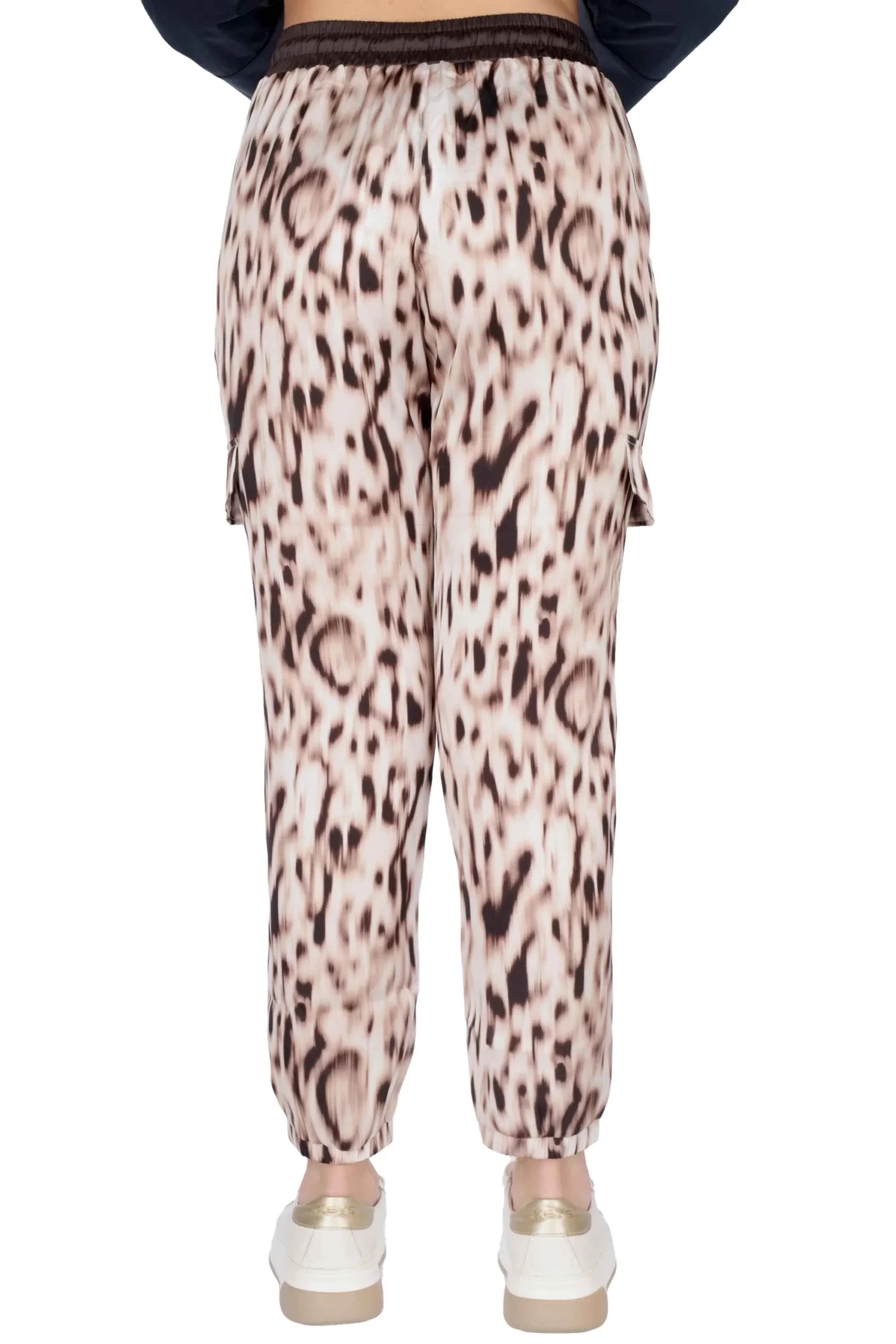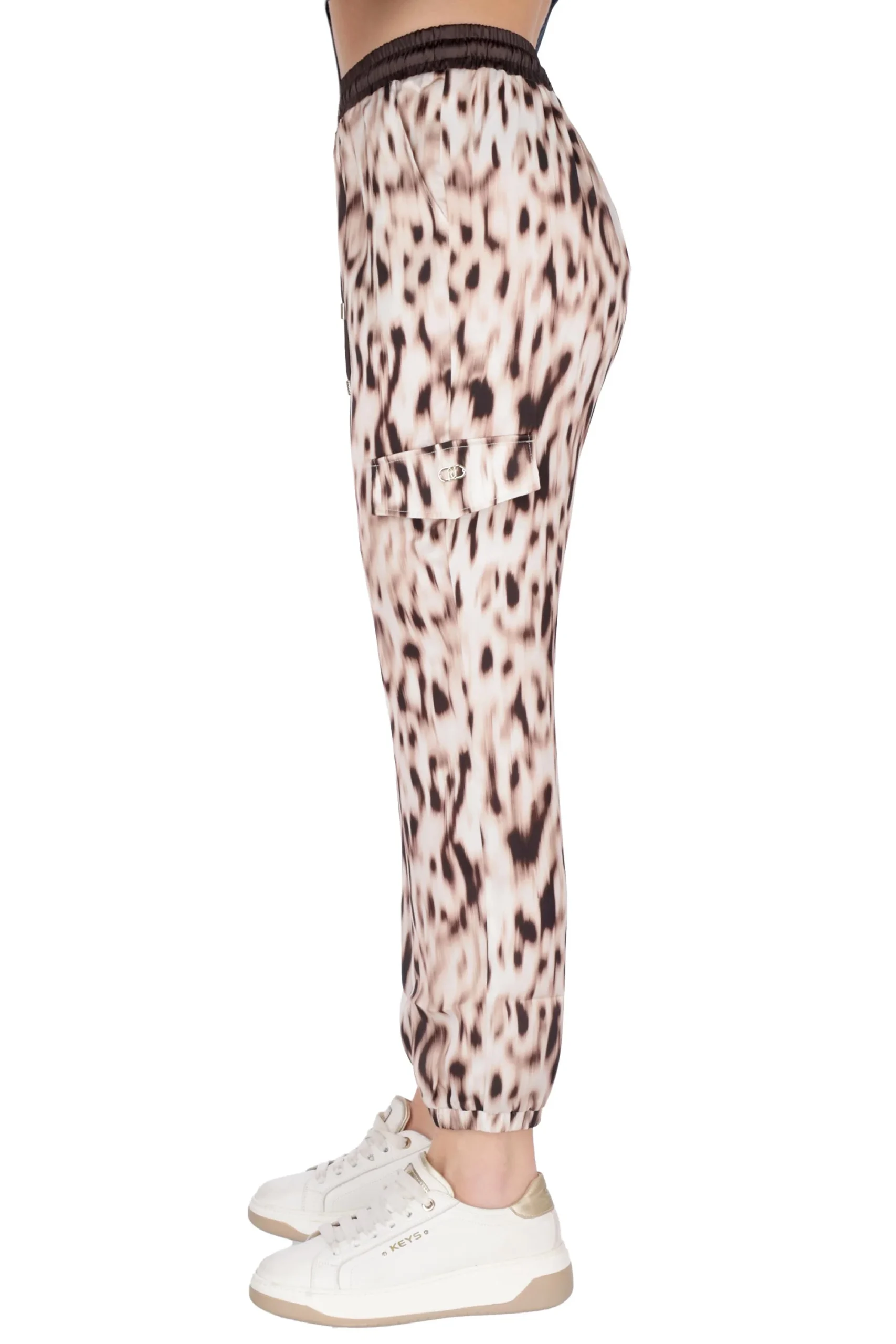 Il pantalone è realizzato in poliestere effetto lucido con stampa animalier all over, con logo in metallo laterale.