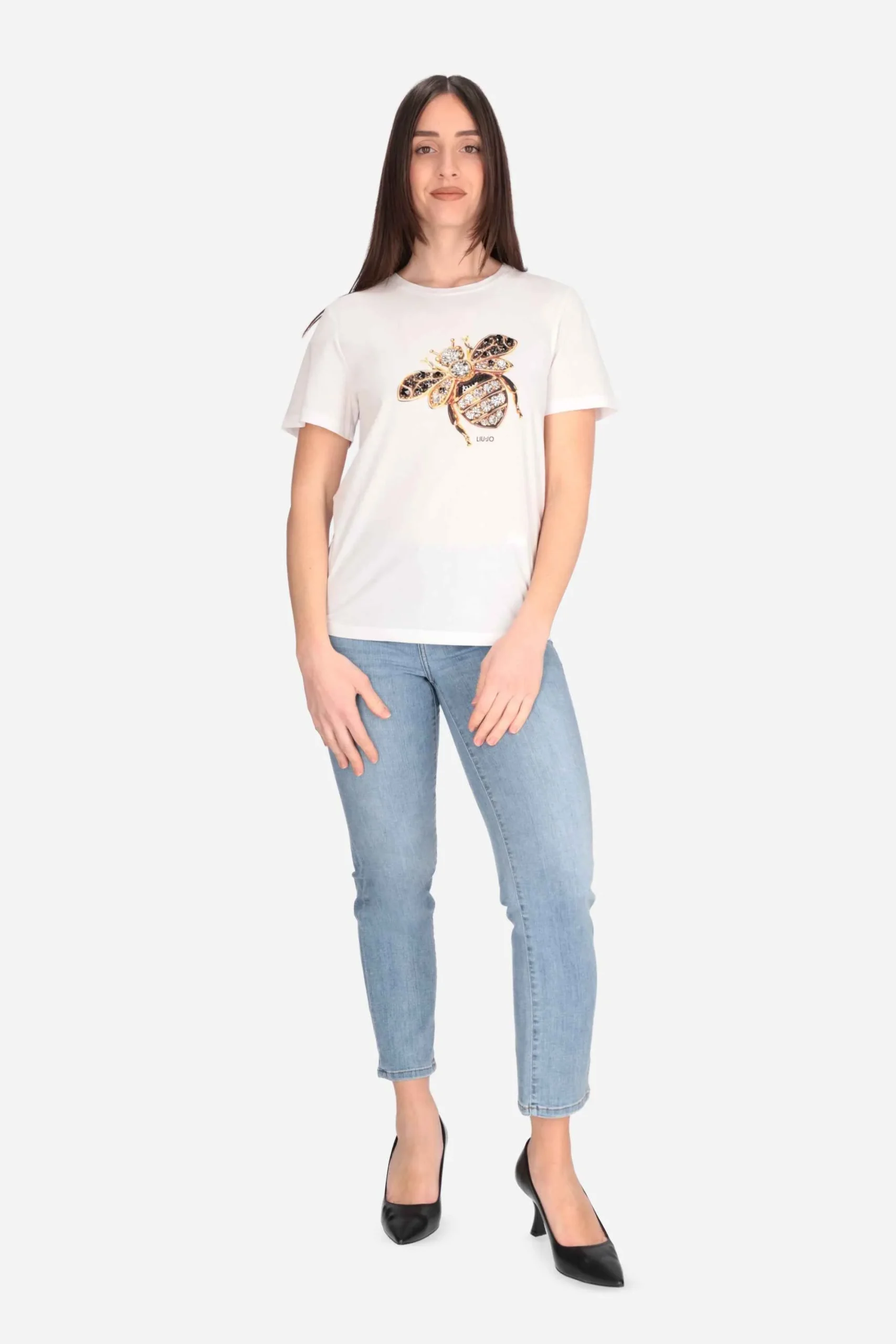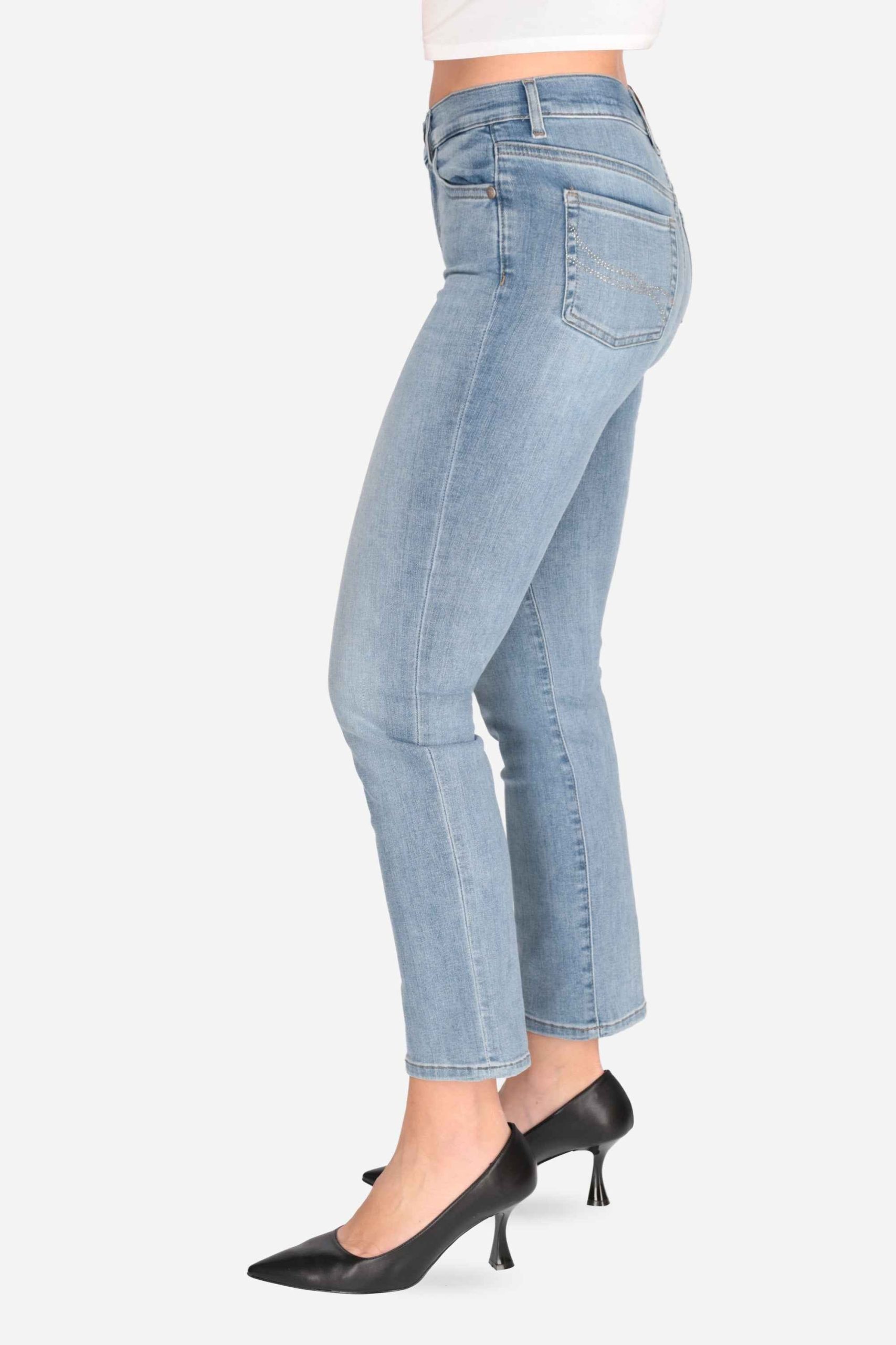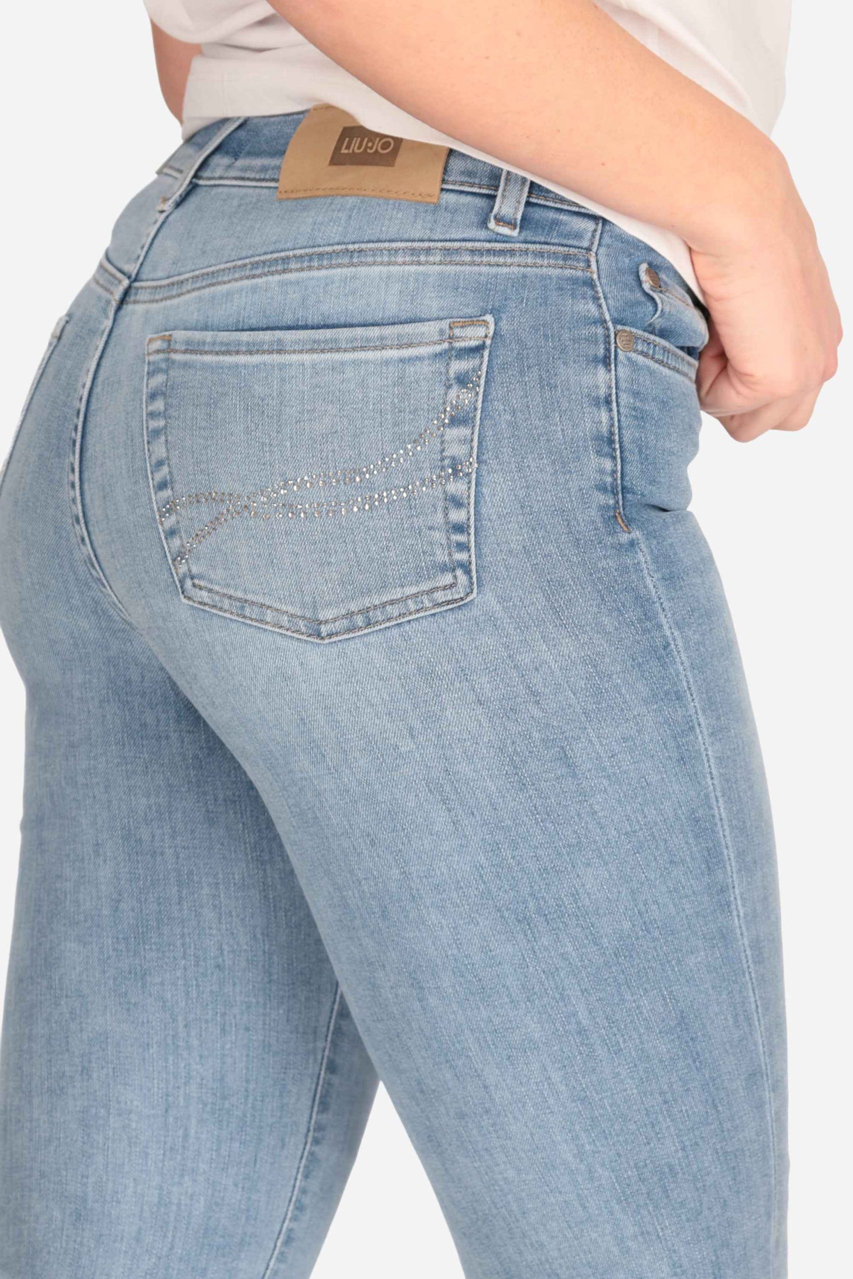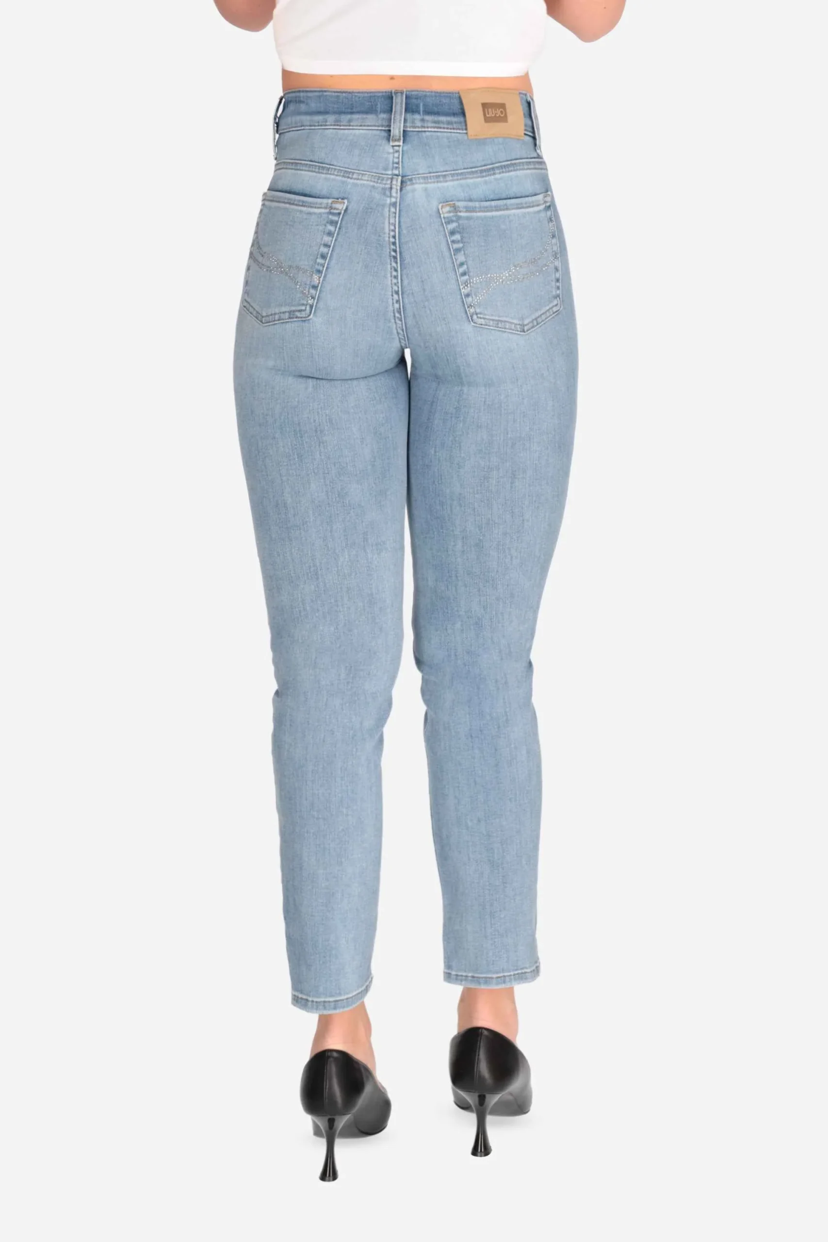 È un modello cinque tasche, chiusura con bottone e zip, passanti in vita e dettaglio strass sul retro.