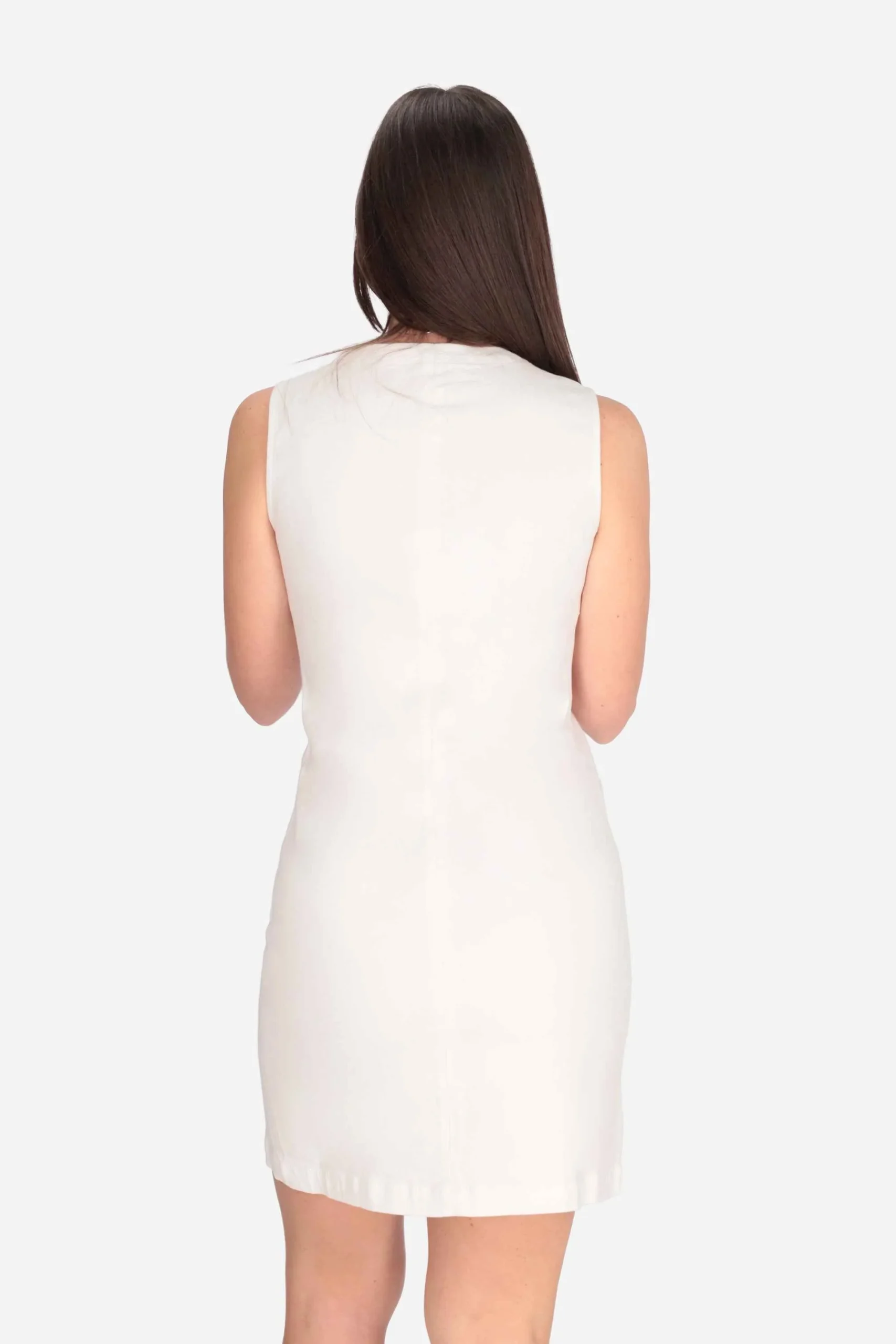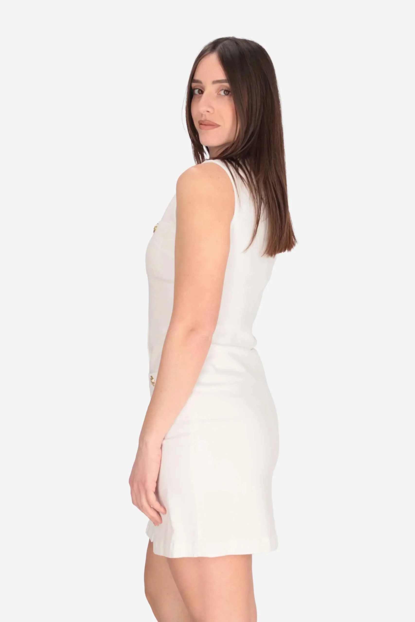 L’abito è realizzato in denim di cotone stretch.