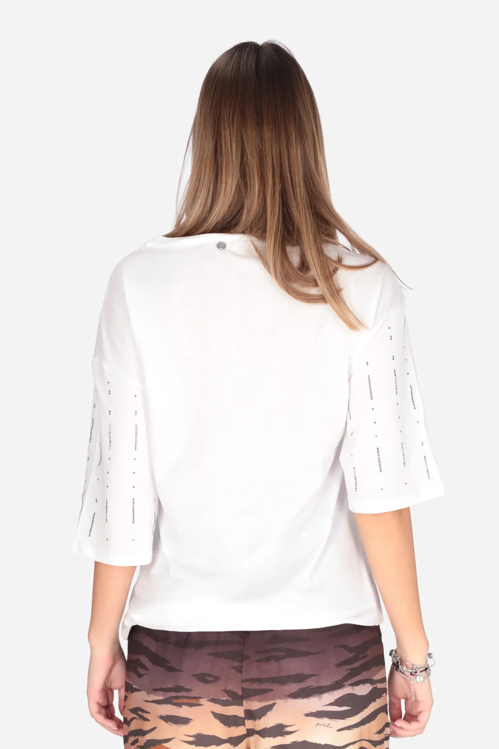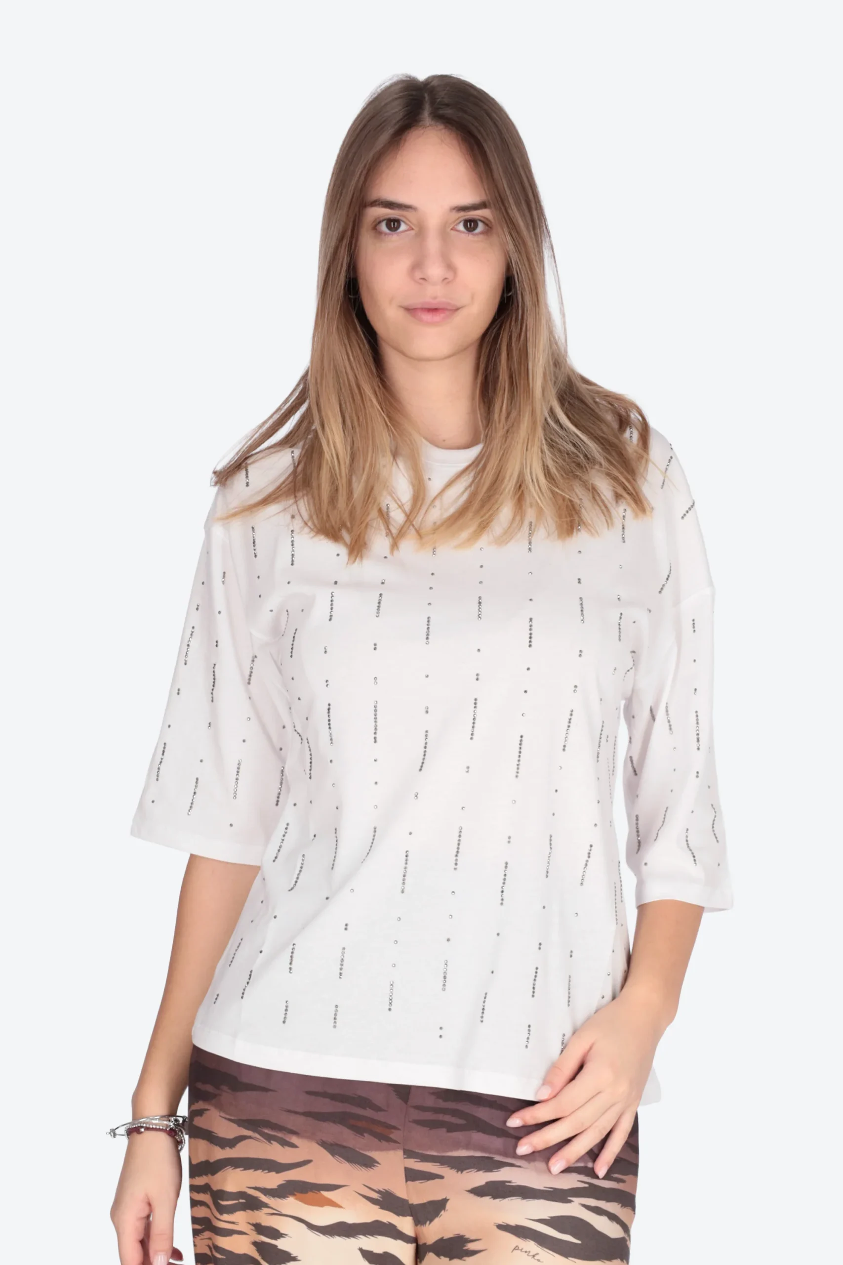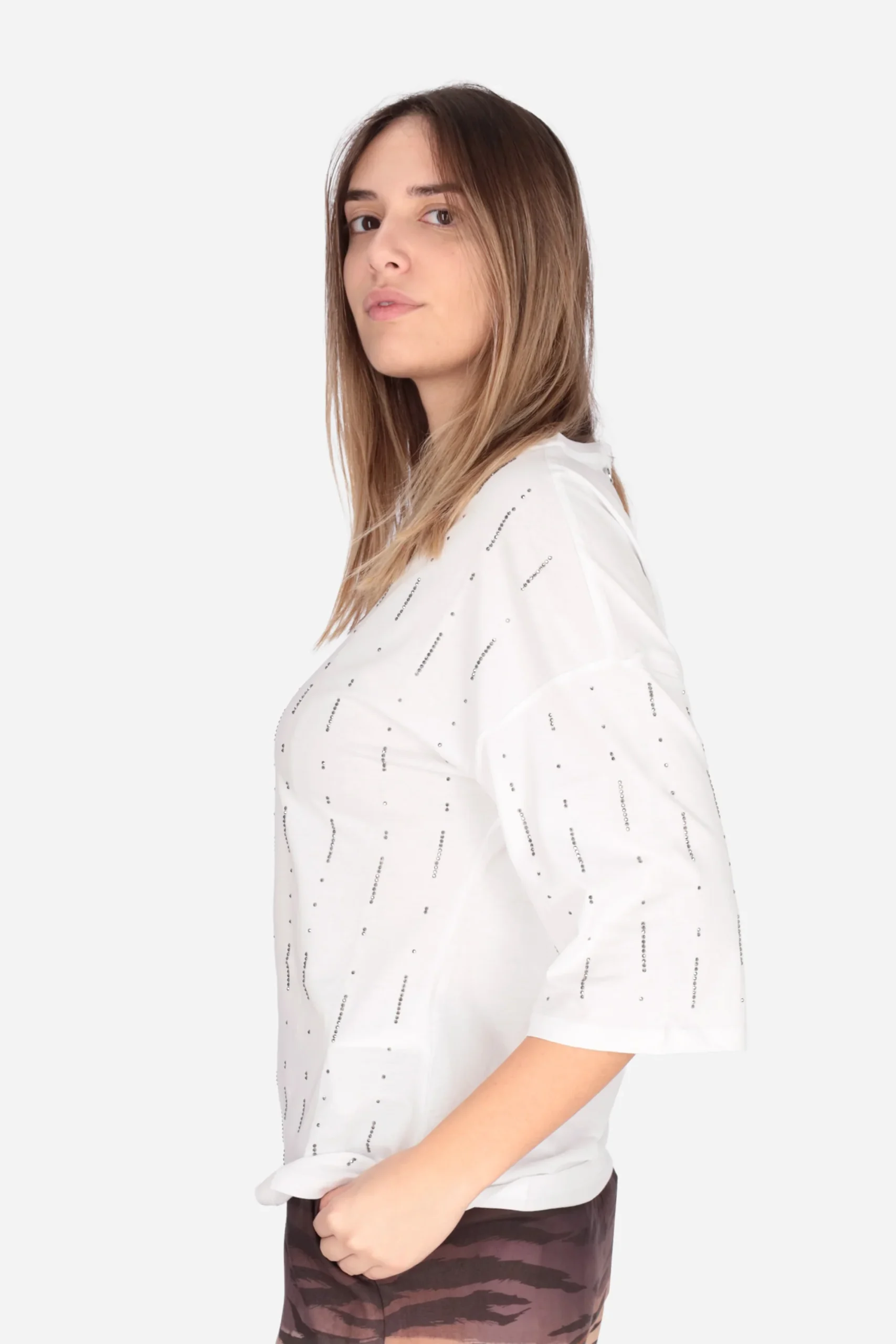 La T-shirt è realizzata in cotone con applicazione di strass sul davanti.