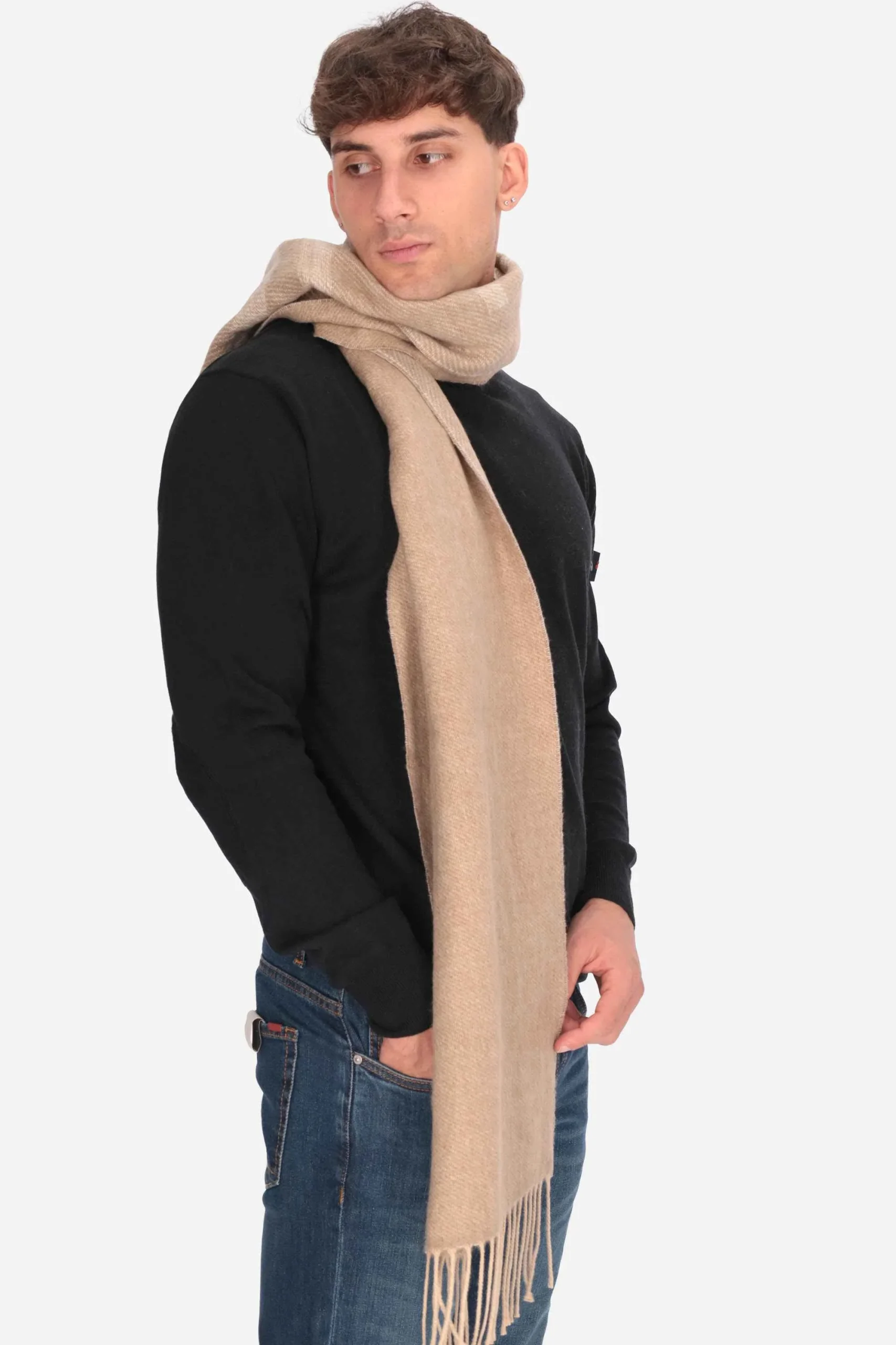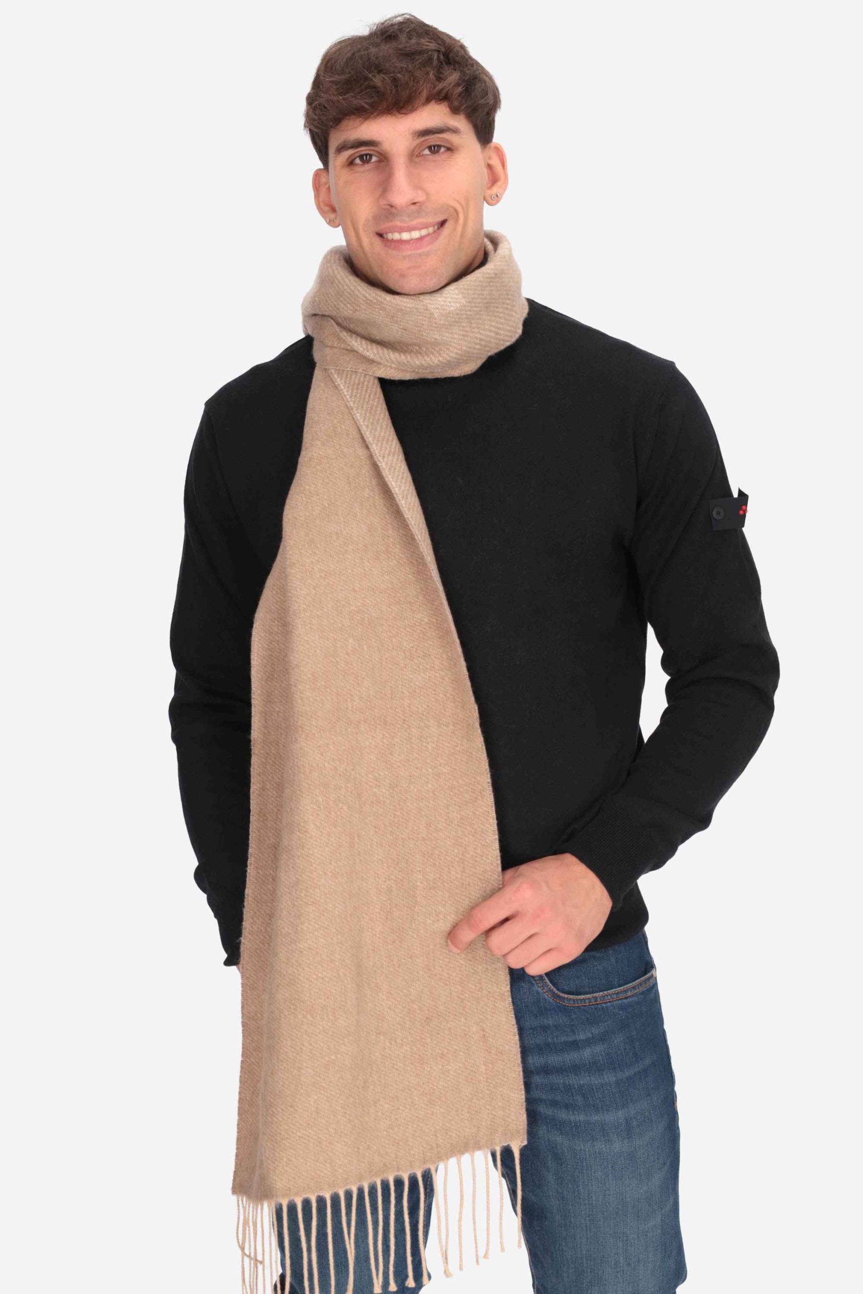 La stola è realizzata in maglia di misto cotone, con logo jacquard e bordi con frange.