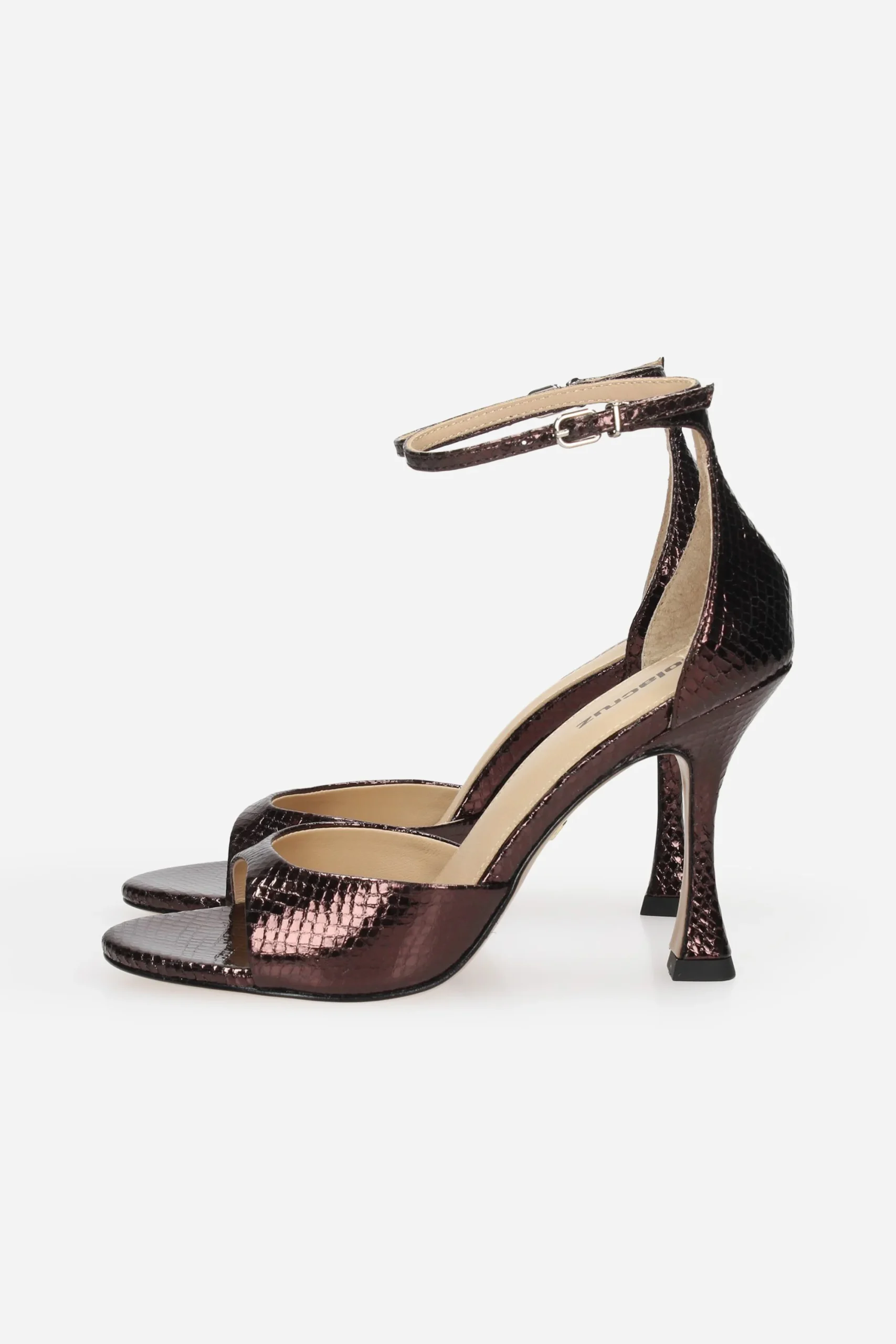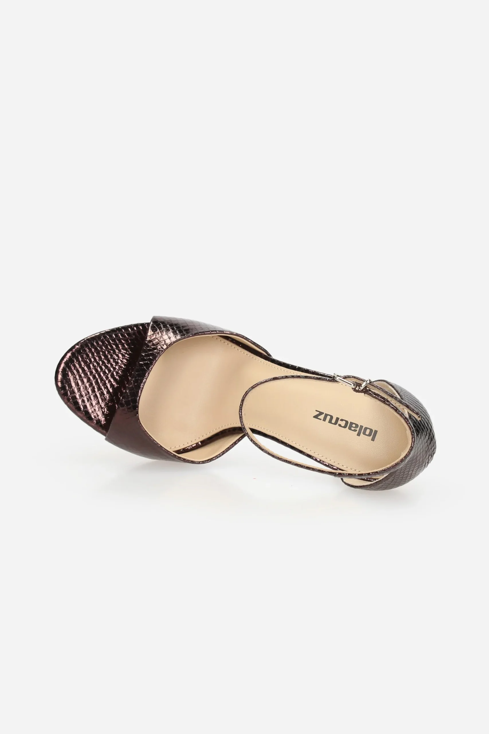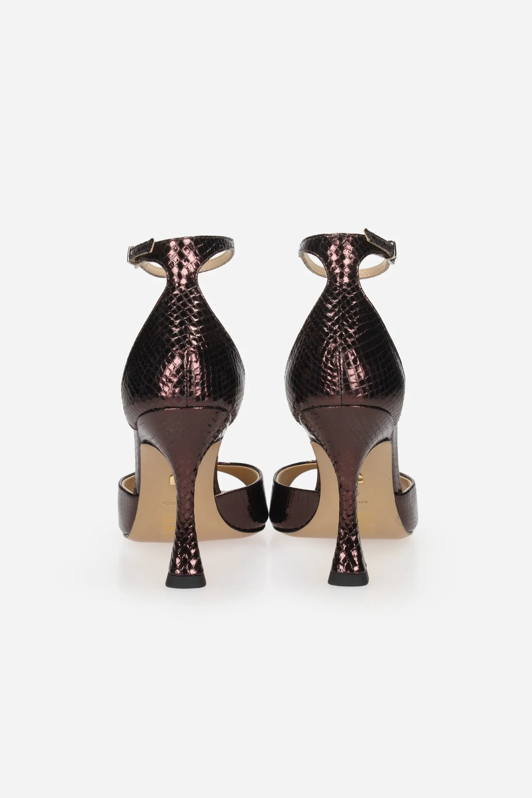 Presenta fascia sul davanti e cinturino alla caviglia con fibbia regolabile, plantare in pelle.