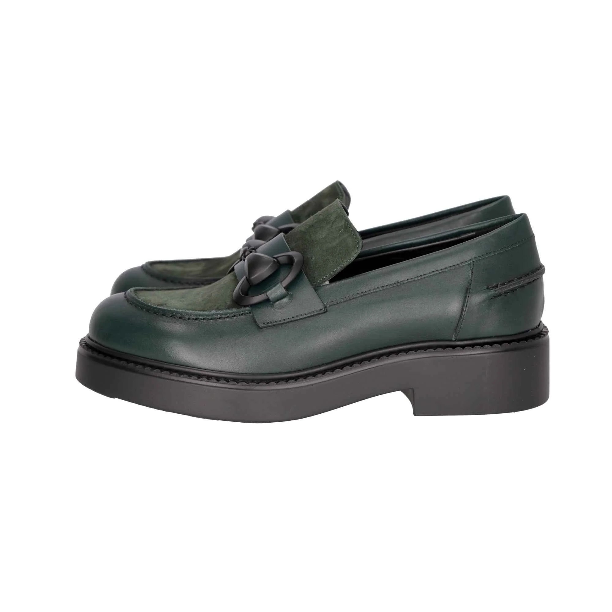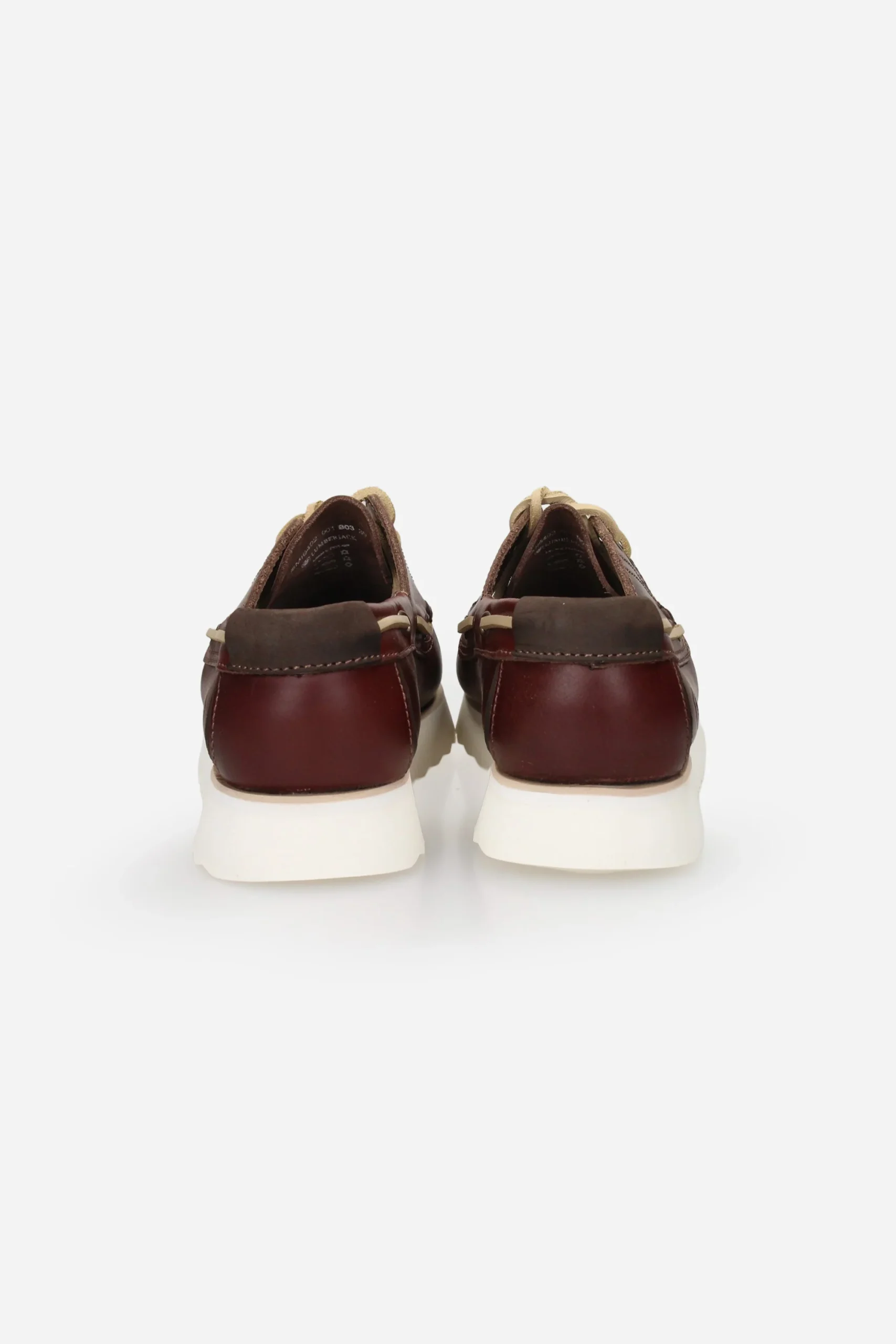 Presenta cucitura a vista e occhielli in metallo sul davanti con lacci in pelle, plantare in pelle.