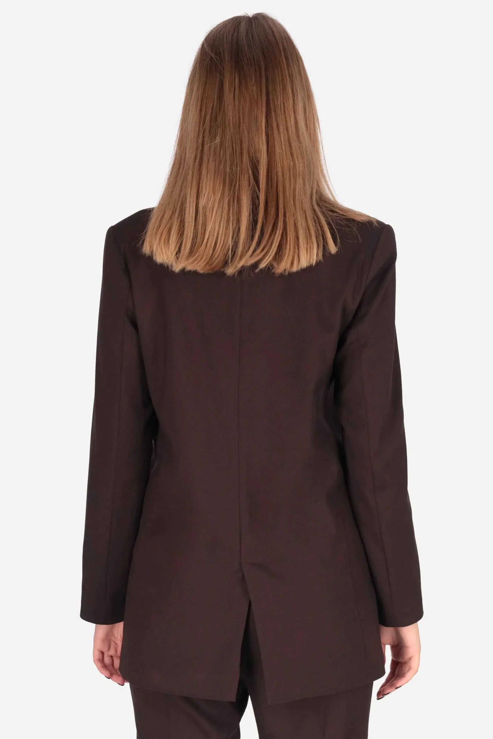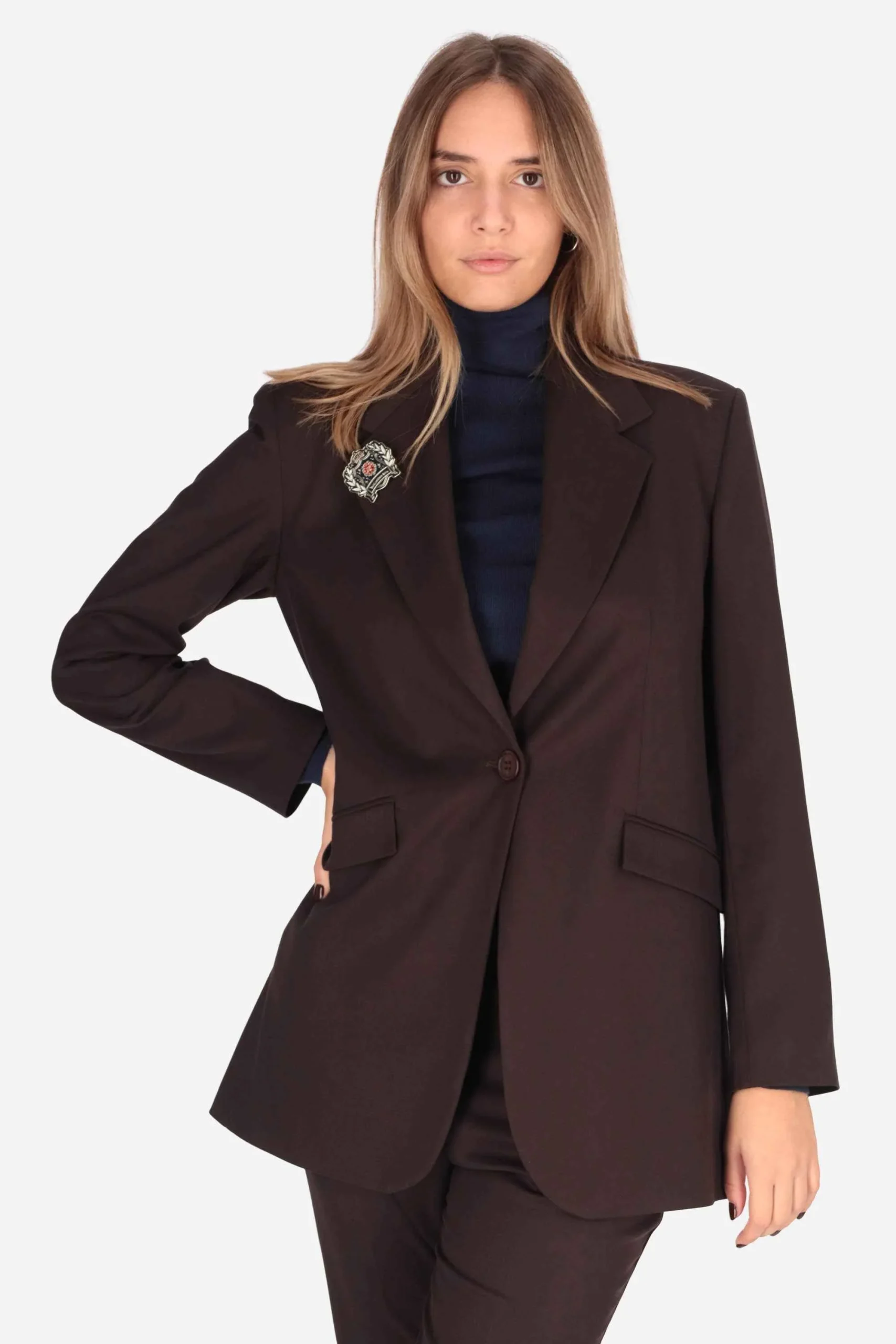 La giacca è realizzata in viscosa, nylon ed elastan, con spille rimovibili.