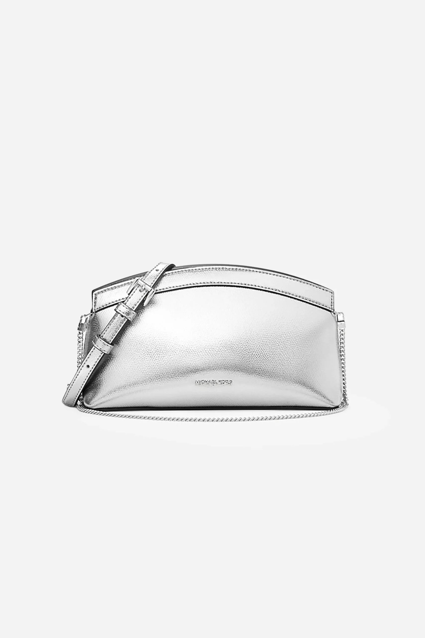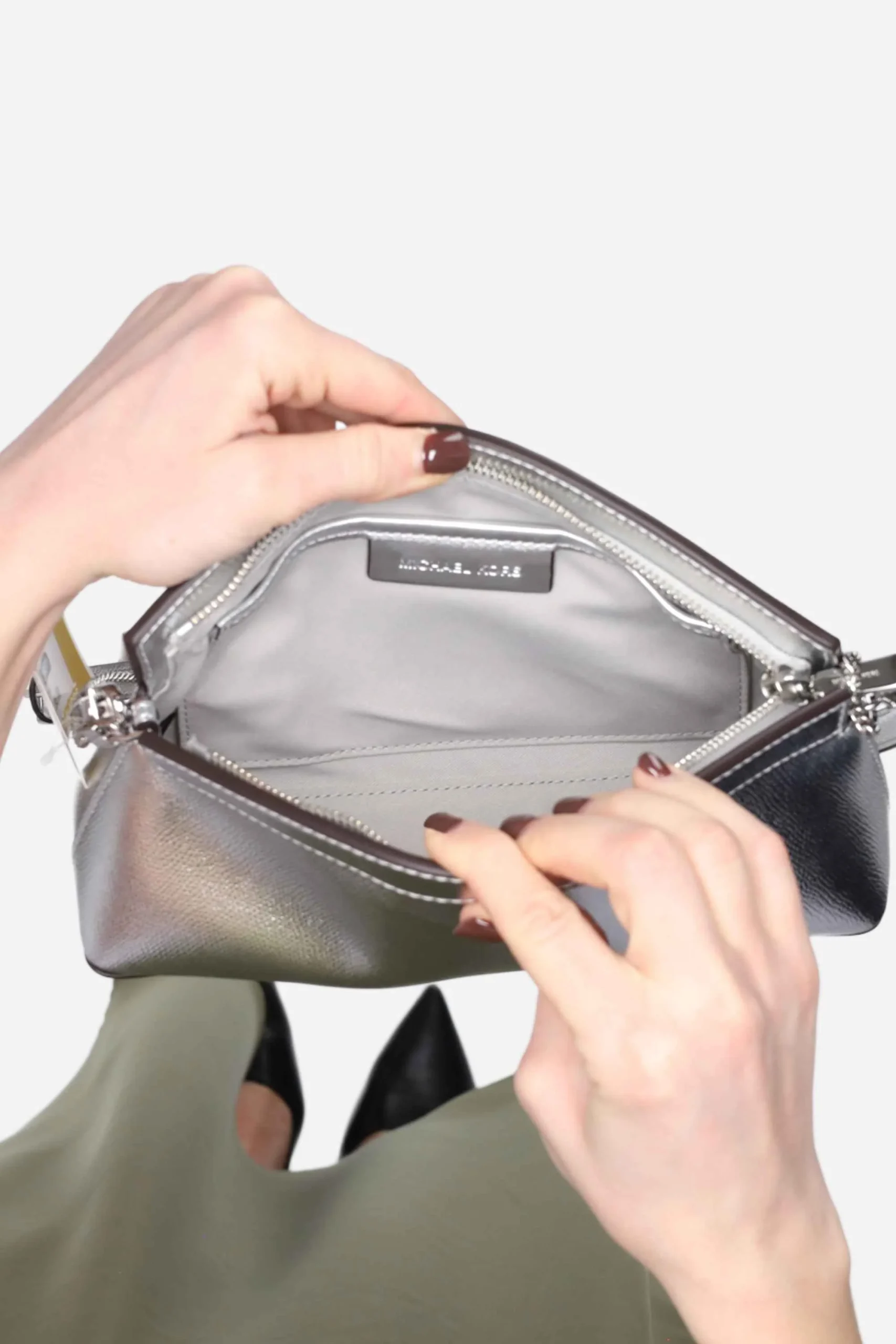 La clutch Athena è realizzata in pelle metallizzata con logo sul davanti.