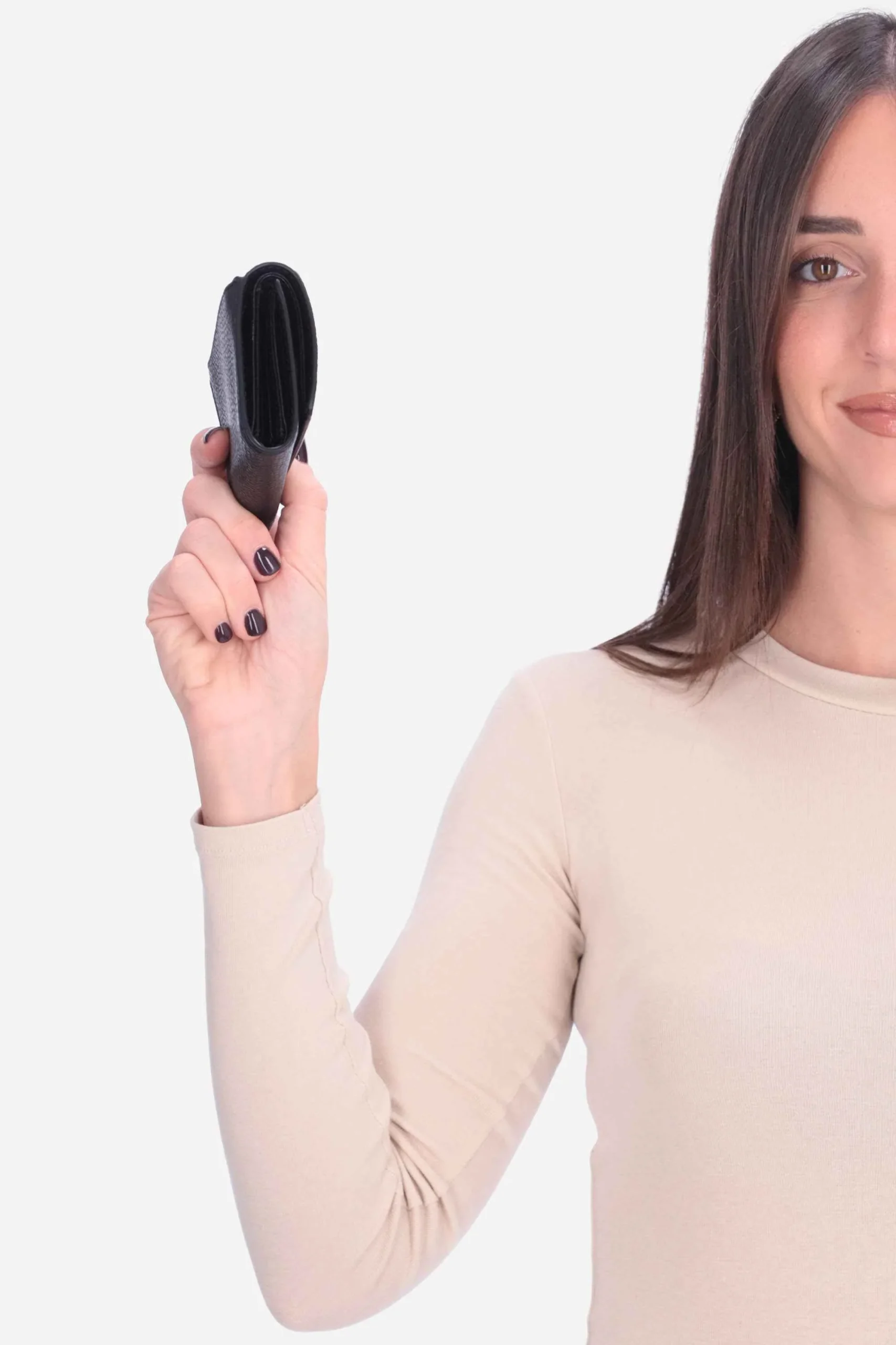Presenta chiusura con bottone a scatto, design sottile e compatto, numerosi scomparti per carte di credito e una tasca con zip sul retro per le monete.