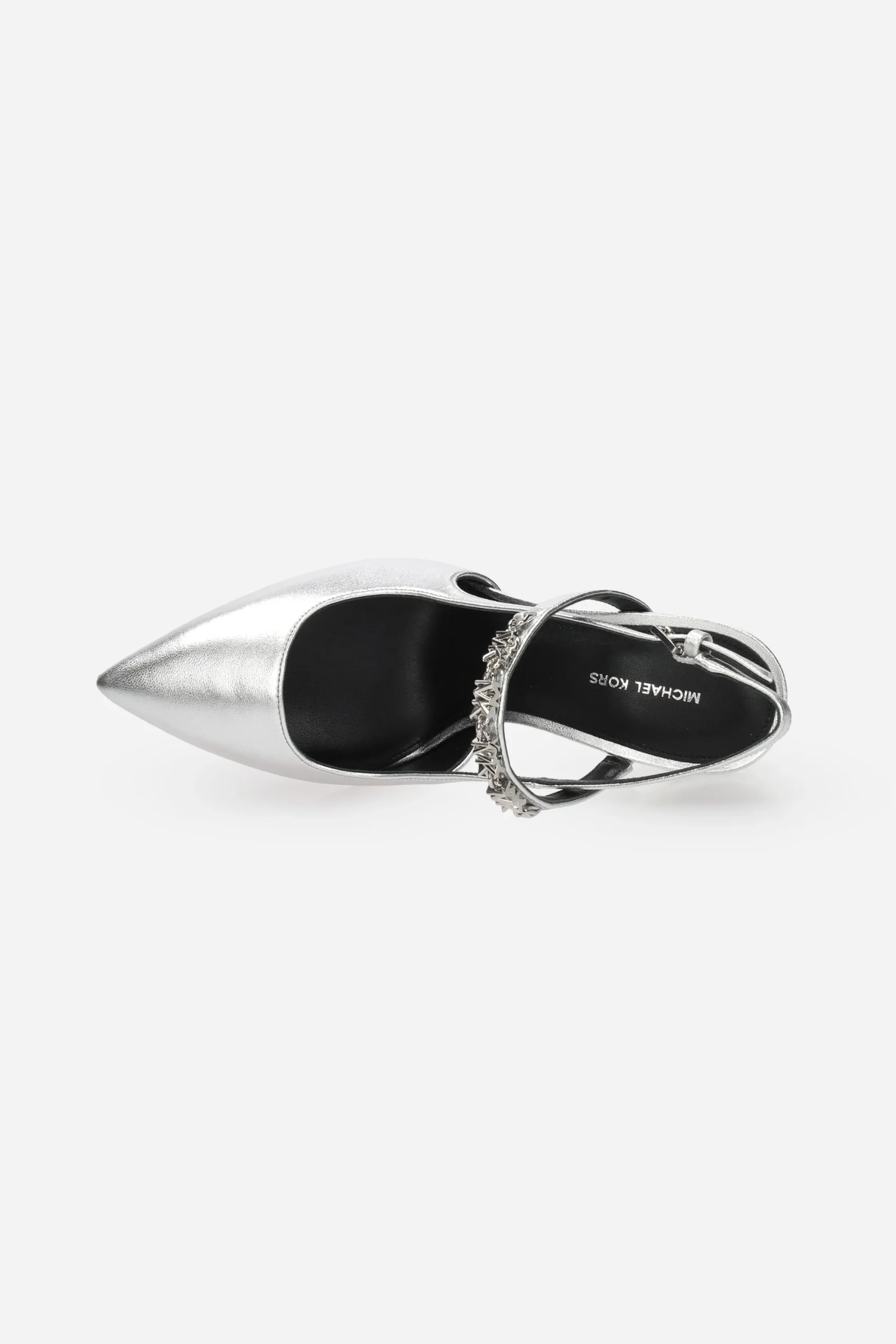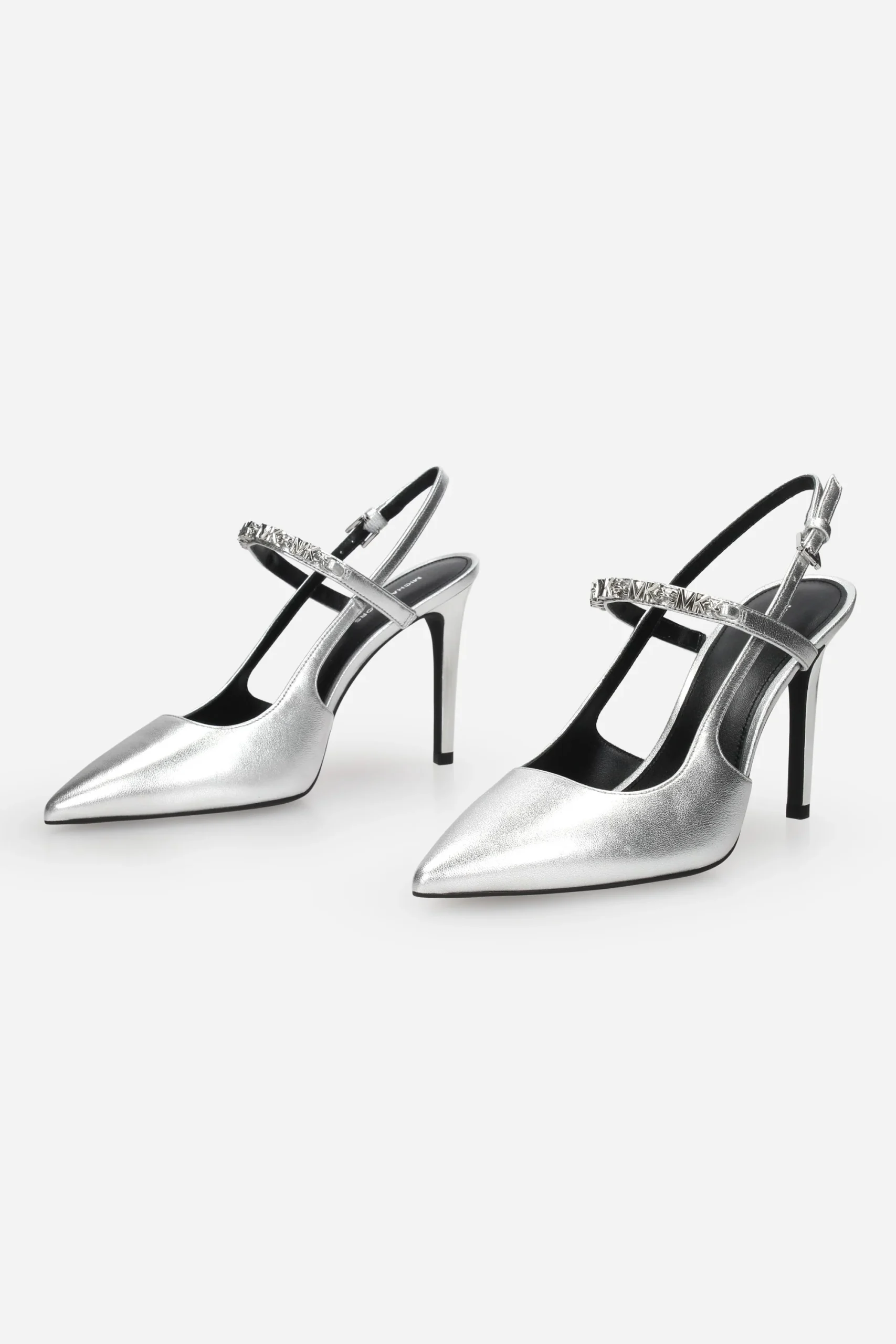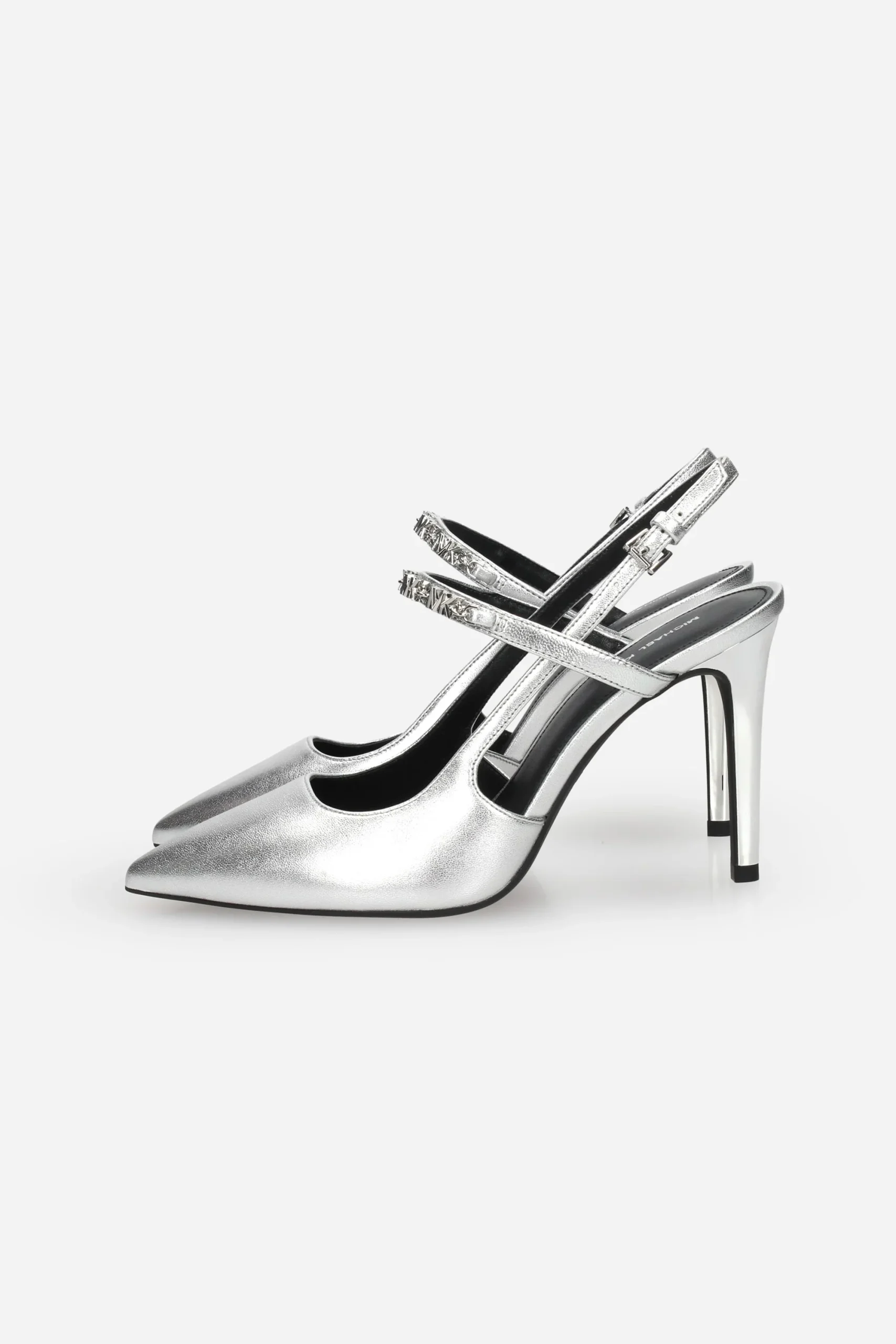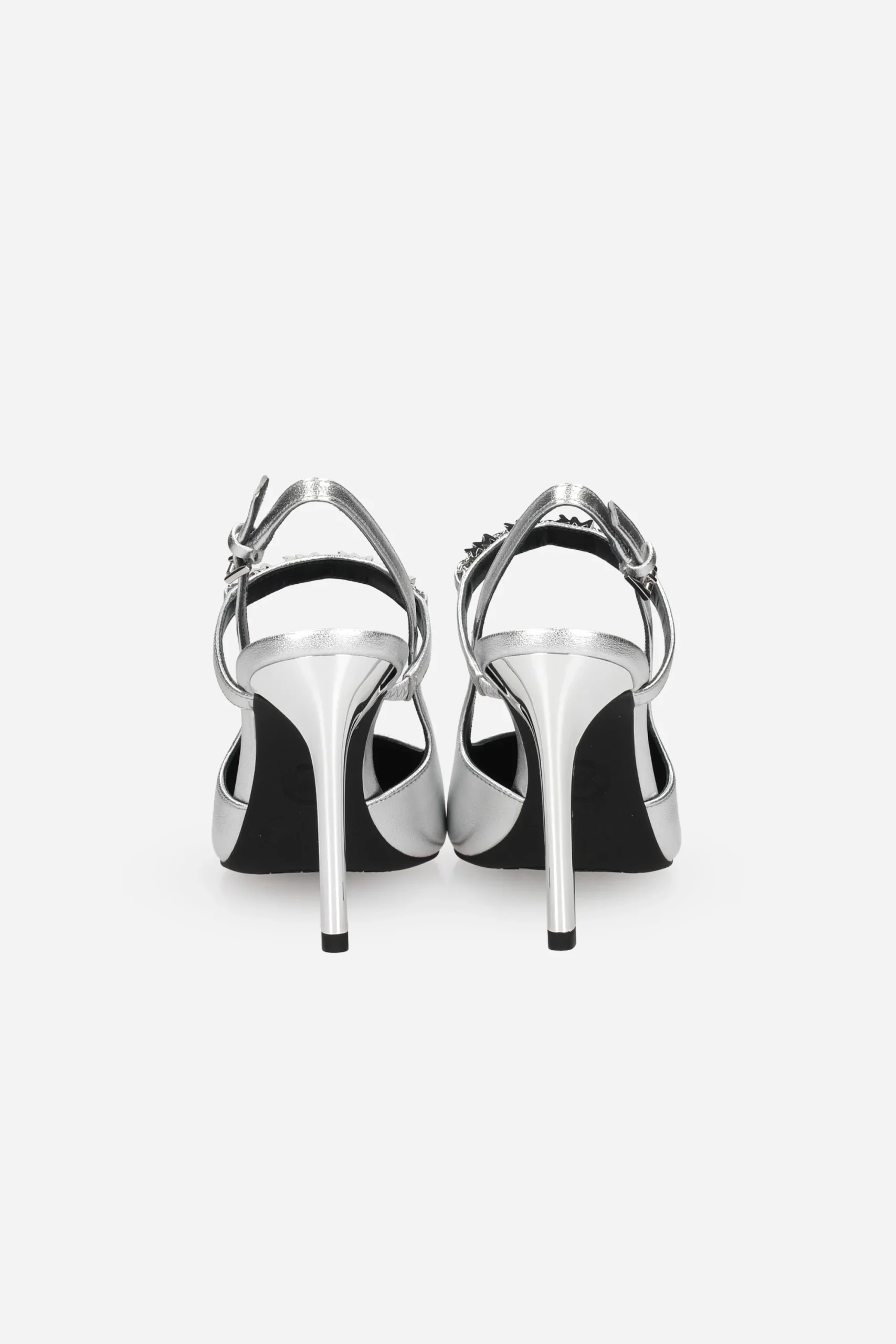 Presenta cinturino con logo sul collo del piede e cinturino al tallone con fibbia regolabile, plantare in pelle.