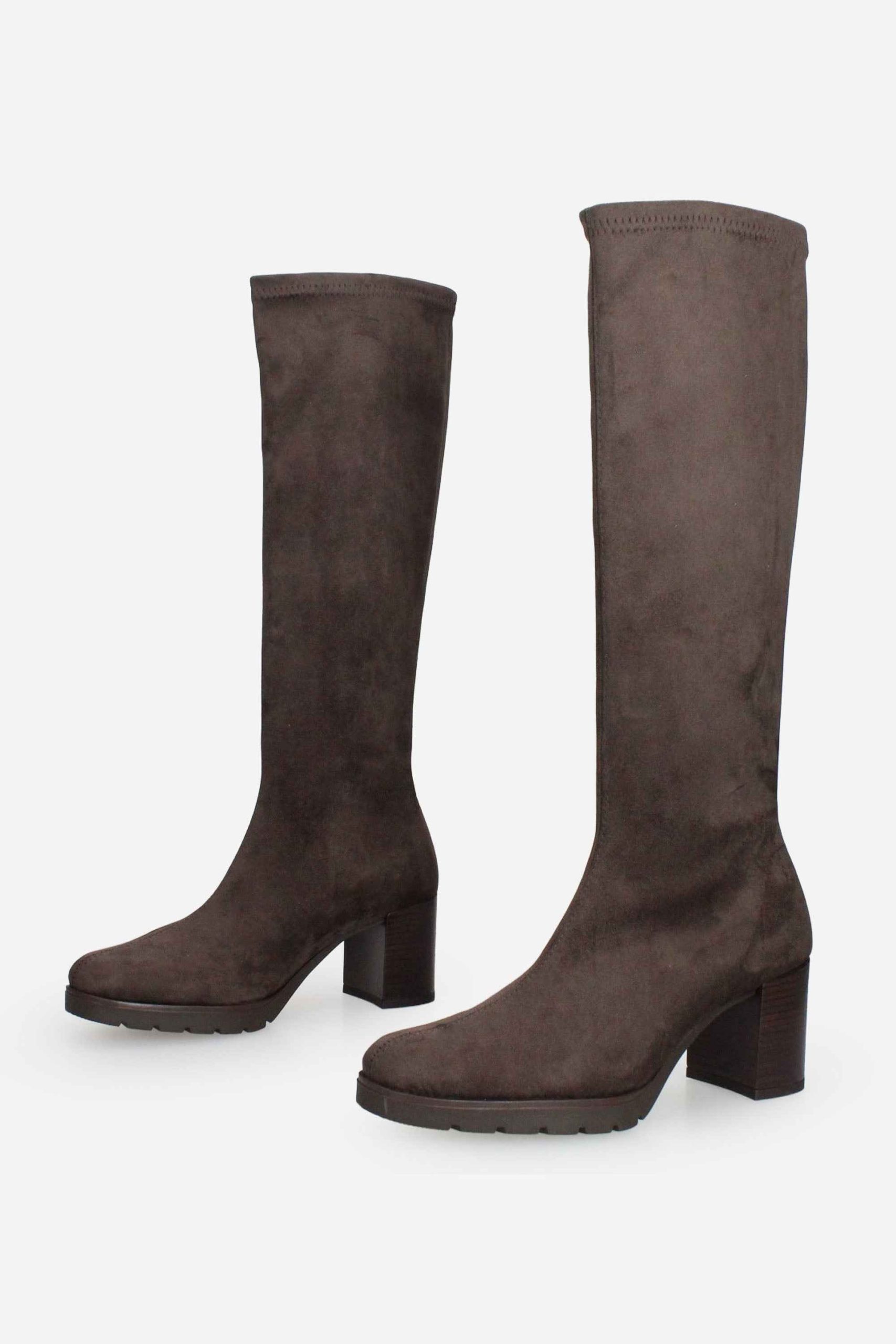 Lo stivale a calzata slip on è realizzato in camoscio elastico vegano idrorepellente.