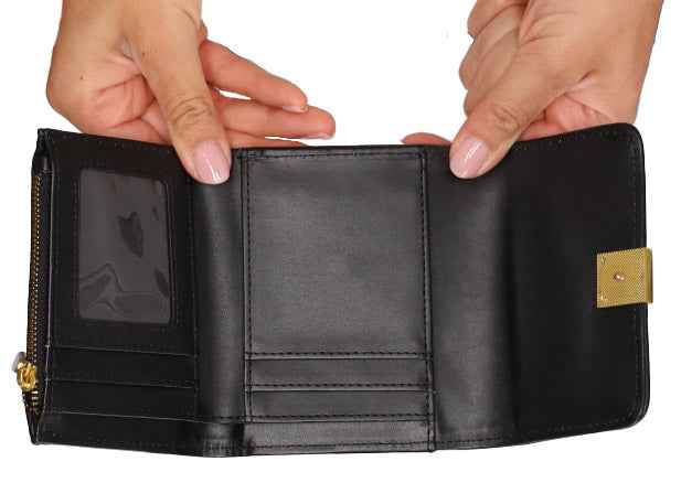 Presenta una chiusura con bottone e scomparti per carte di credito, documenti, banconote e una tasca con zip per monete.