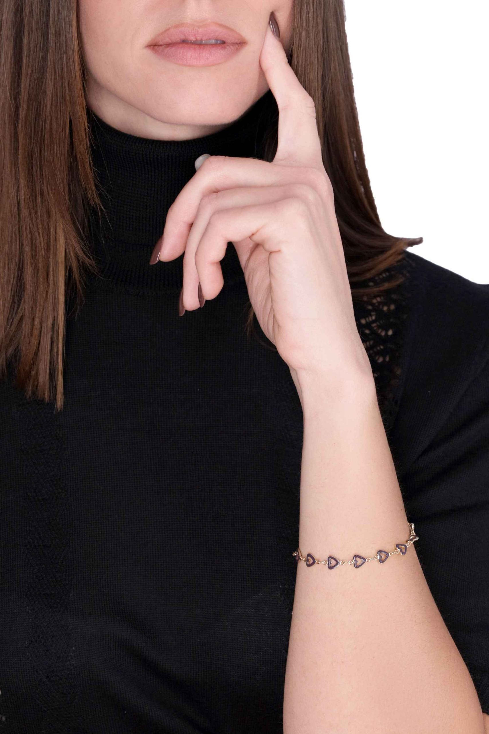 Il bracciale è realizzato in ottone con cuori smaltati e chiusura con moschettone regolabile.