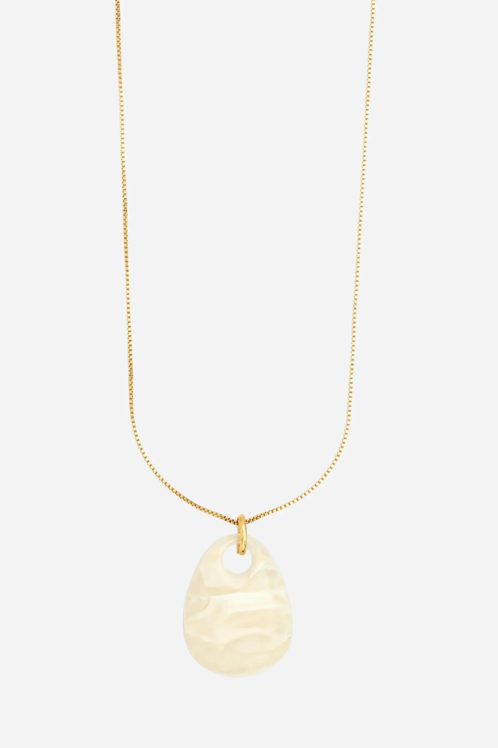 La collana è realizzata in resina e acciaio inossidabile, con ciondolo a goccia effetto marmo e una sottile catena dorata.