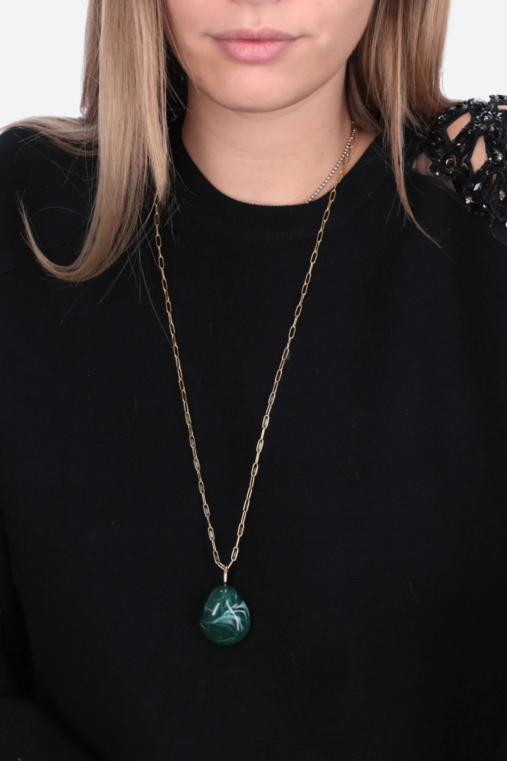 La collana è realizzata in metallo dorato con catena sottile e pendente in pietra effetto naturale dalle tonalità scure.
