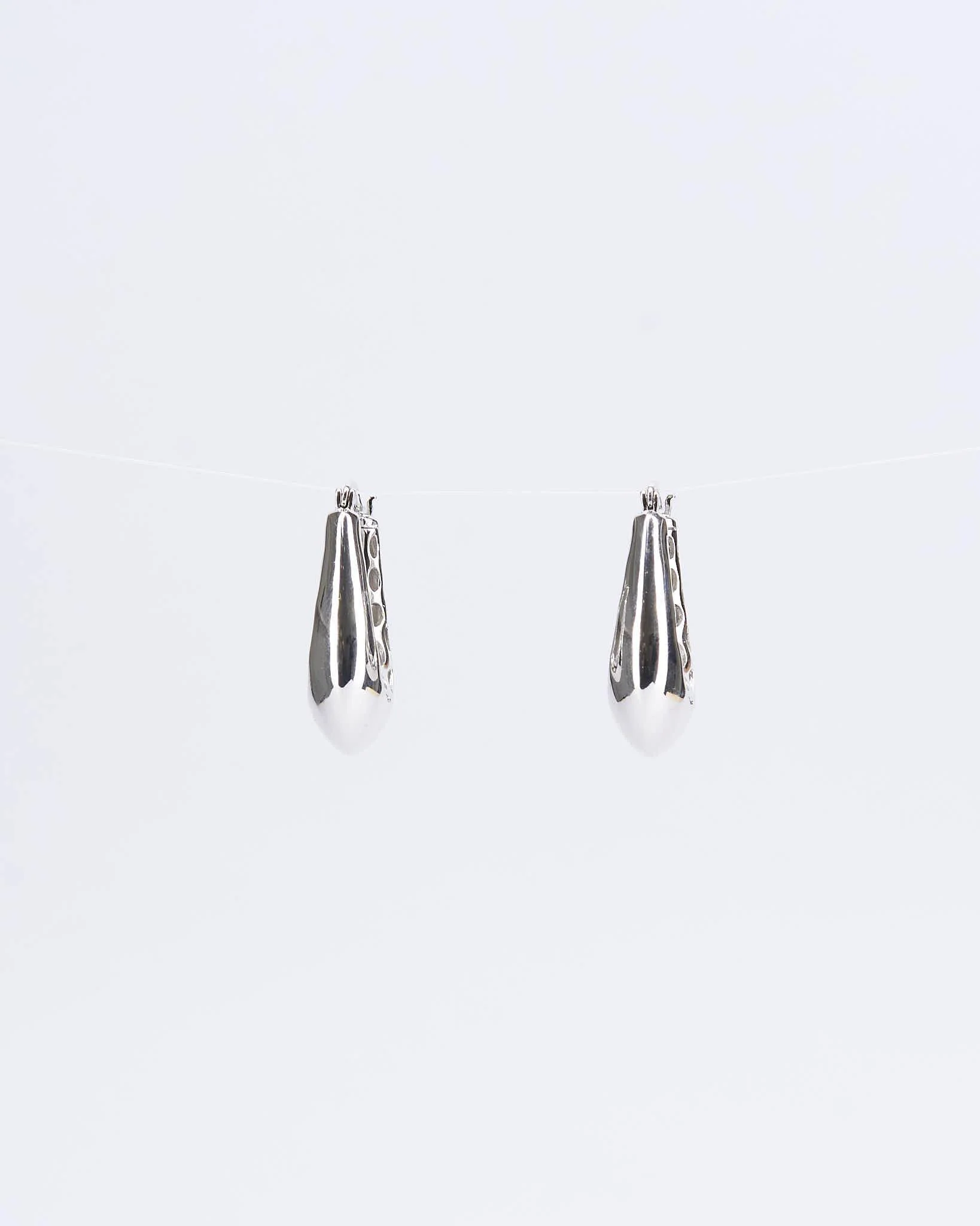 Gli orecchini pendenti sono composti con design geometrico bicolore oro e argento, texture martellata e finitura lucida.