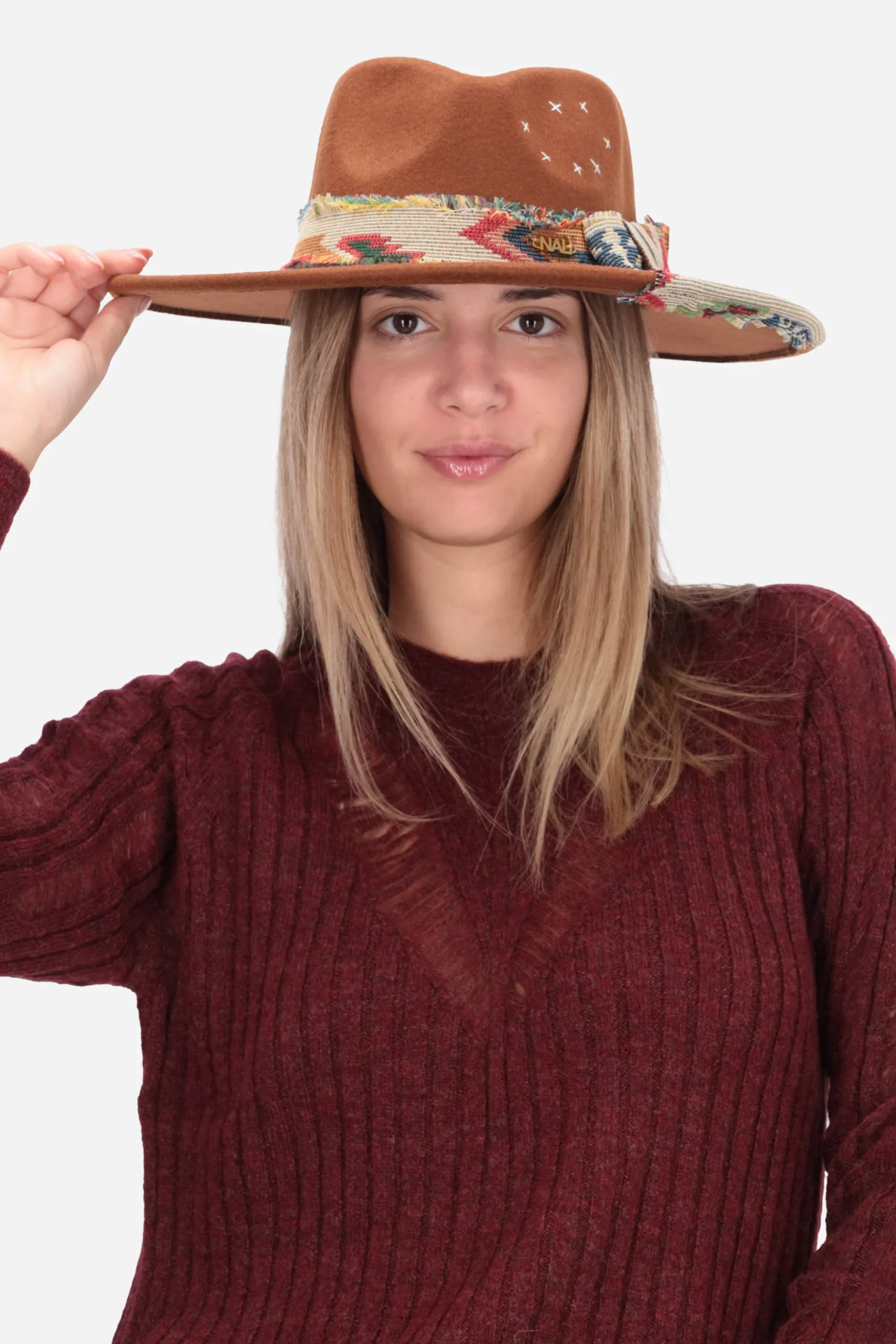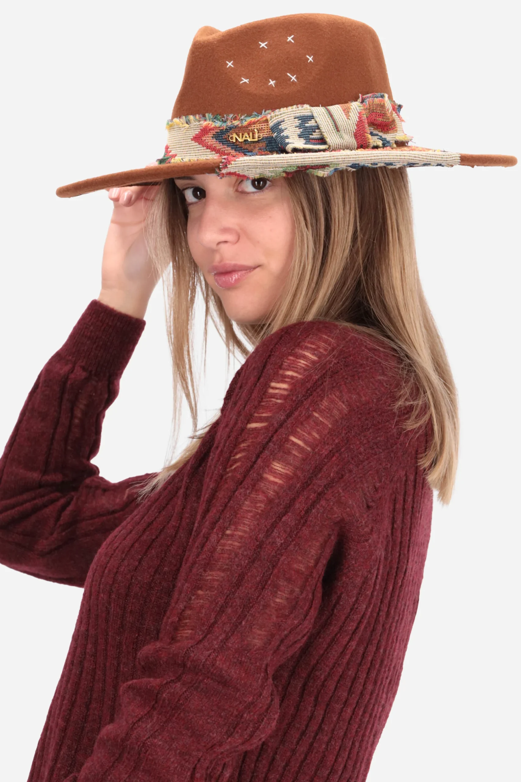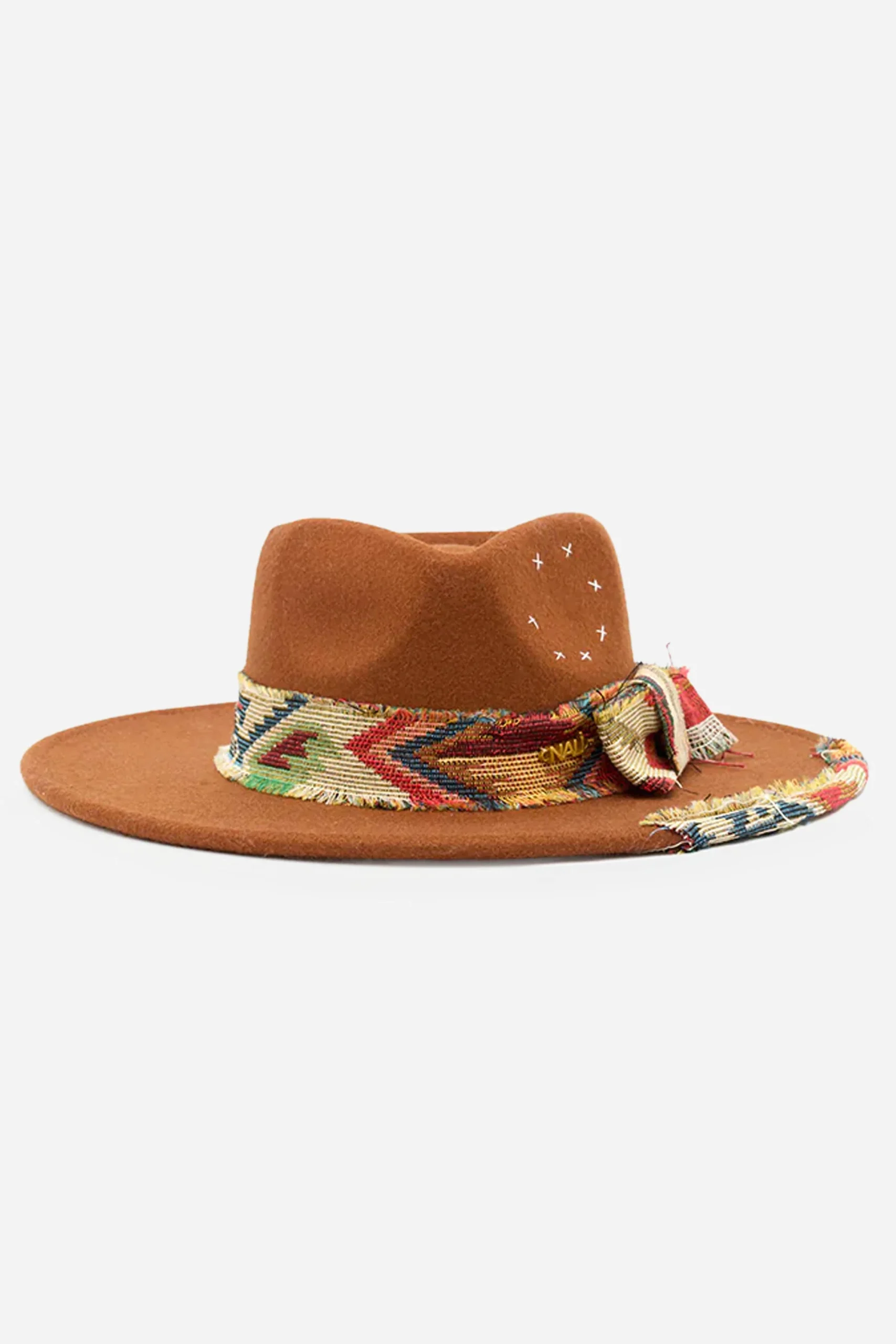 Il cappello è realizzato in feltro, con fascia decorativa e dettagli ricamati.
