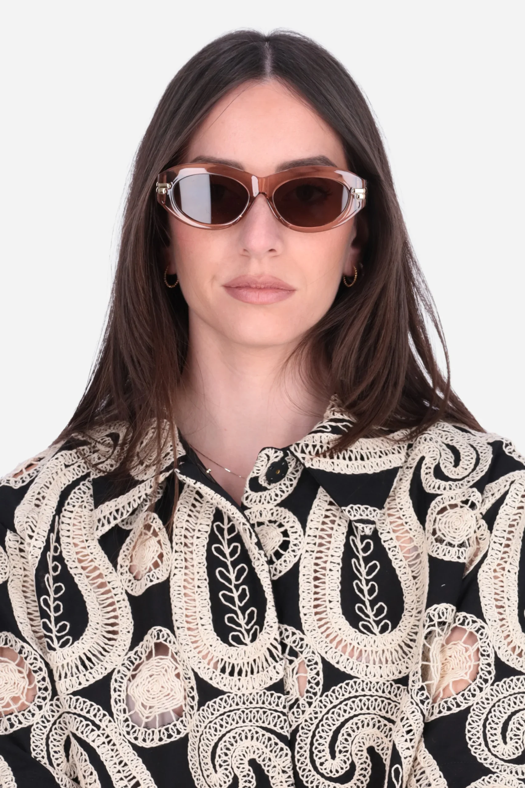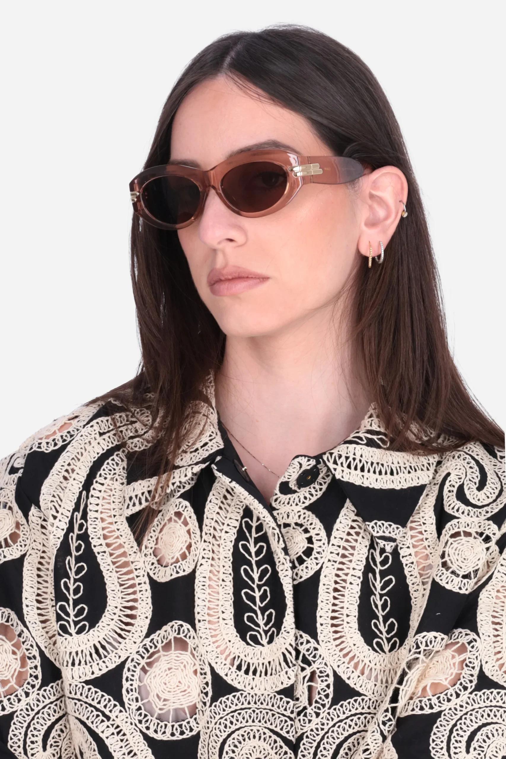 Gli occhiali da sole presentano una montatura ovale, con lenti scure che offrono protezione.